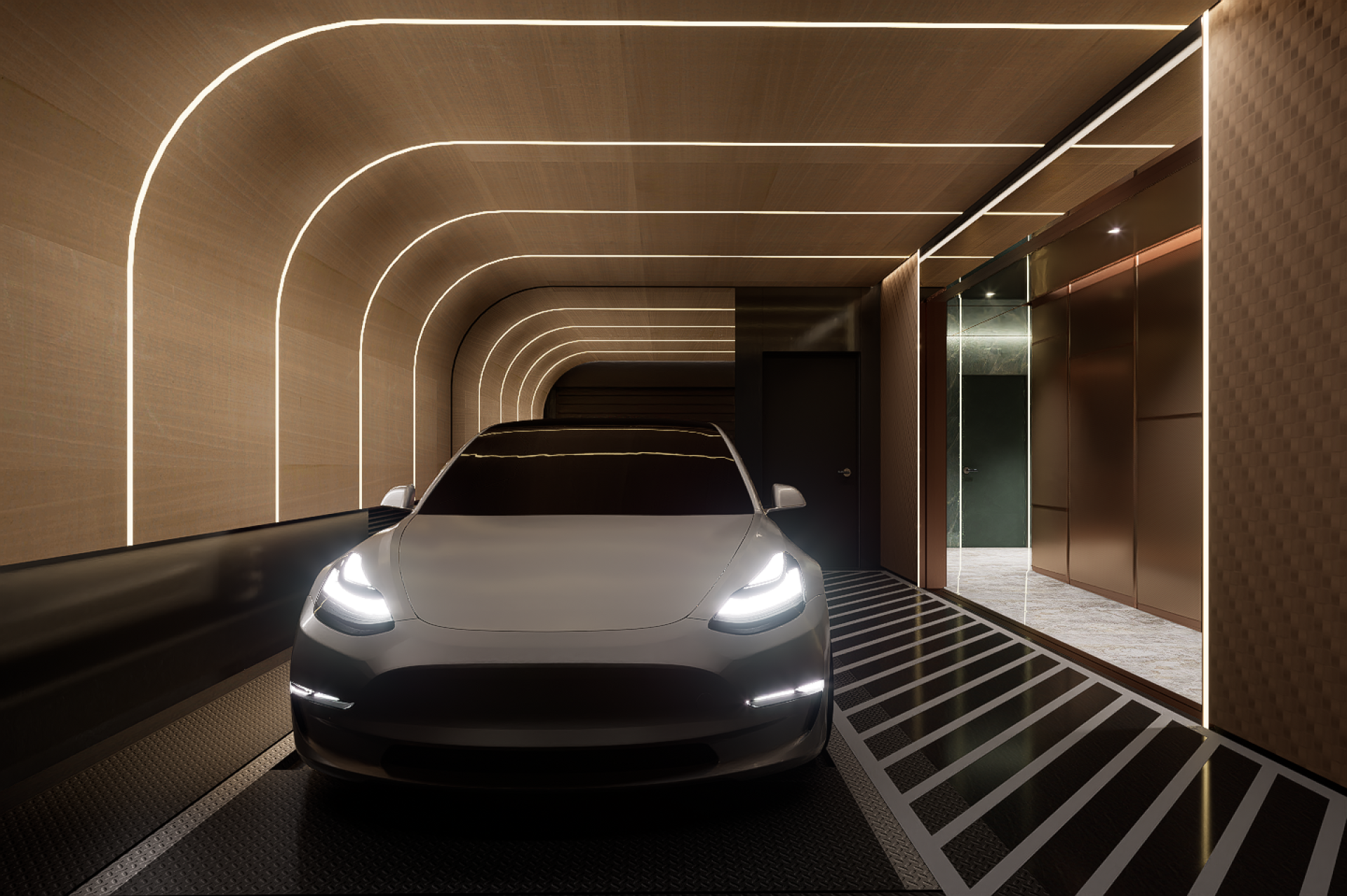 Inside, the space begins with the first-floor hall, which establishes a welcoming atmosphere and a steady tone through green stone patterns, metal accents, and warm colors. The rooftop infinity swimming pool, paired with a green platform, creates a private oasis amidst the city sky. The 353m² skip-floor suite features nearly six-meter-high curtain windows offering expansive views, with two living rooms connecting to an outdoor terrace that showcase generous living space. Beneath the building, a three-ton-capacity intelligent vehicle tower is installed, with parking spots fully equipped for electric vehicle charging, enabling any vehicle to charge while parked.