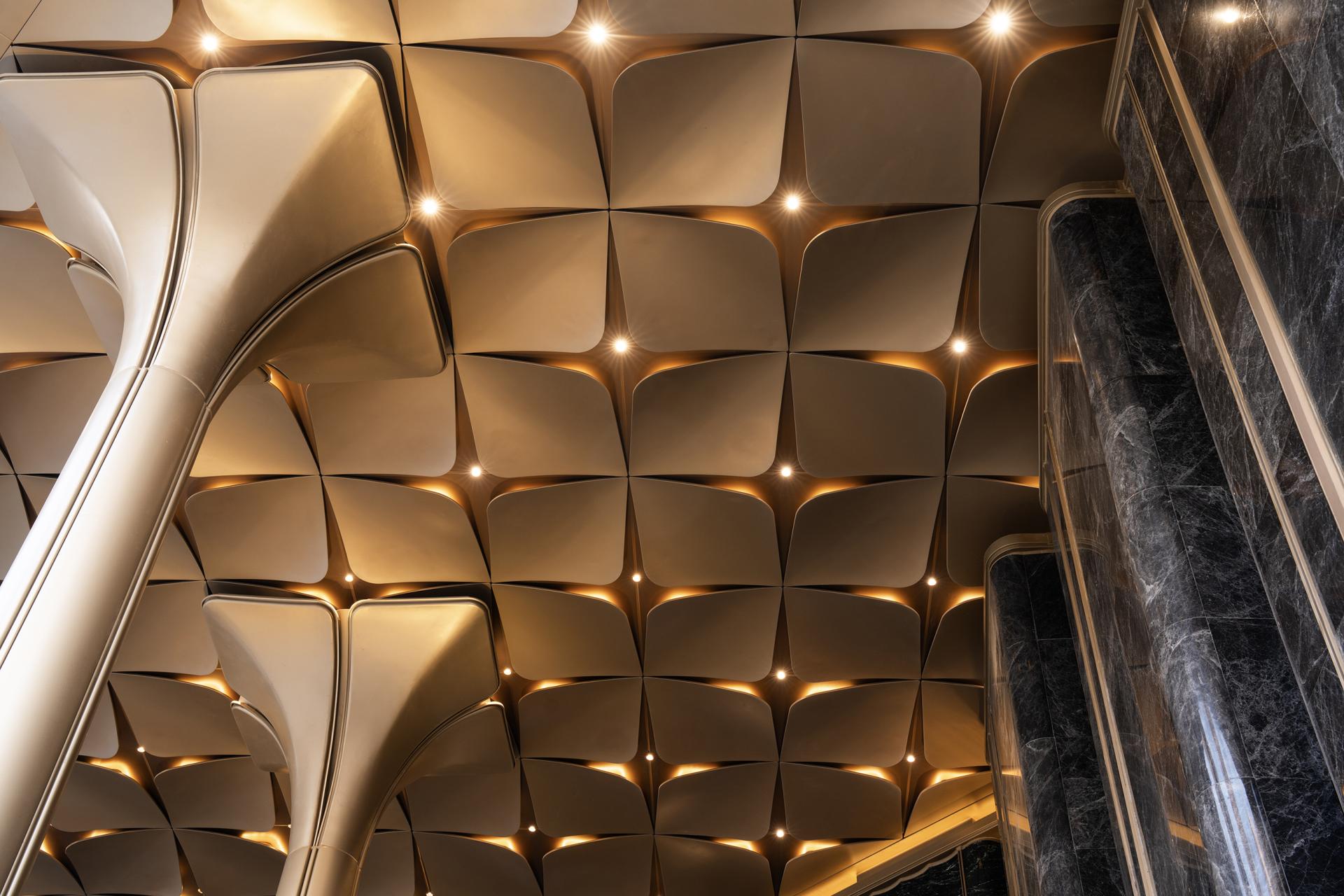 Exquisite craftsmanship and attention to detail are reflected in the selection of materials and techniques: rare Hermès Grey stone and high-end Prada Green luxury stone are adopted, combined with the new grooved surface technology to form a unique texture and quality. This treatment can create a sense of lines on the stone surface, enhancing the three-dimensional effect and visual impact of the stone. The champagne gold petal ceiling undergoes multiple calibrations, high-temperature shaping, and traditional gilding processes for each petal, ultimately presenting the aesthetic feeling of three-dimensional petals.