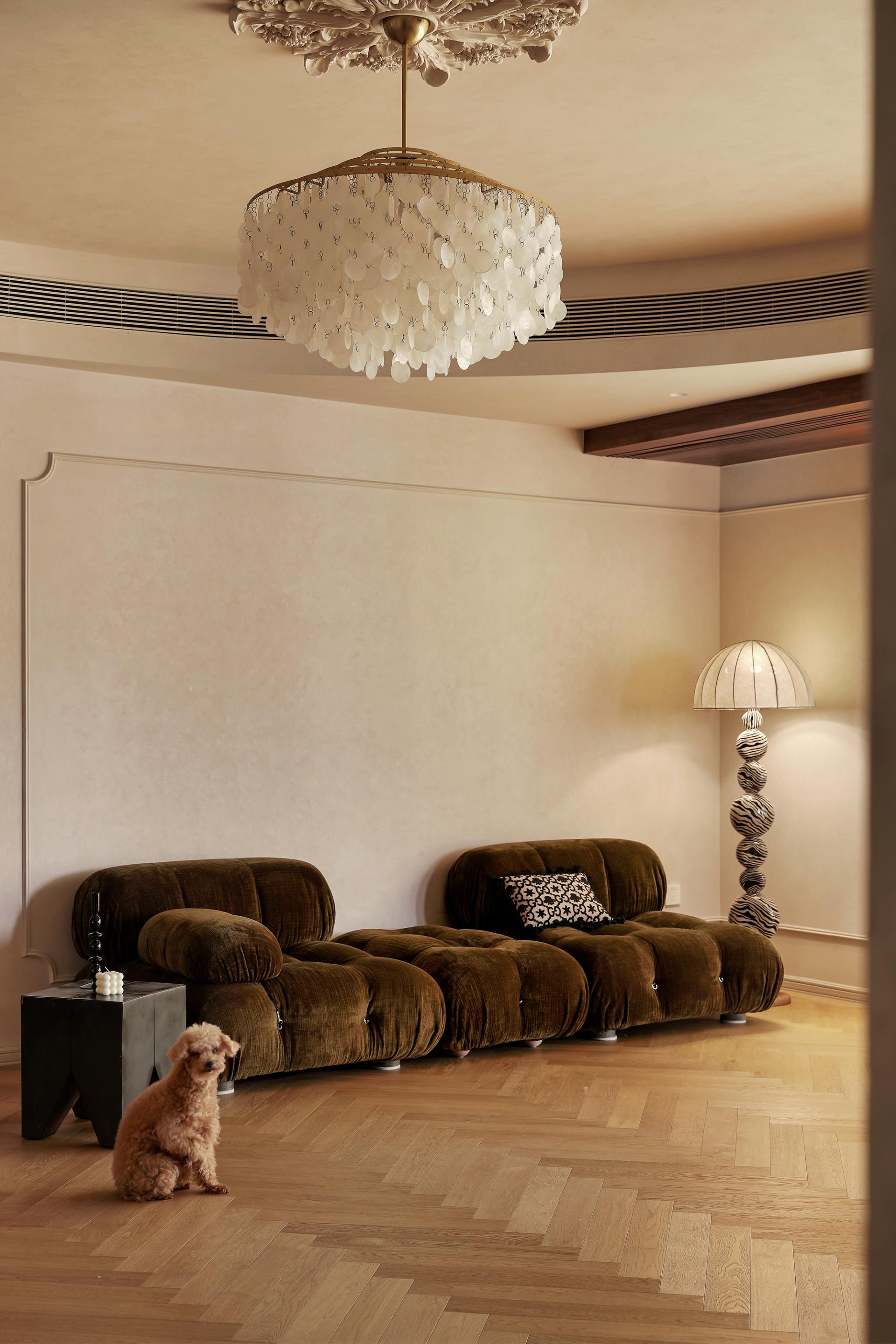 3.Time-Vessel Craftsmanship Fusion: Space becomes a vessel for temporal traces. The delicate, imperfect textures of hand-troweled French plaster contrast sharply with the sleek precision of modern materials (e.g., marble, lacquer), visually manifesting the "time-eroded" metaphor. Curated furnishings (e.g., hand-painted floor lamps, shell chandeliers) transcend stylistic labels.
