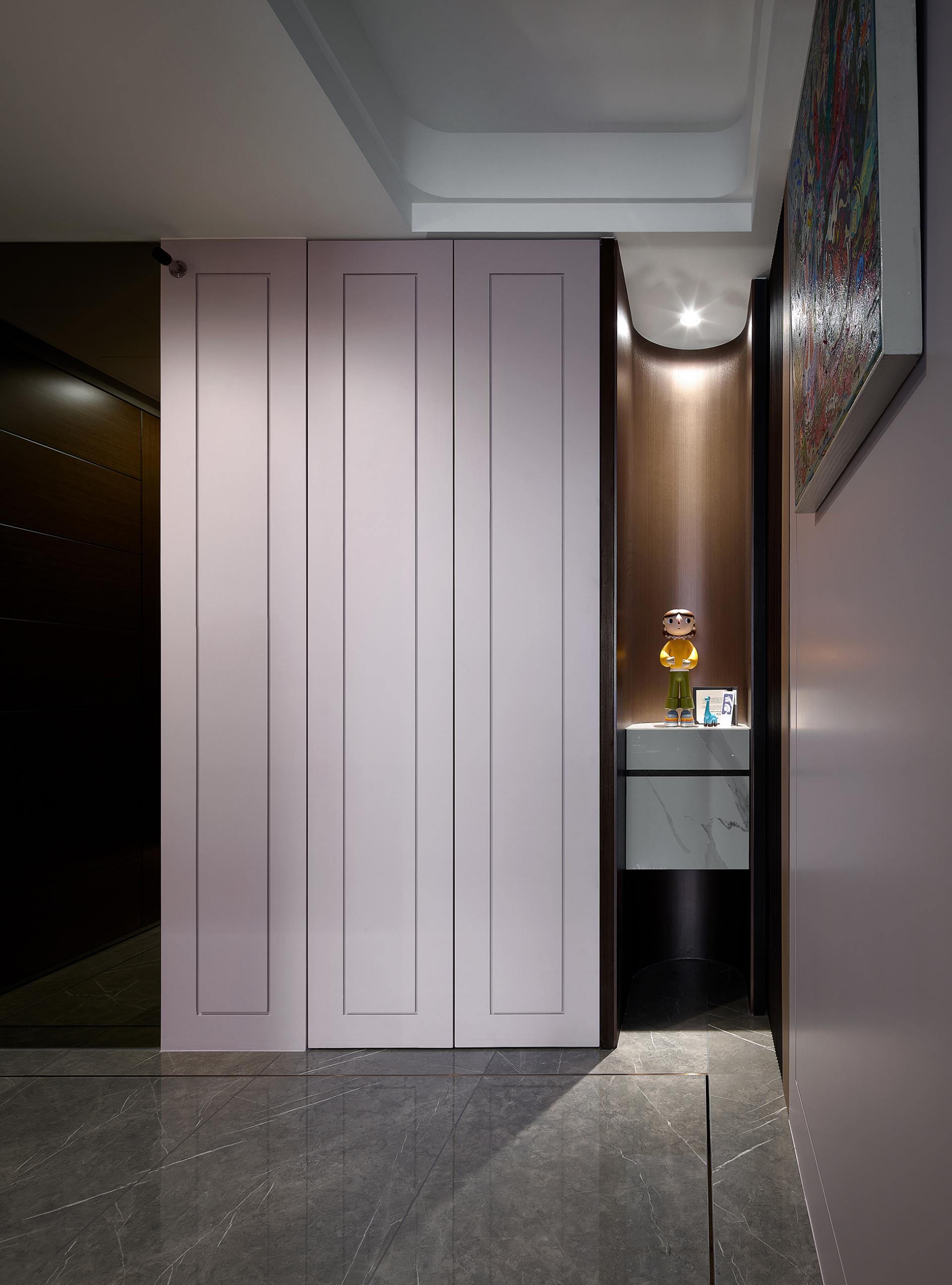 The entryway integrates storage and display functions, considerately tailored to the homeowner's lifestyle of frequent travel. A feature-rich cabinet design with delicate lighting highlights curated collections and treasured pieces, while a built-in shoe bench enhances daily convenience. The full-height cabinet accommodates luggage storage, and the shoe cabinet opposite is accented with a soft, light strip, creating a warm and welcoming atmosphere.