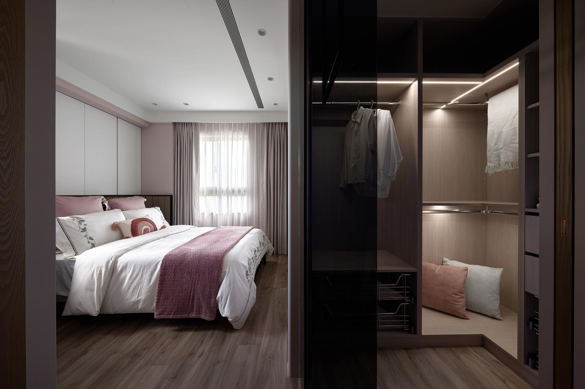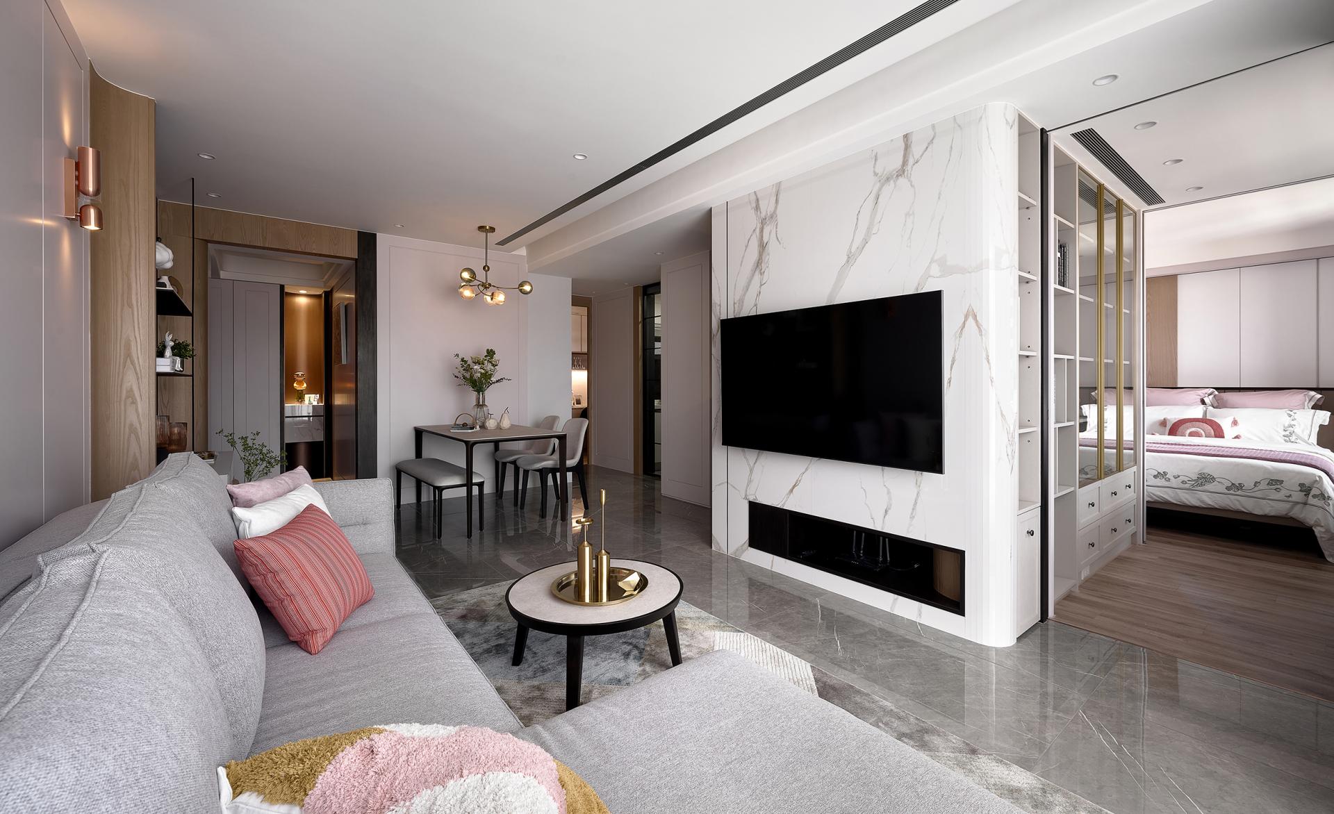 Thoughtfully restructured the layout to dissolve spatial tightness and reconnect functions. Removing the partition between the master bedroom and living room transforms the space into a dual-function area, serving as both a study and a dressing area. By reorienting the TV wall and introducing dual-access openings, the design breaks the limitations of a single-direction circulation, enabling the living room to extend into the private quarters as an intimate retreat. Through this seamless integration of public and private realms, the daily rhythms of sleeping, reading, and leisure flow naturally together—creating a flexible and cohesive spatial sequence that reflects the homeowner’s desire for openness and continuity.