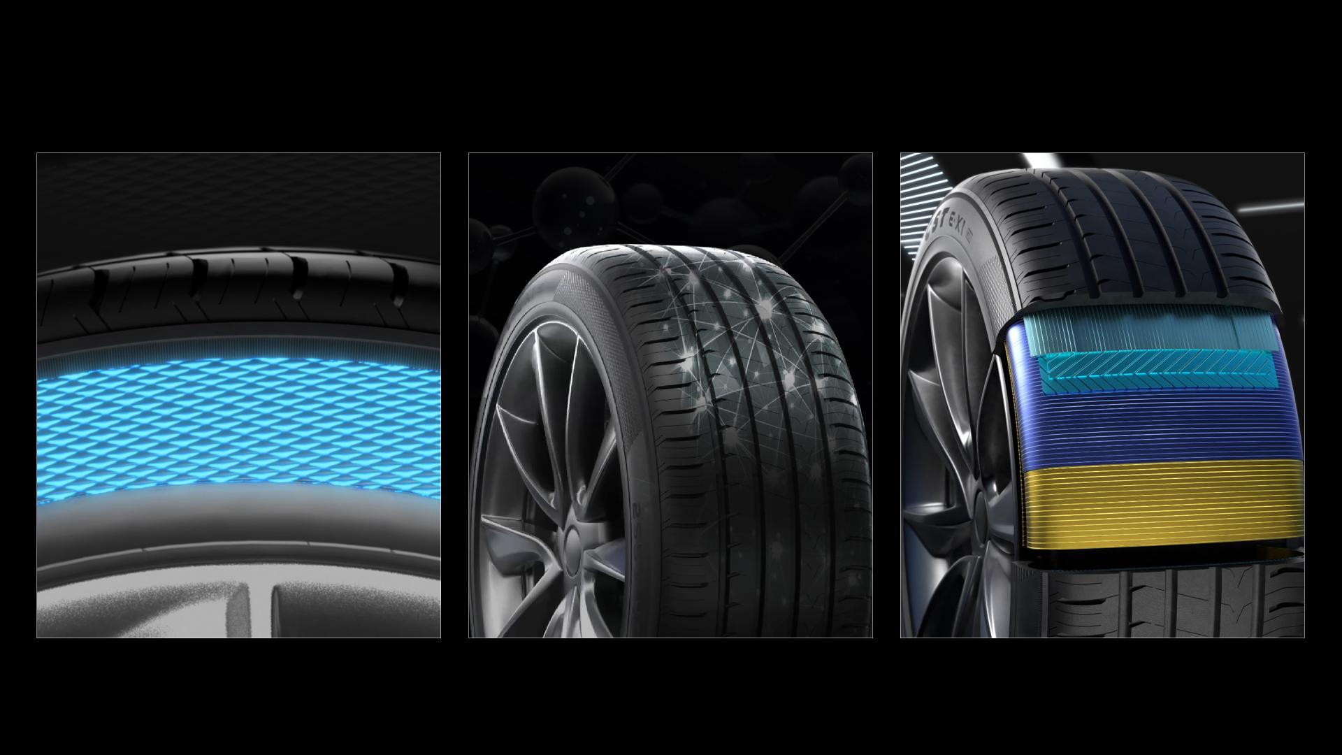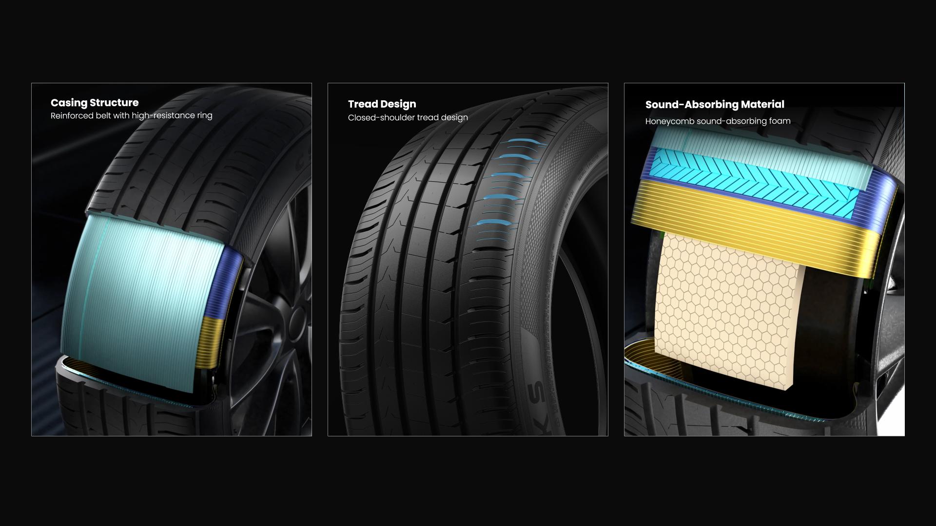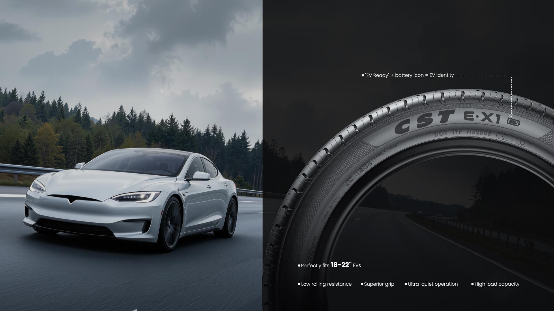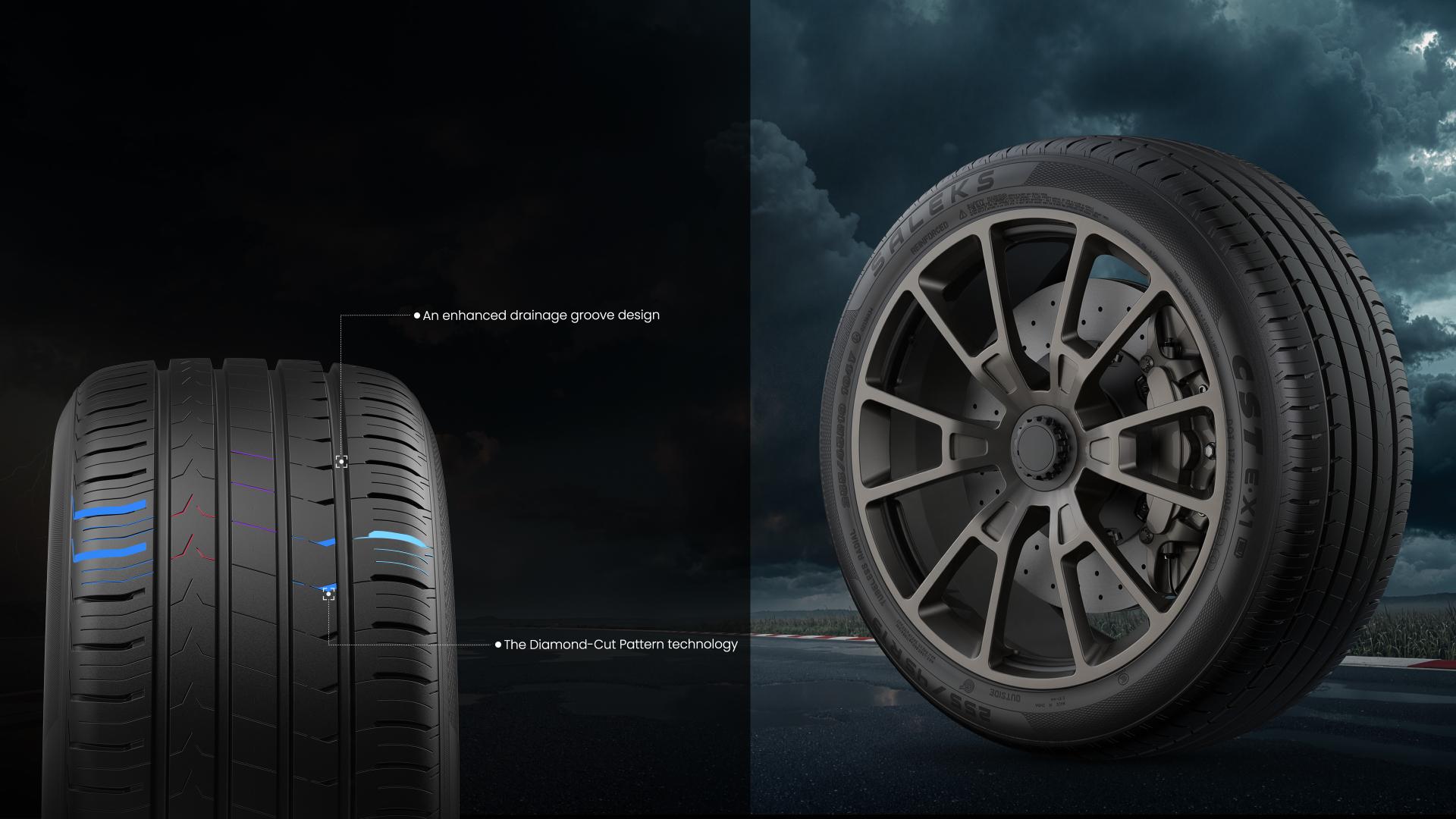 The SALEKS E·X1 is engineered specifically for electric vehicles, comprehensively addressing the core challenges of EV mobility—from higher vehicle weight and powerful torque to the need for a quiet ride and the mitigation of range anxiety. Engineered with four key performance innovations—low rolling resistance, superior grip, ultra-quiet operation, and high load capacity—the E·X1 is designed for a wide range of leading electric vehicle brands. From Tesla and BYD to NIO and Volkswagen, it is fully compatible with mainstream EV models using 18- to 22-inch wheels, while also offering a premium ride comfort upgrade for conventional gasoline vehicles. Its distinctive "EV Ready" sidewall marking and battery icon clearly signify its dedicated EV design, offering a human-centric touch that simplifies selection and identification for consumers. The E·X1 tire features an innovative triple noise-reduction design to deliver a serene experience both inside and outside the vehicle. Its closed shoulder design minimizes air escape, significantly reducing external driving noise. A reinforced nylon belt layer enhances structural integrity by 10%, suppressing tread block vibrations to reduce cabin noise at the source. Finally, built-in honeycomb acoustic foam efficiently absorbs tire cavity resonance, drastically lowering interior noise to create a tranquil driving environment. The E·X1's quiet performance is fully certified under the EU R117 regulation, achieving top "A-Grade" ratings in all three key metrics: rolling resistance, wet grip, and external noise. An enhanced drainage groove design effectively prevents water film buildup, significantly improving water evacuation. This works in tandem with V-shaped sipes that rapidly break through the water film between the tire and the road, substantially shortening braking distances and improving responsiveness in the rain. Furthermore, the Diamond-Cut Pattern technology creates a dual-action grip structure—flexible on the inside for adaptability and rigid on the outside for stability. This design maximizes the tire's contact patch, enhancing both handling stability and grip. With its outstanding wet performance, the E·X1 has achieved the EU Label's "Grade A" standard, providing drivers with reliable, all-weather safety around the clock. We seamlessly integrate high performance with environmental responsibility.