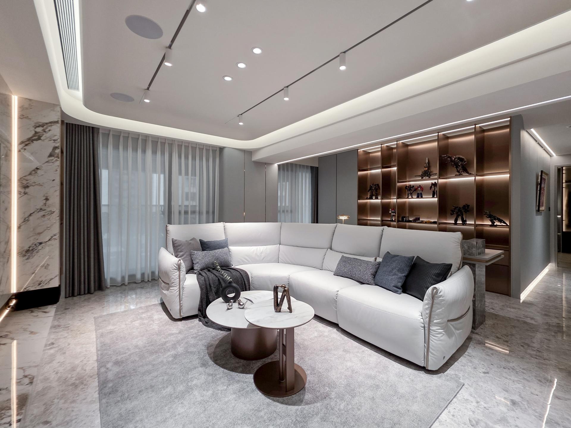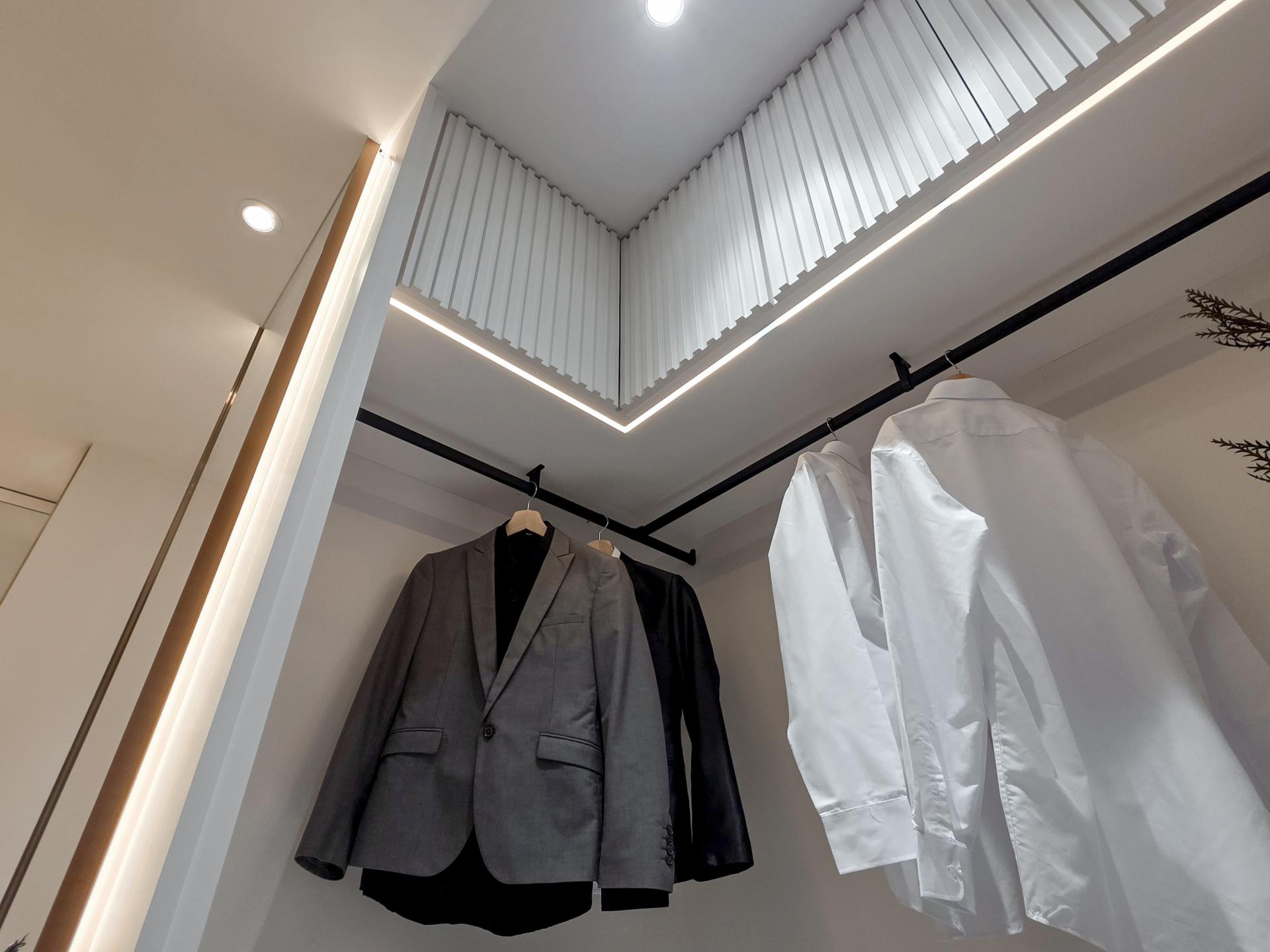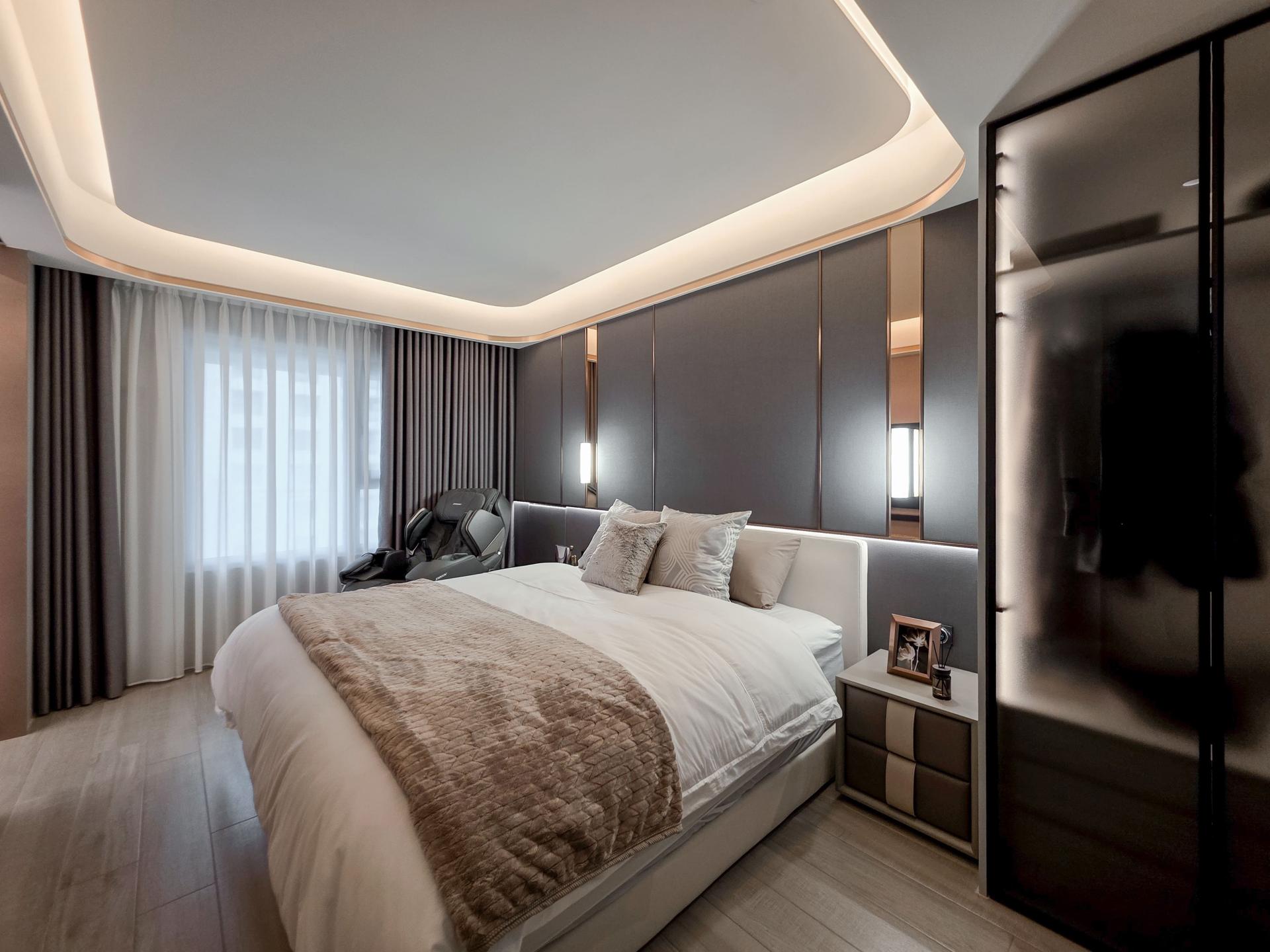 The project centers on the duality of public and private domains. Layout was strategically reconfigured from three bedrooms to two bedrooms plus a walk-in closet, enhancing both comfort and privacy. The public zones establish a restrained yet rich spatial layering, achieved by intertwining a base palette of gray tones with white stone-patterned panels and metallic accents. Indirect lighting and linear strips create a soft, ambient glow, enriching the overall atmosphere.