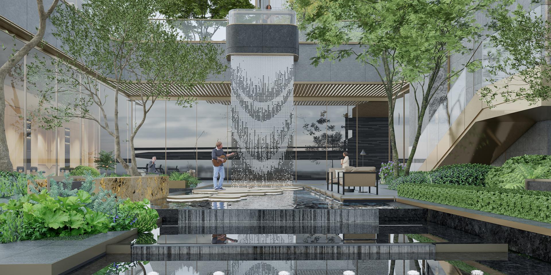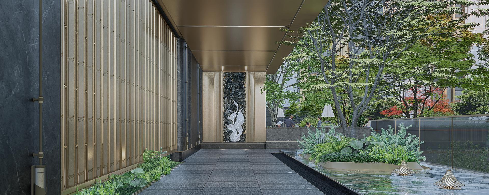 The entrance features a ceremonial gate approximately 38 meters wide and 6.5 meters high, integrating aesthetics, landscape, and architecture into a unified design. The central water feature paired with blooming flowers, symmetrical facade, and layered stone materials exude exquisite luxury, conveying "dignity and warmth" and offering owners a hotel-grade homecoming experience. The sunken clubhouse creates a sunken water courtyard through natural water management techniques. The central calm water surface isolates external noise, while distinctive water features and thematic petal art sculptures set a welcoming scene. Shaped like blooming petals, the sunken water surface embodies the theme of "beautiful years, peaceful life." Surrounding the sunken courtyard are functional areas such as a yoga studio and social lounge, meeting the needs of all age groups and extending family functions.