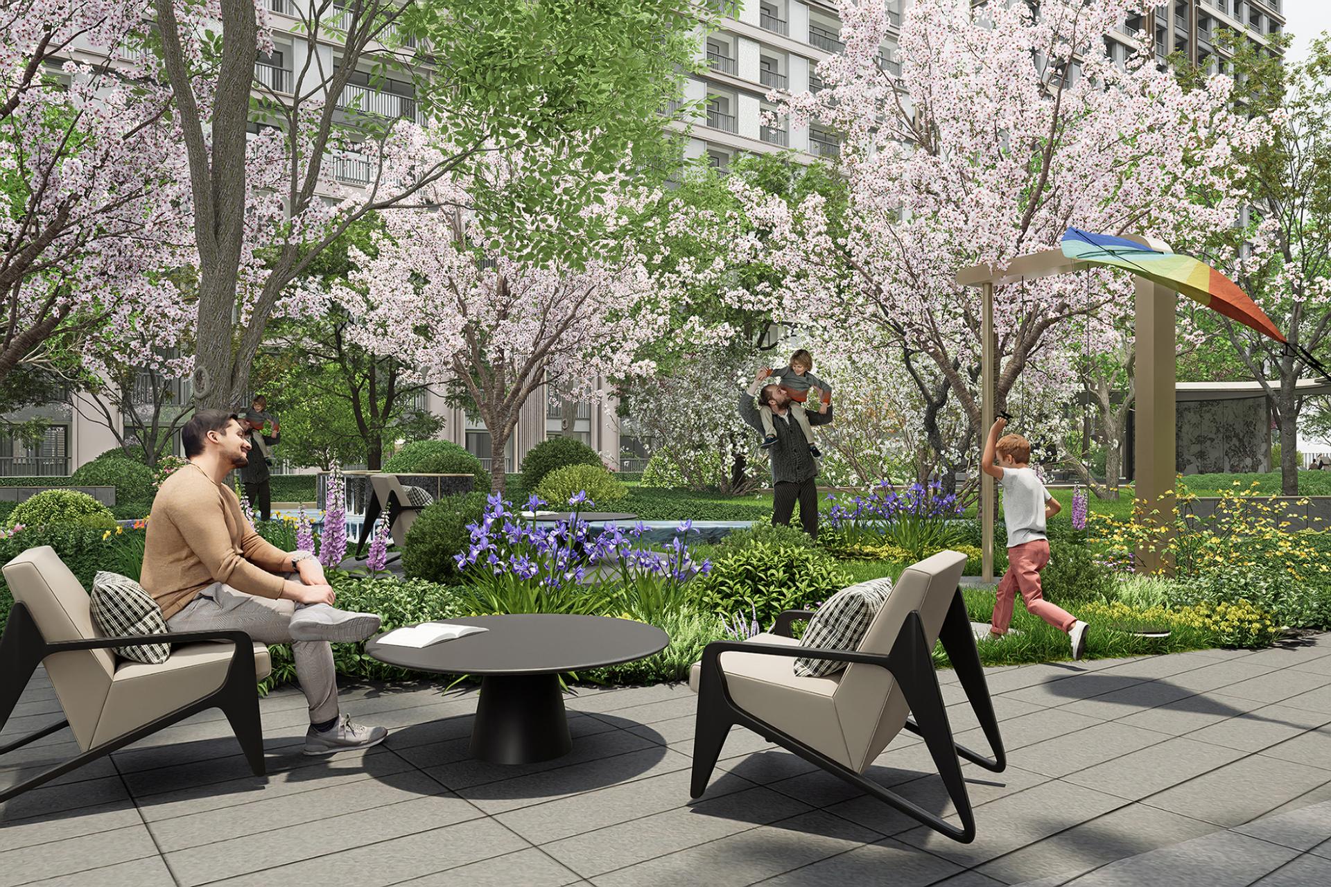 Guided by the concept of "enjoyment for three generations," the petal-shaped landscape lounge is composed of interconnected multi-functional corridors. Combining height differences, it forms an inter-residential garden surrounded by multi-layered greenery. The sunken lawn enhances immersion and spatial sense, with partial stone facades paired with champagne gold metal details to highlight artistic taste. The lounge and surrounding flower beds enclose comfortable booth spaces, realizing the vision of "letting landscape transform life and social interaction integrate with landscape." The project creates a woodland landscape with diverse vegetation and rich layers, using various plants to form a well-structured vertical landscape. Northern characteristic tree species are planted to blend natural beauty and reflect community quality. Greenery embodies seasonal themes, creating a multi-dimensional landscape community with changing scenery at every step and year-round appeal.