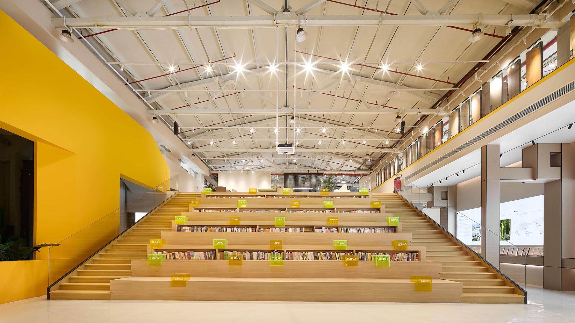The redesign resolves the existing building's chaotic layout by organizing it into eight functional areas with a seamless "display-experience-negotiation-service" flow. Drawing from the industrial heritage, the aesthetic features "industrial yellow" and Mondrian-inspired colors like red, yellow, blue, and wood tones, blending history with modernity.