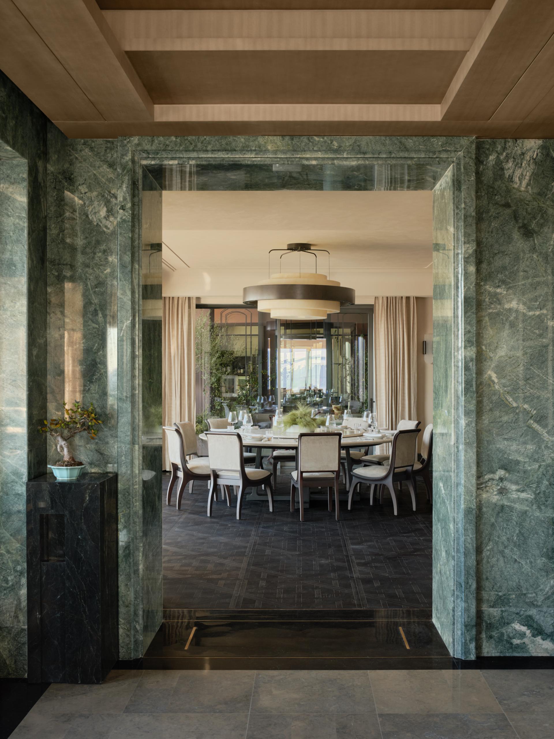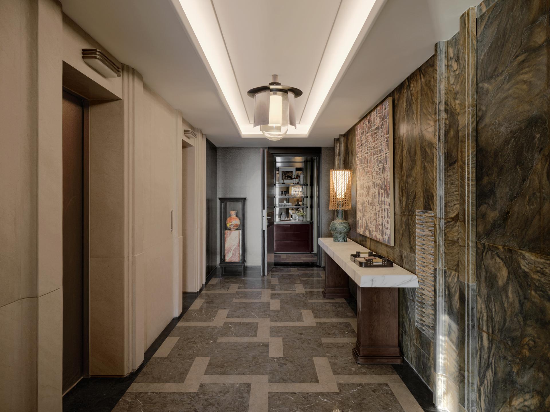 The residential space is formed by combining two separate units. After merging and reorganizing two symmetrical layouts, the various areas remain interconnected yet independent, achieving a gradual transition from universality to individuality, and from public to private. A circular flow begins at the elevator lobby: as two separate units are combined into one, the elevator lobby transforms from a public area into a private space, integrating into the hierarchy and order of the residence.