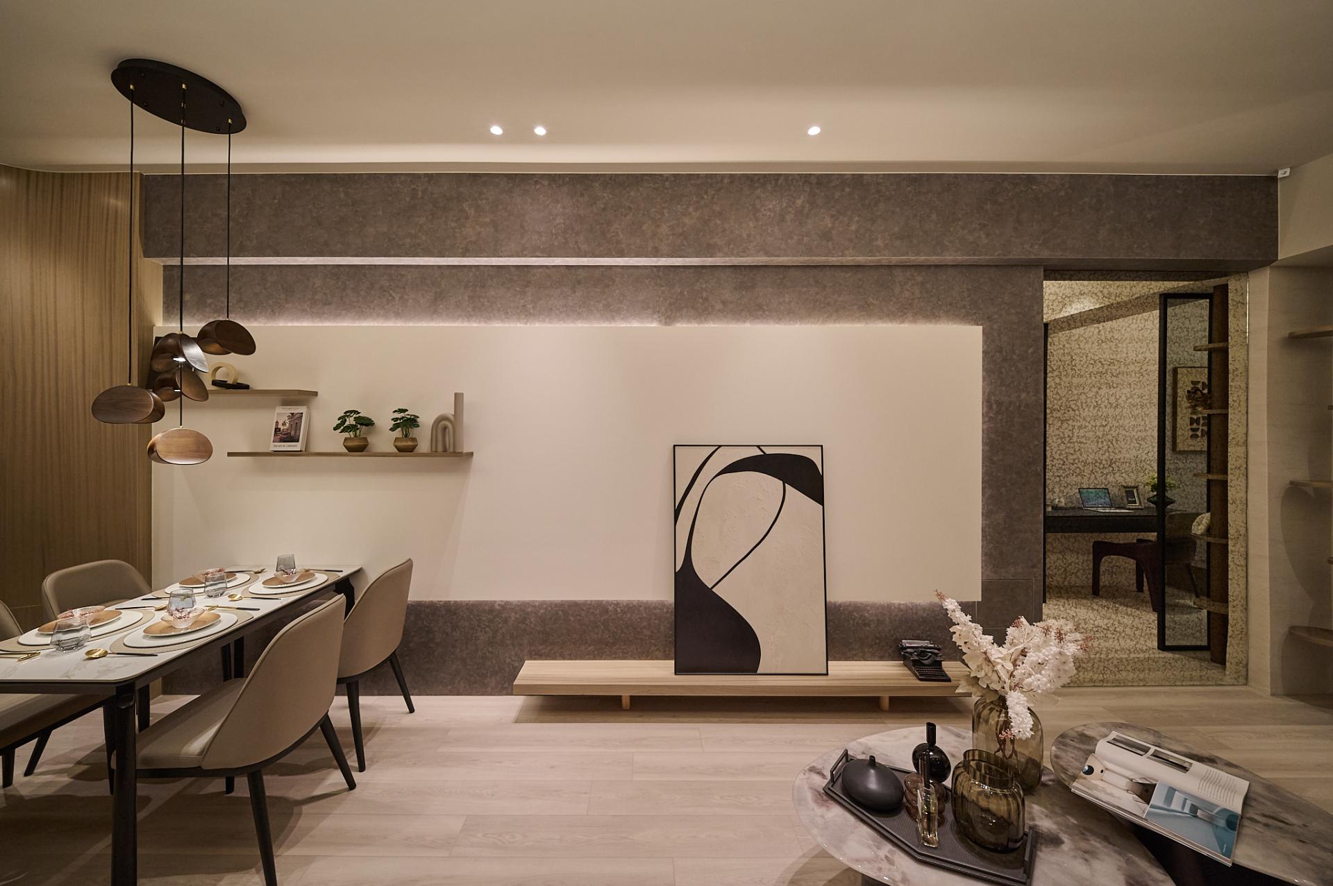 The show home continues the concept of “extension of living.” With Nordic-style wood and milky-brown ceilings echoing the front area, the transition from display to living becomes natural. Through glass penetration, gradient wallpaper, and reflective lighting, the designer creates visual depth and brightness, achieving a transition from dim to bright, from solid to transparent.
