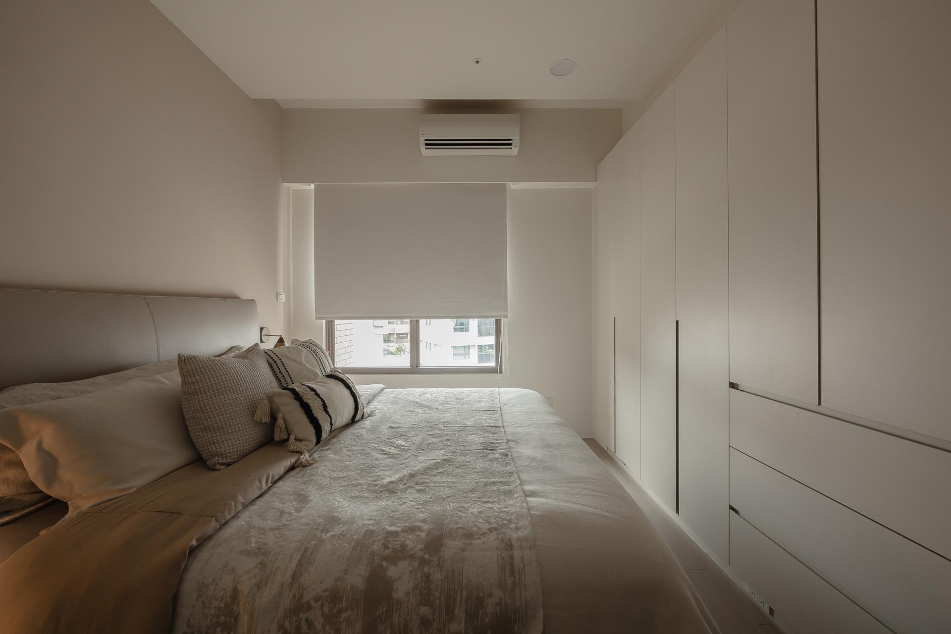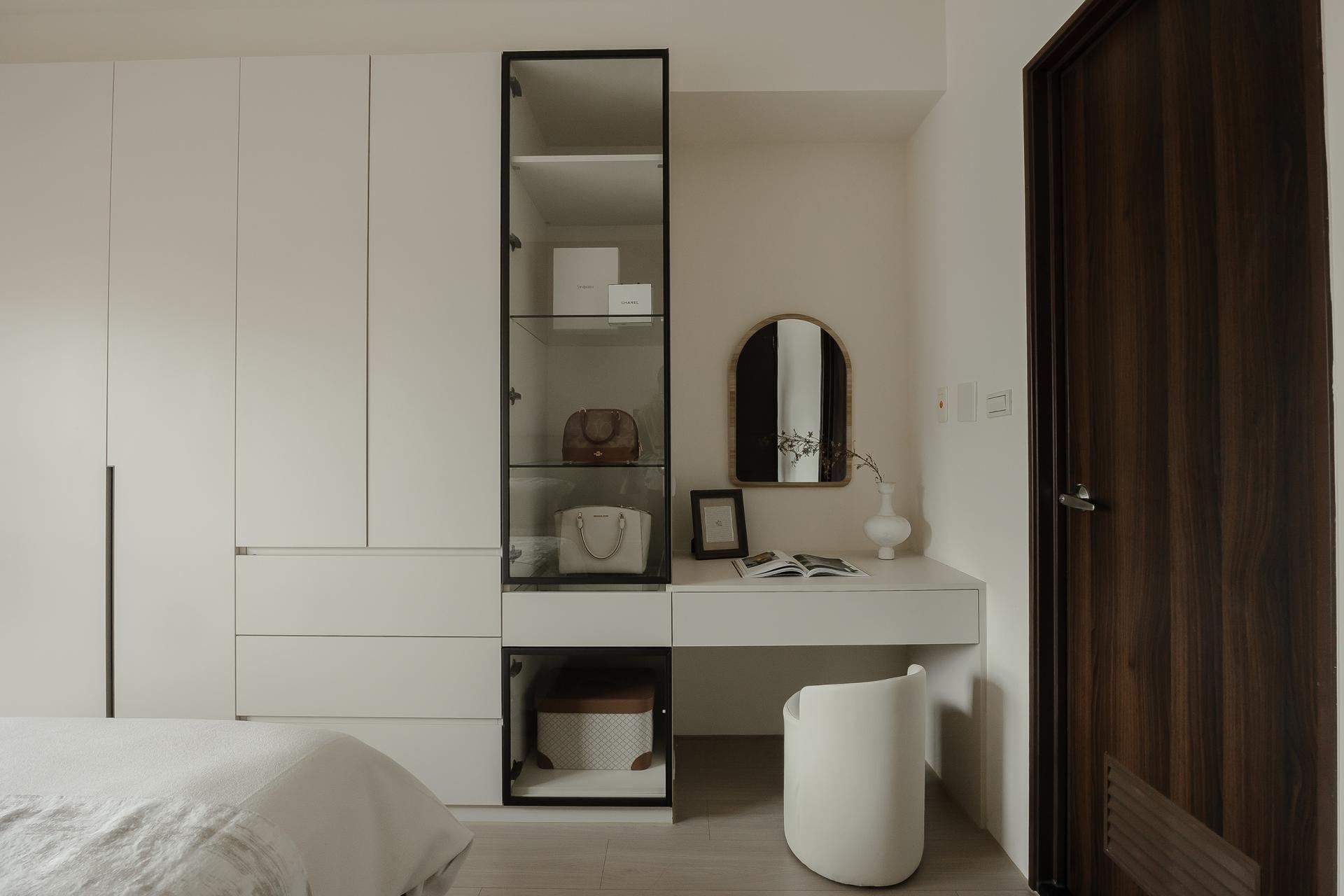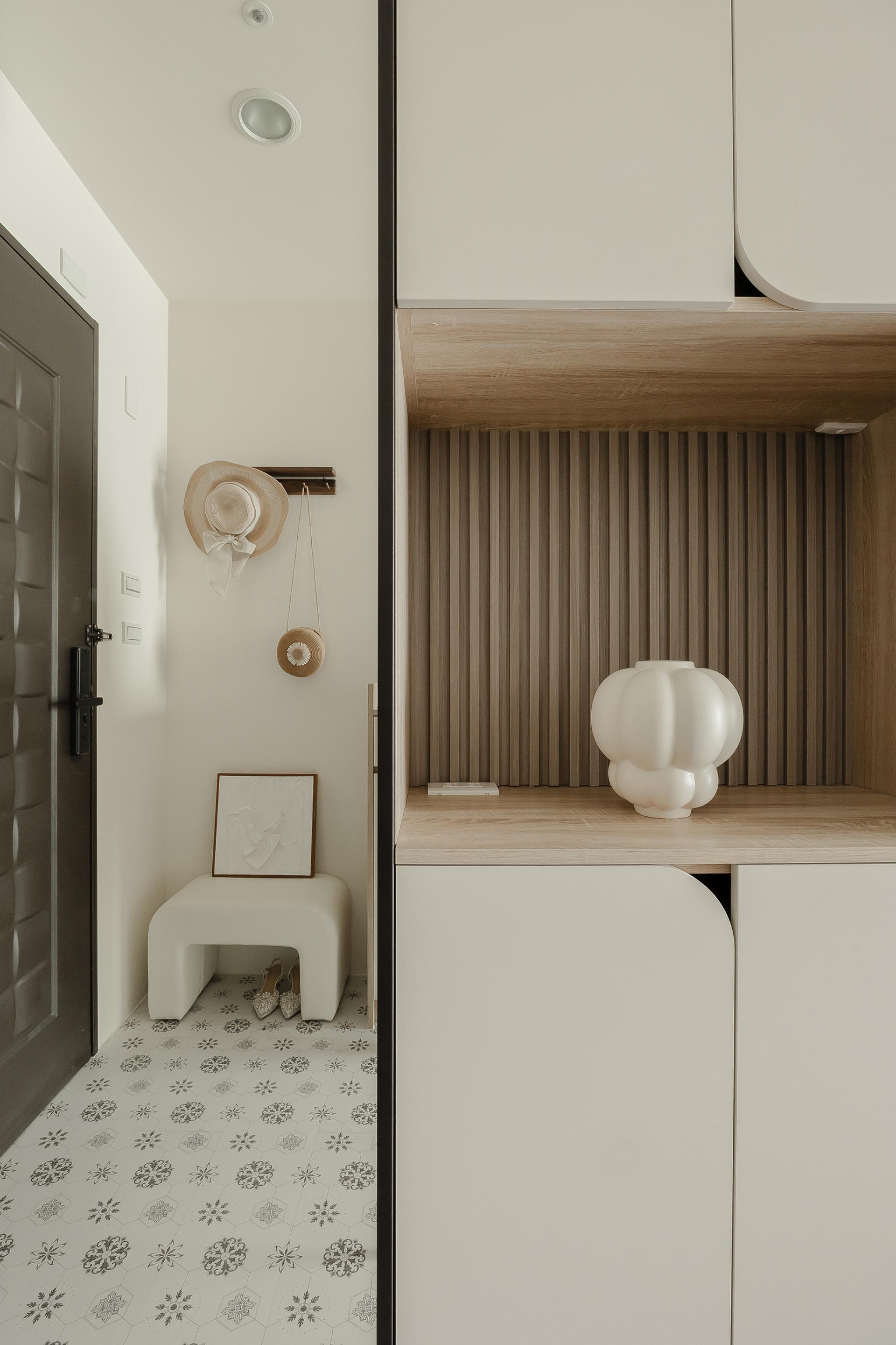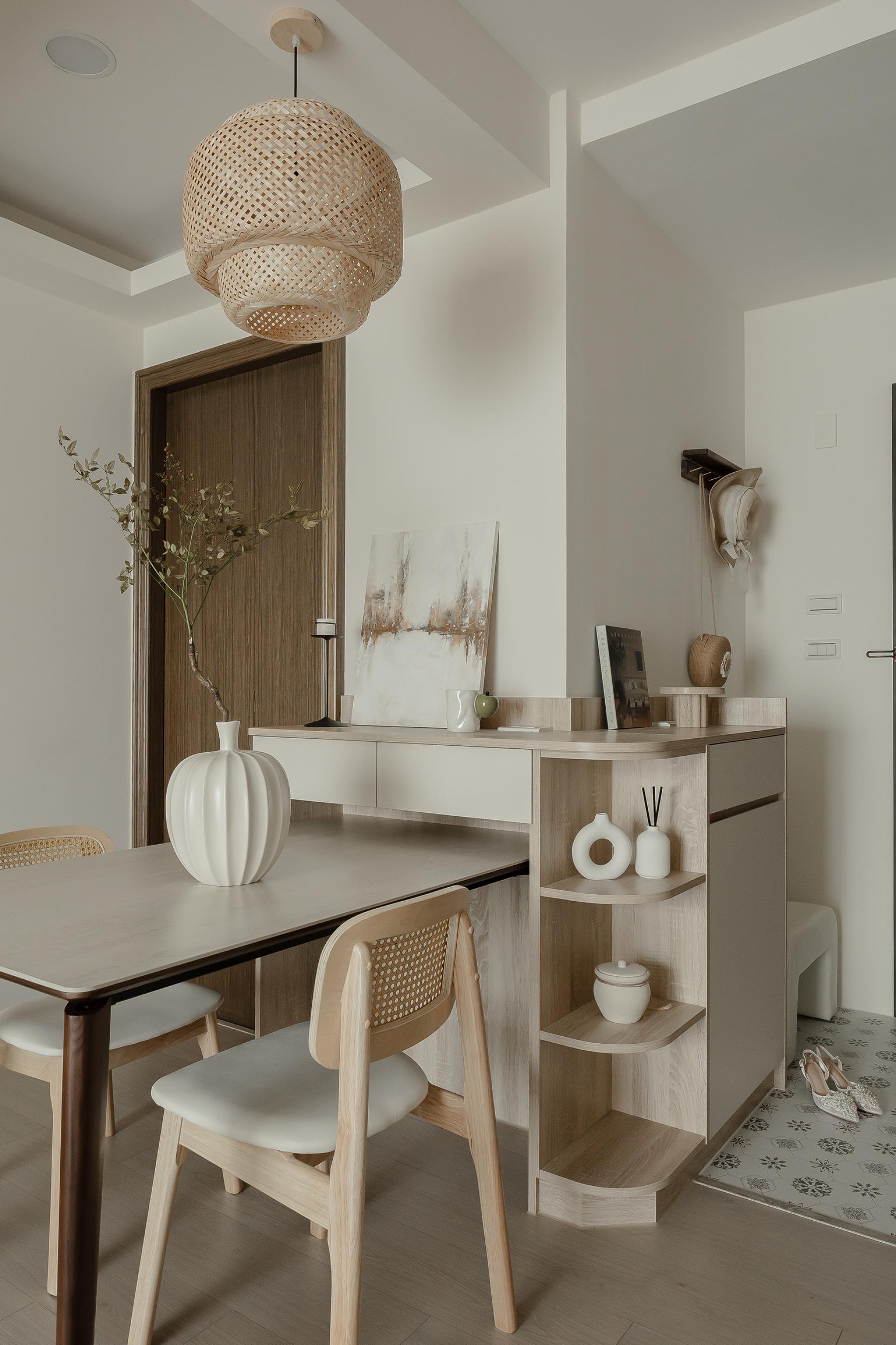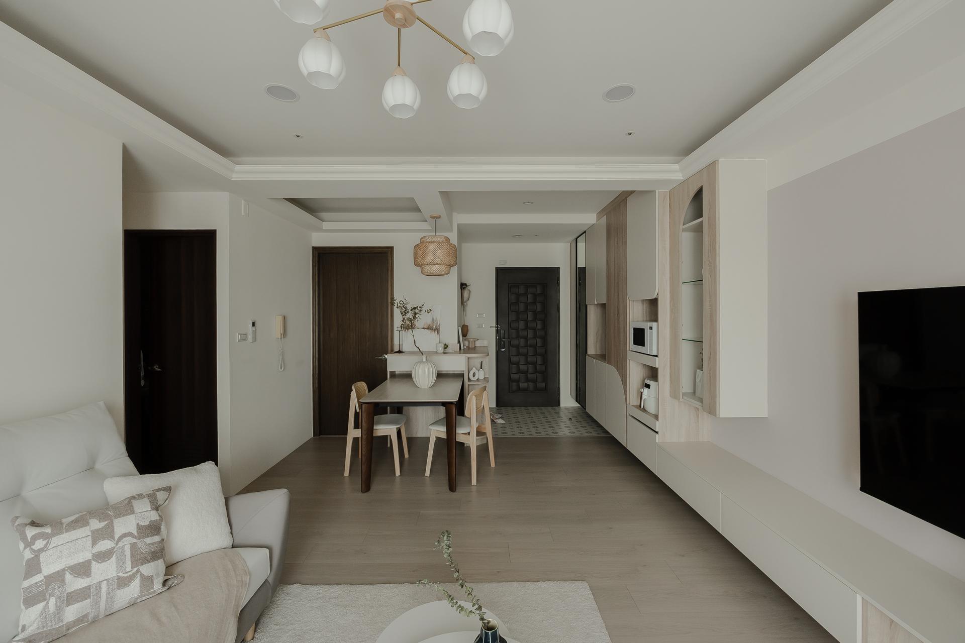 Because the original layout lacked a designated dining area, the design team integrated the entry cabinet, sideboard, and storage units into a single continuous structure, achieving a balance of function and beauty within limited space. The result embodies a refined yet understated rhythm of living, where softness defines every transition.