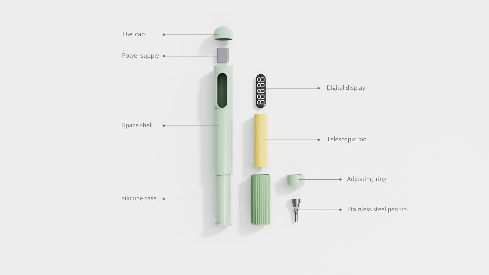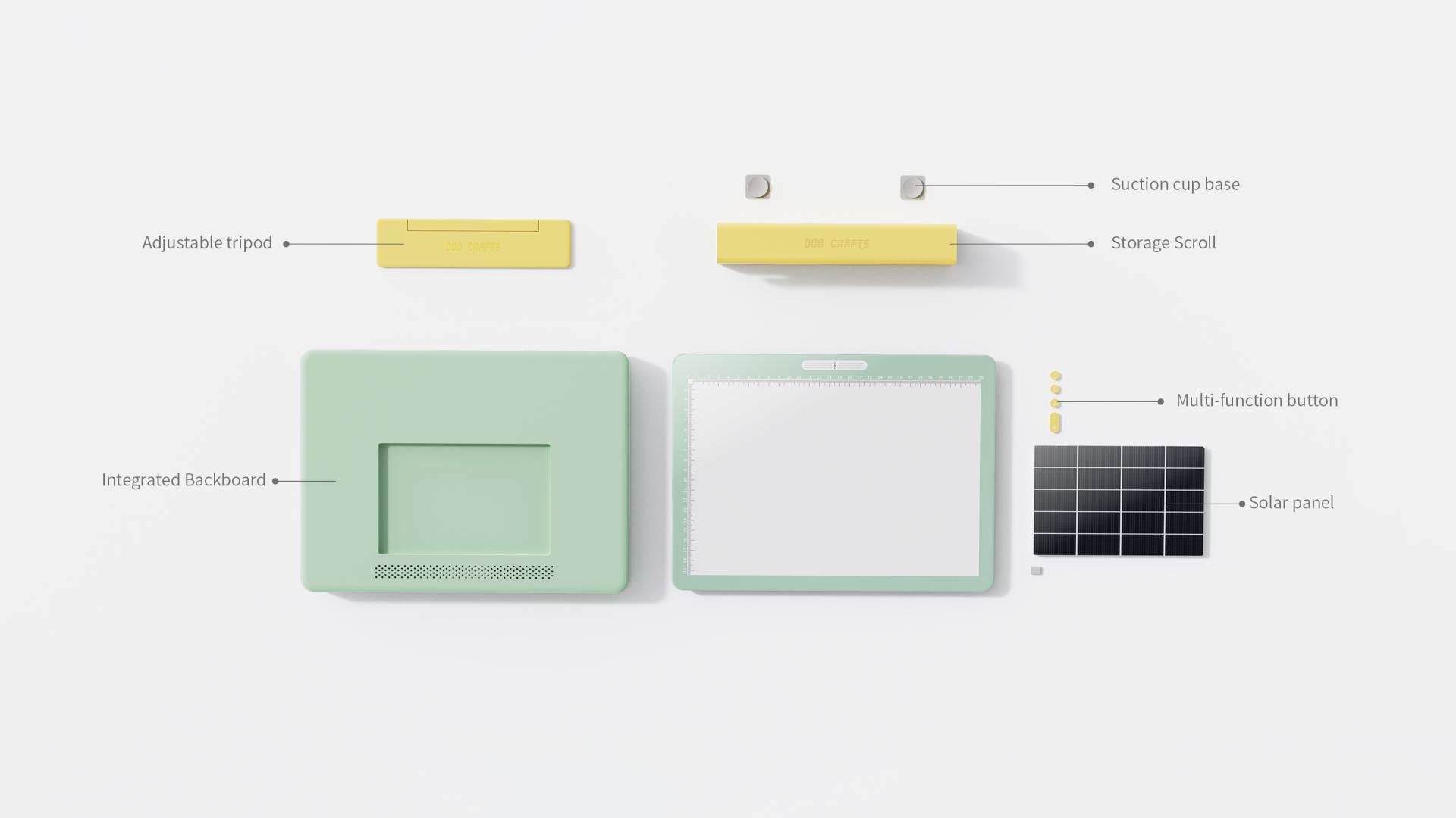 The applicator board combines a backlit lightbox with posture guidance. Its soft, adjustable lighting adapts to various environments, while three calibrated lines on the surface utilize a moiré effect to prompt correct sitting posture. Paired with an adjustable stand, users can customize the height to maintain a natural viewing angle. The board also emits white noise to block out distractions, fostering deep concentration. A built-in solar panel on the back ensures continuous use outdoors or during power outages.