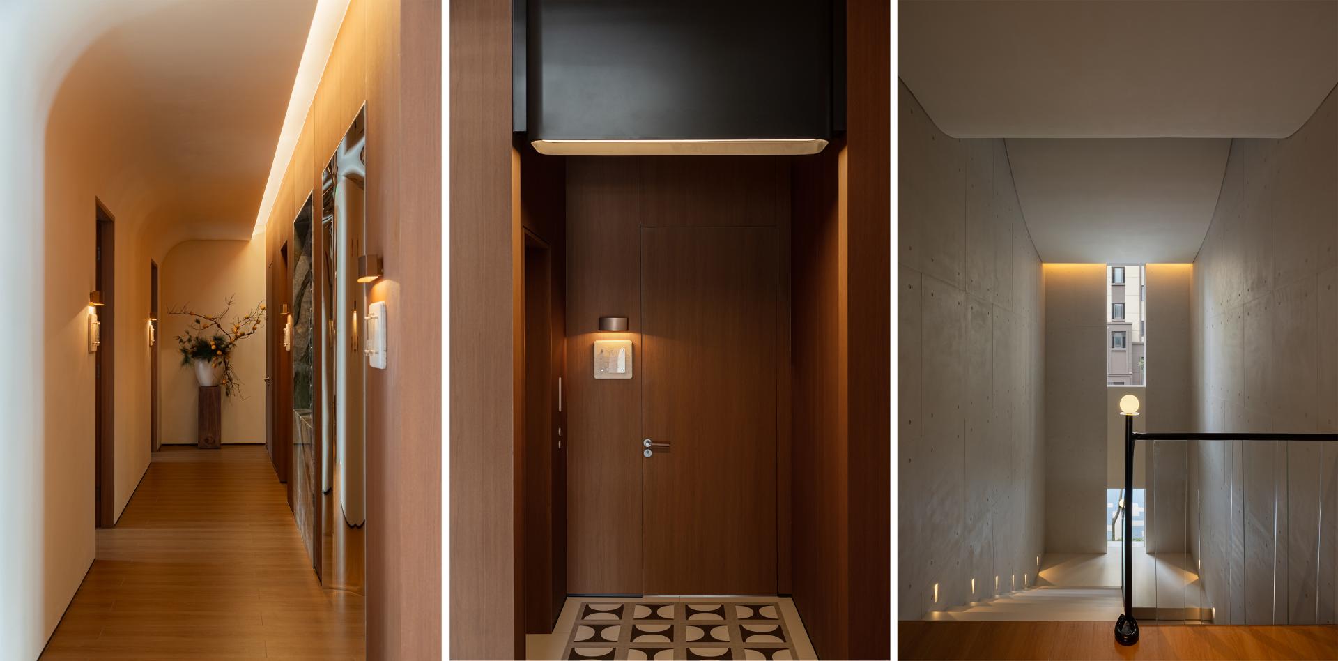 In public zones where artistic sensibility and a relaxed atmosphere are prioritized, the lighting design skillfully employs abundant soft, diffuse illumination. Using high or low-position indirect lighting techniques, it shapes the ambiance. These light sources are subtly concealed within architectural features or objects, enhancing both the artistic quality and comfort of the space. Conversely, in areas with a distinct modernist style, such as the staircase, the lighting adopts a more direct approach to align with the spatial character.