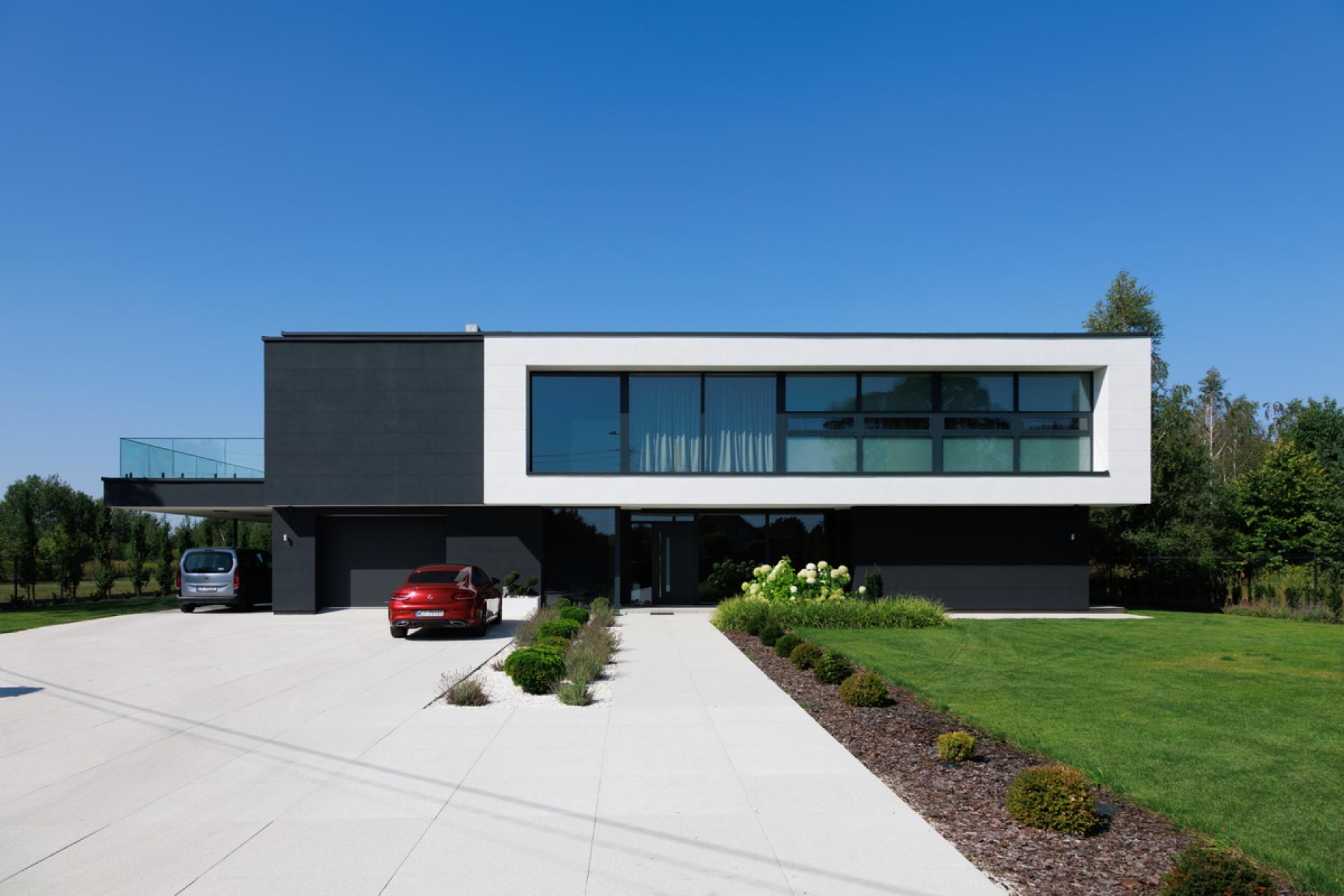 The front of the house accommodates functional zones aligned along its façade, such as technical rooms, a guest room, the entrance area and recreational facilities. A double-height living area introduces openness, positive energy and a generous setting for the sculptural floating staircase.