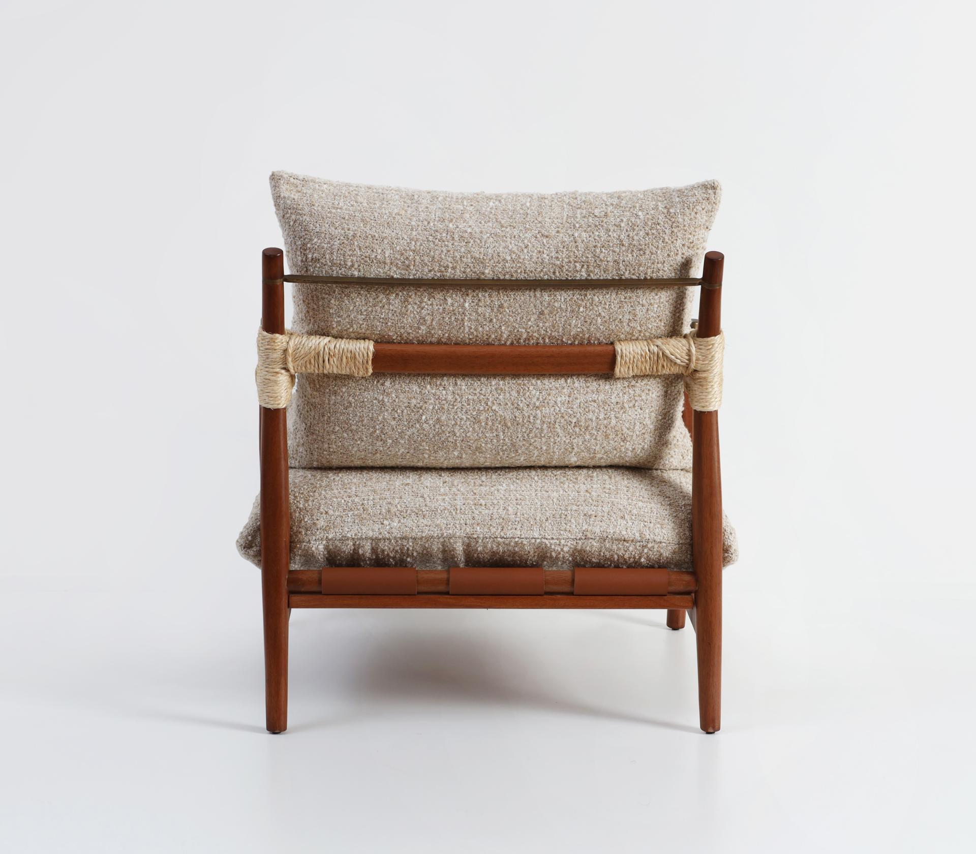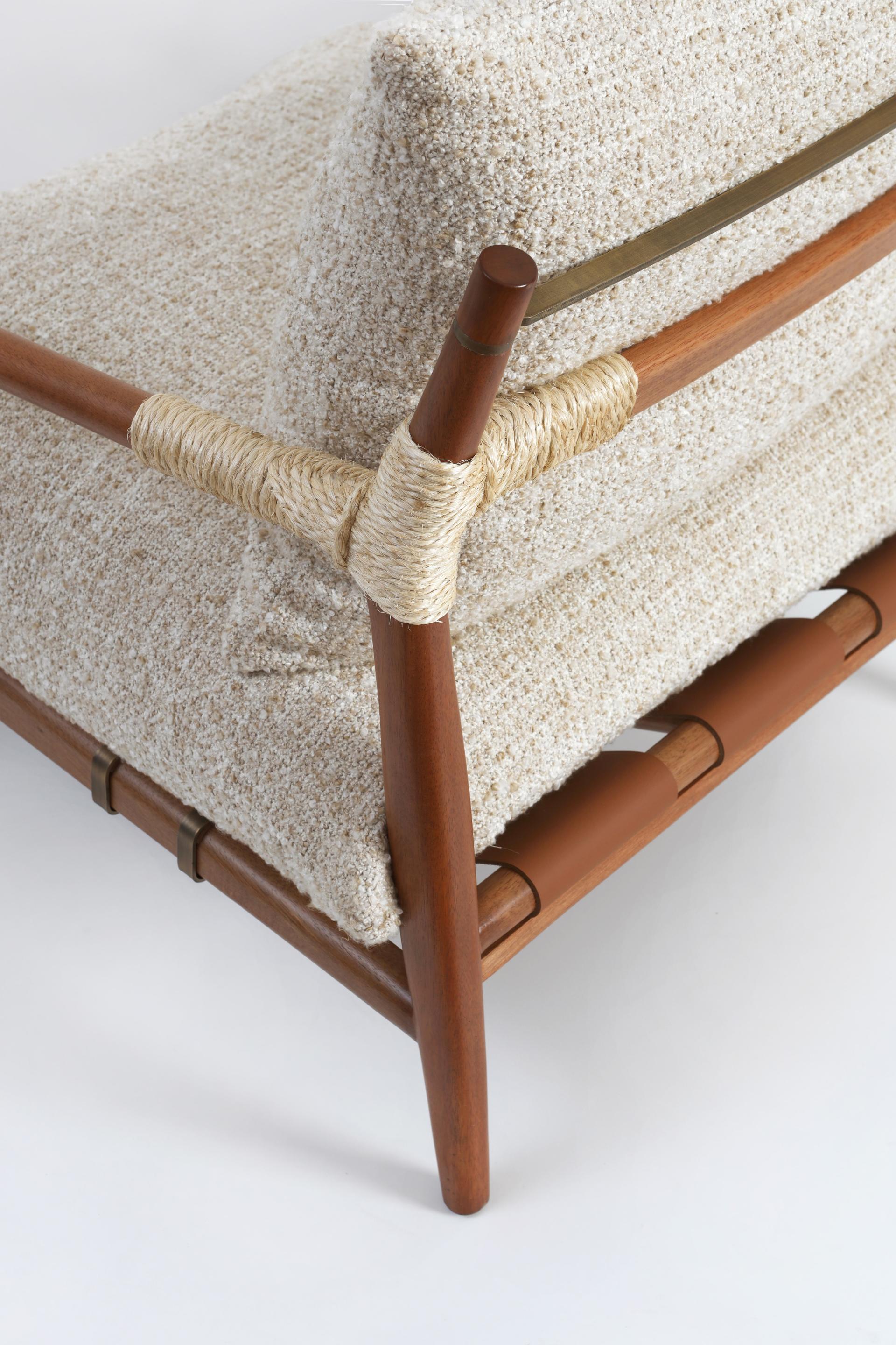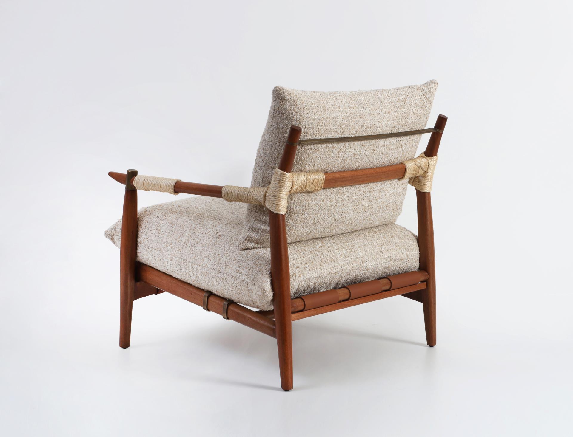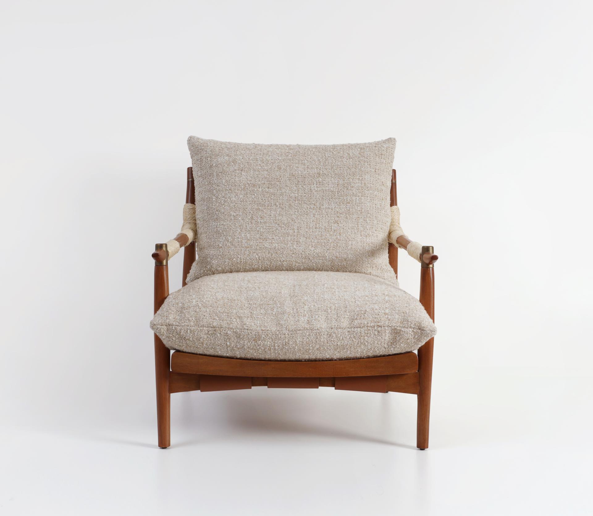 Rattan rope wraps the arms with a tactile honesty, linen cushions bring softness and lightness, and brass accents introduce subtle precision.