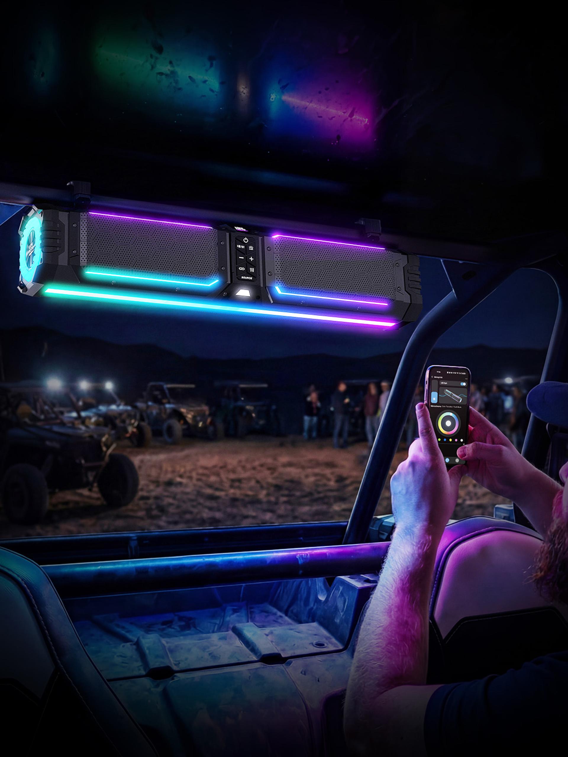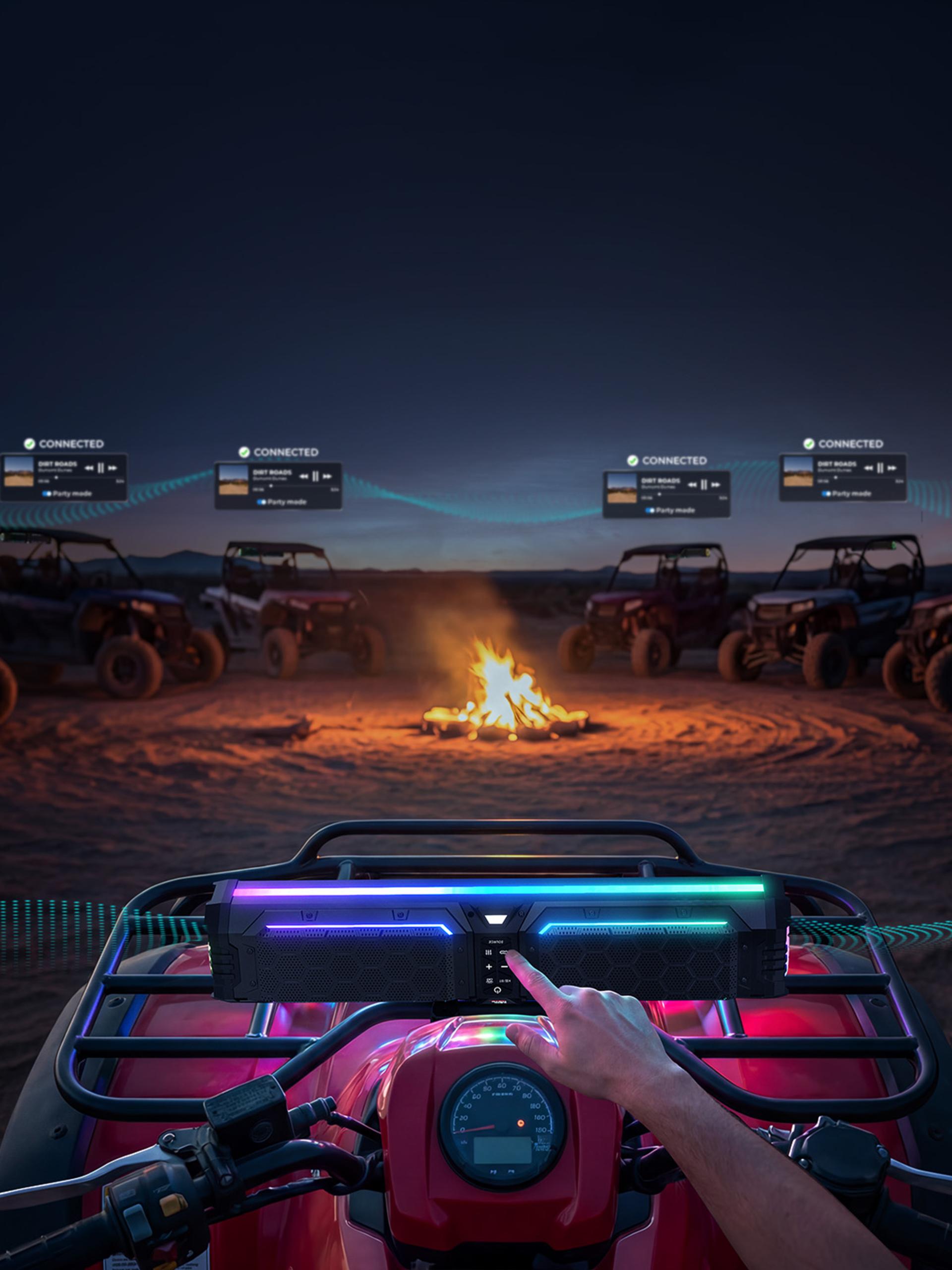 Aesthetic and structural designs are meticulously engineered to enhance both acoustic performance and reliability. The integrated elongated body, made from black aluminum alloy tubes and die-cast metal grilles, boasts a lightweight construction, excellent impact resistance, and IP66-rated waterproof and dustproof protection—effortlessly tackling harsh conditions such as mud, rain, and high-frequency vibrations. Dynamic RGB lighting not only improves nighttime visibility but also adds an expressive touch to the device. As for interaction, Midnight 70 Gen2 can be controlled via physical buttons, a remote control, the app, and voice prompts, enabling intuitive operation. Moreover, a modular mounting bracket facilitates easy installation and is compatible with a wide range of vehicle models. Certified by FCC and ISED, the product incorporates multiple circuit protection mechanisms and utilizes recyclable materials, achieving a harmonious unity of high performance, lasting durability, and sustainability.