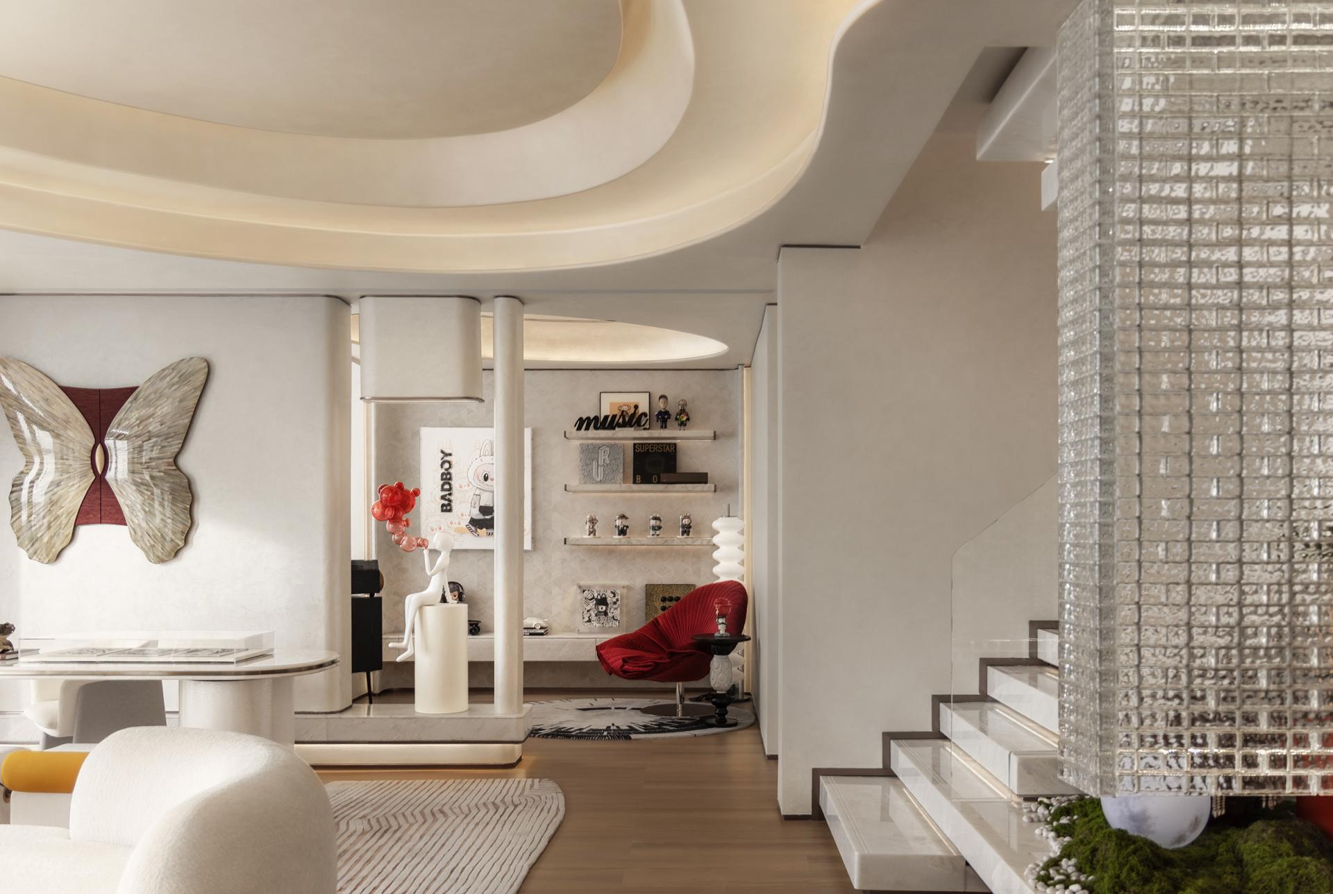 Aesthetically, the design focuses on modern luxury with low-saturation tones and material contrasts. Glass blocks, metal, velvet, and natural stone come together, with strategic lighting highlighting the emotional atmosphere of each room. Curved elements soften spatial boundaries, while the lotus-inspired dining room chandelier and art installations in the study enhance the sense of ritual and intellectual depth. An artistic staircase connects the spaces, infusing the living experience with sculptural beauty.