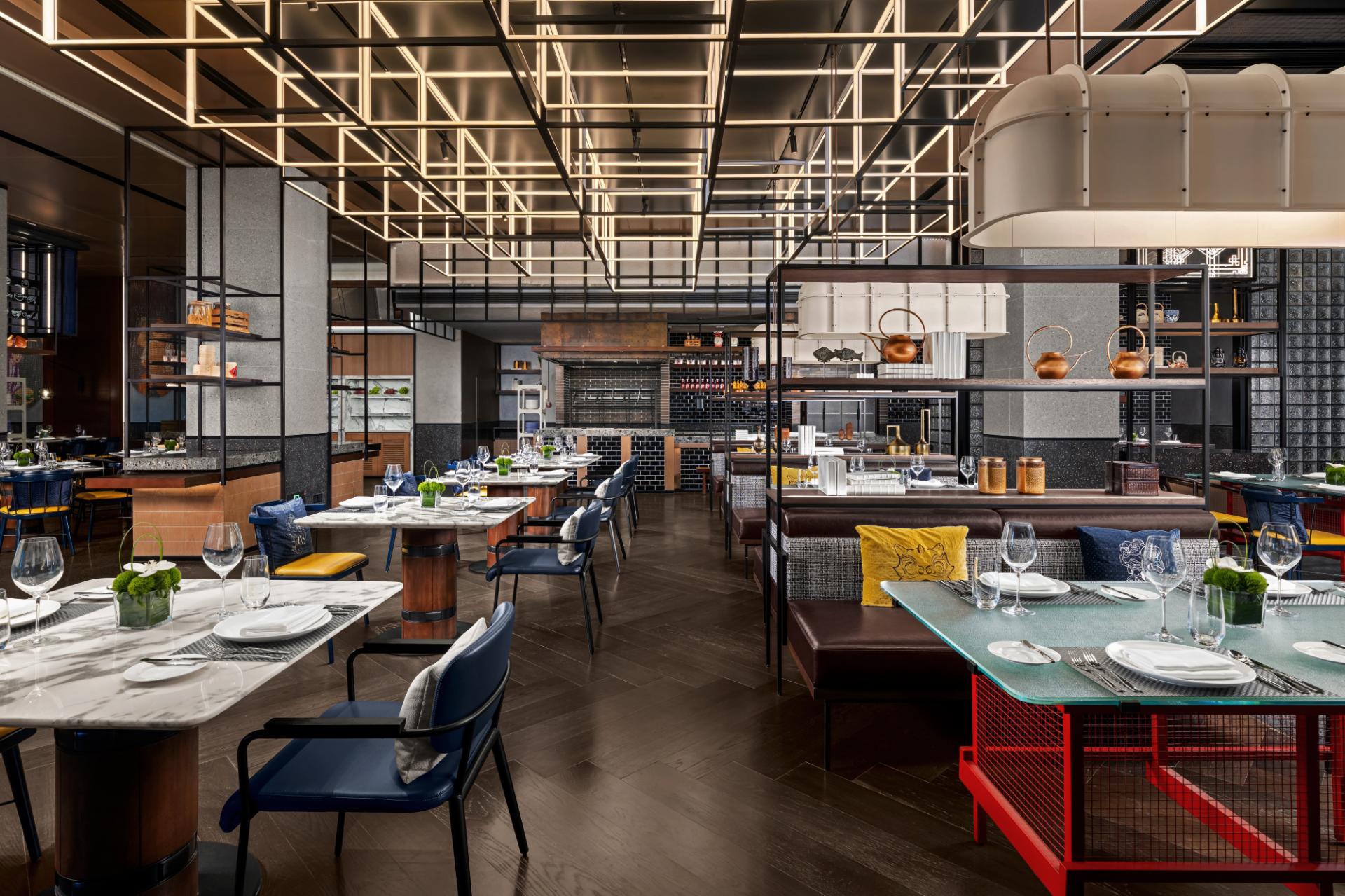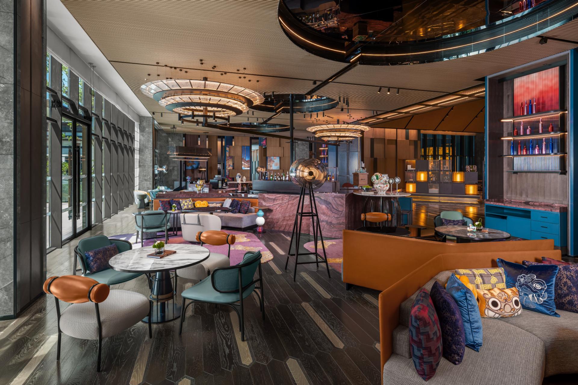 The lobby evokes the atmosphere of a Southern Song waterfront dock, with reception designed as a sailing mast and flooring inlays inspired by ancient travel documents. Among 296 guest rooms and suites, many feature private balconies overlooking the park, blending bold contemporary colors with artistic sensibility. Dining venues reimagine tradition through a modern lens. The R Bar—reinterpreted as a contemporary “Jiao Dian” rest stop—features a striking balance-scale ceiling and transforms from a daytime café into an evening social destination as part of the brand’s “Evenings at Renaissance” program. Over 2,200 square meters of event space includes divisible ballrooms and flexible meeting rooms for both corporate and social occasions. The wellness area embodies a poetic aesthetic, with a 24-hour fitness center and an indoor temperature-controlled pool adorned with gradient mosaic tiles, offering a visually enchanting retreat.