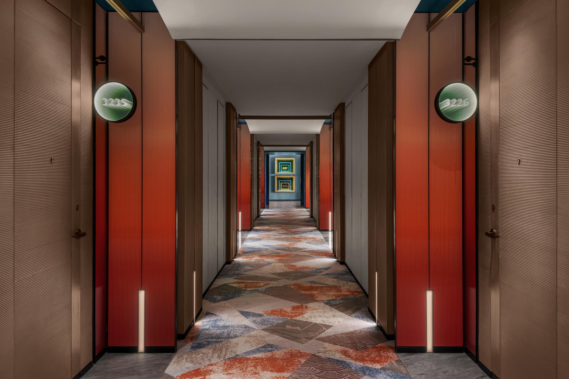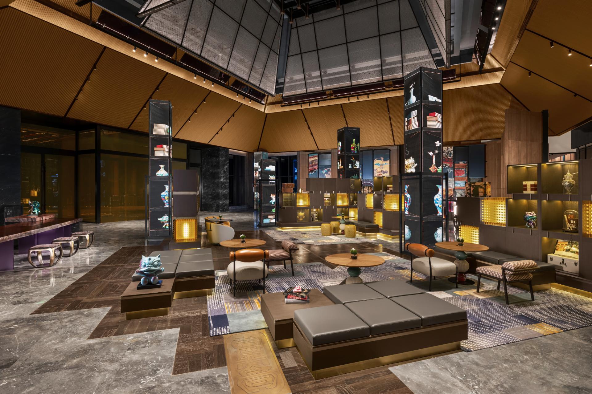 The hotel’s design is poetically guided by “The Twelve Two-Hour Periods of Lin’an,” weaving in local lore such as “King Qian Shooting the Tide” and introducing a guardian lion cub IP. This narrative unfolds through spaces that transition from dawn to dusk, inviting guests into a serene yet vibrant dialogue between history and modernity.A restrained material palette—raw wood, woven bamboo, silk, rice-paper textured walls, and blue flagstone—is gently contrasted with contemporary metal and glass. Subtle hues drawn from Song porcelain and ink-wash paintings are accented with indigo and ochre, echoing the natural surroundings and artistic heritage of the era. Perforated screens, layered partitions, and carefully orchestrated daylight create ever-changing plays of light and shadow, shaping tranquil yet dynamic interiors.