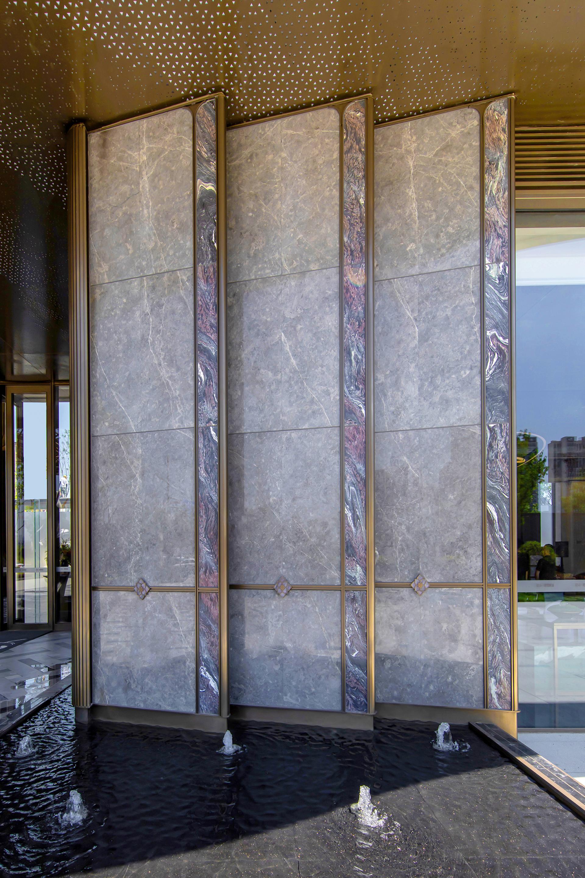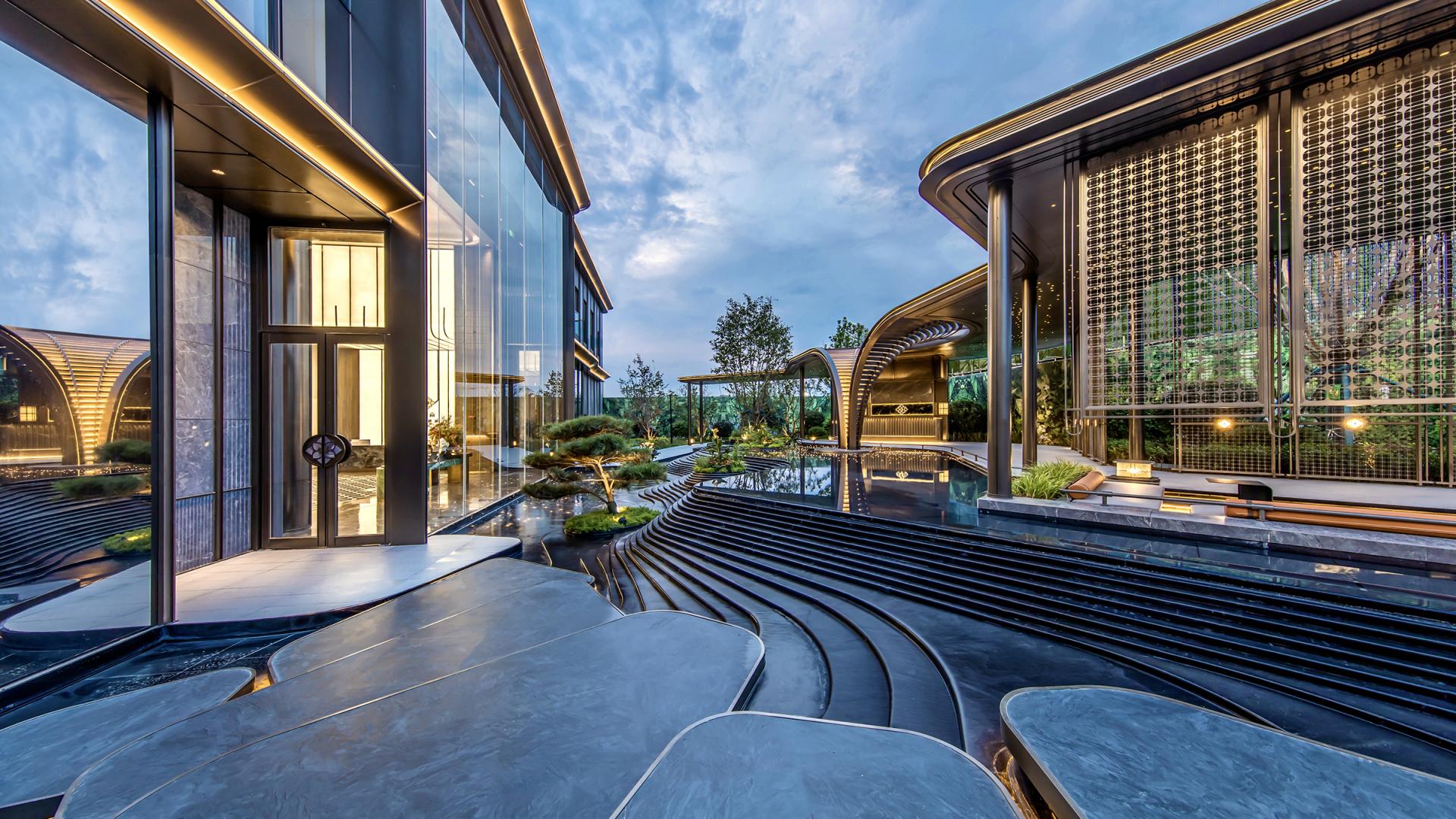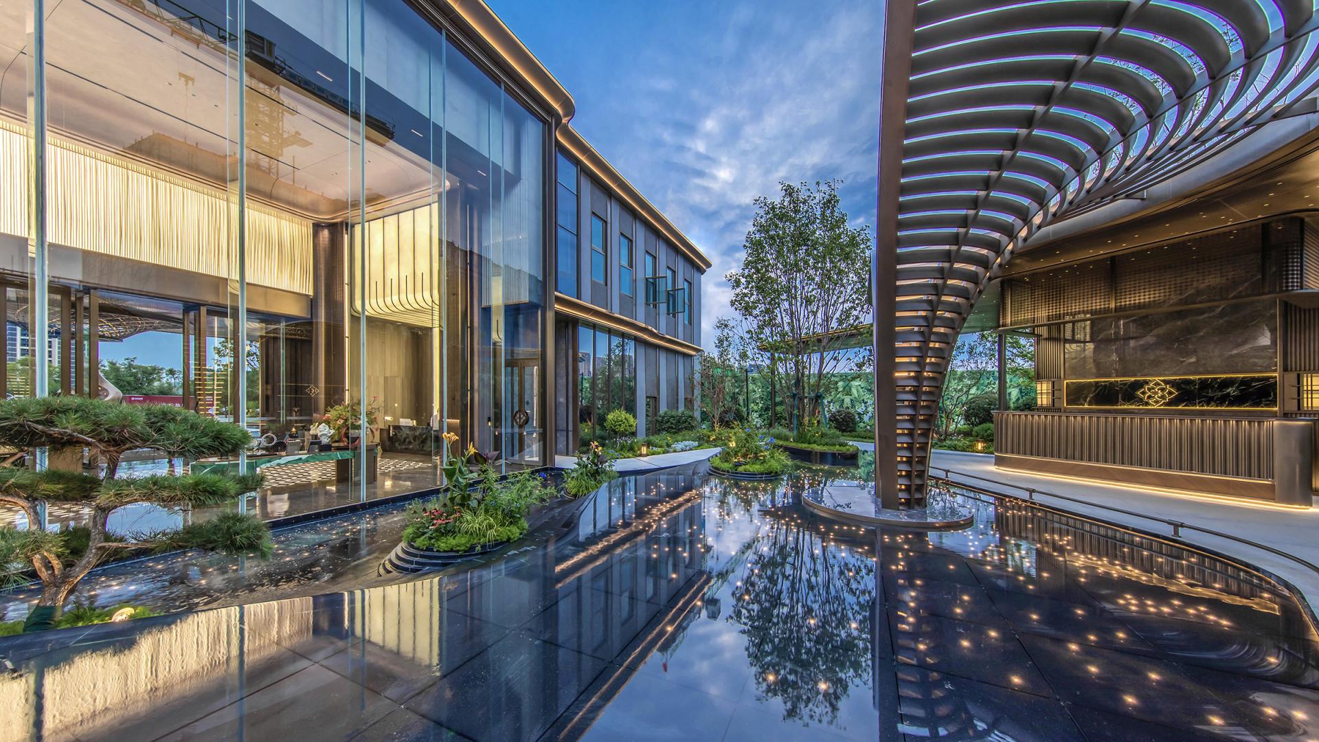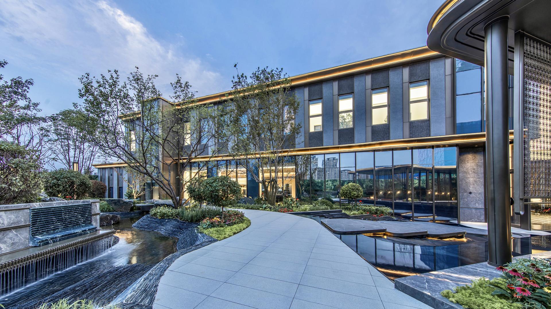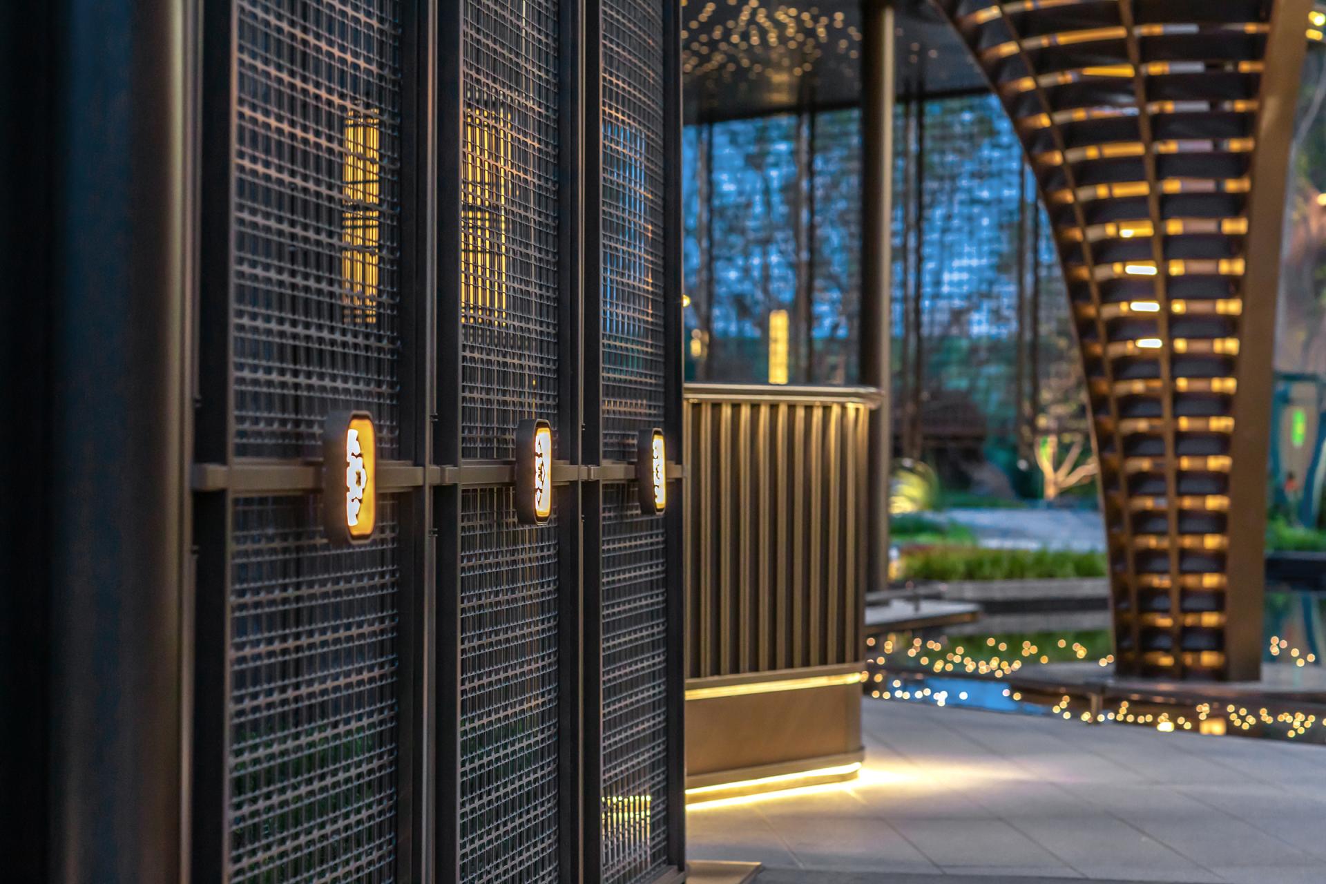 The project features an innovative curtain wall system using high-reflective glass and perforated aluminum panels, which captures natural light, shadows, and the urban skyline. At the entrance, a parametrically designed bronze petal-shaped starry ceiling is paired with a luxury stone curtain wall and a flower-shaped logo, symbolizing auspicious meanings. The secluded backyard courtyard is designed with vintage warm tones, an arbor inspired by the city flower (rose), cascading water features, dry streams, and an arch bridge, providing a multi-dimensional garden experience.
