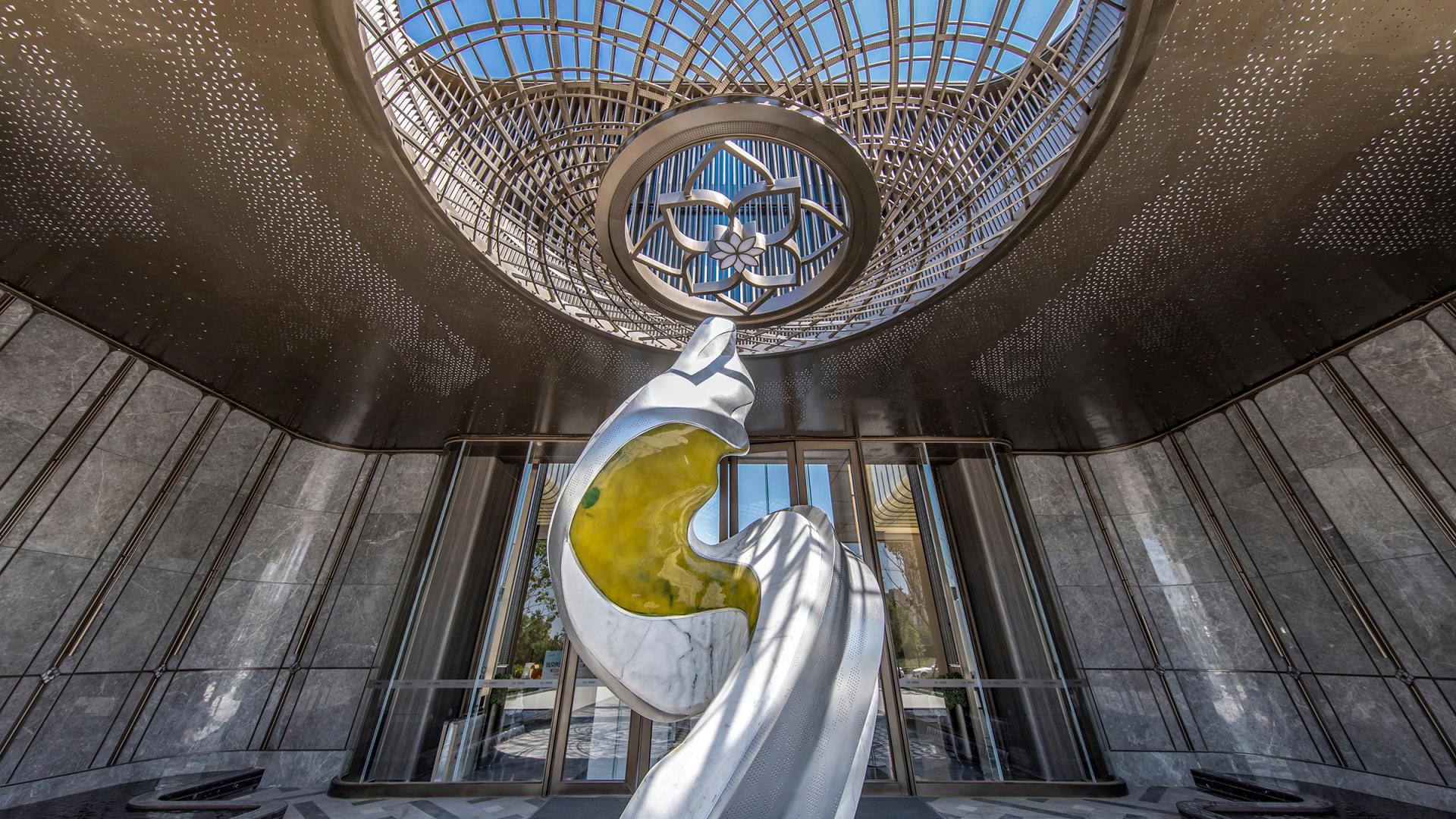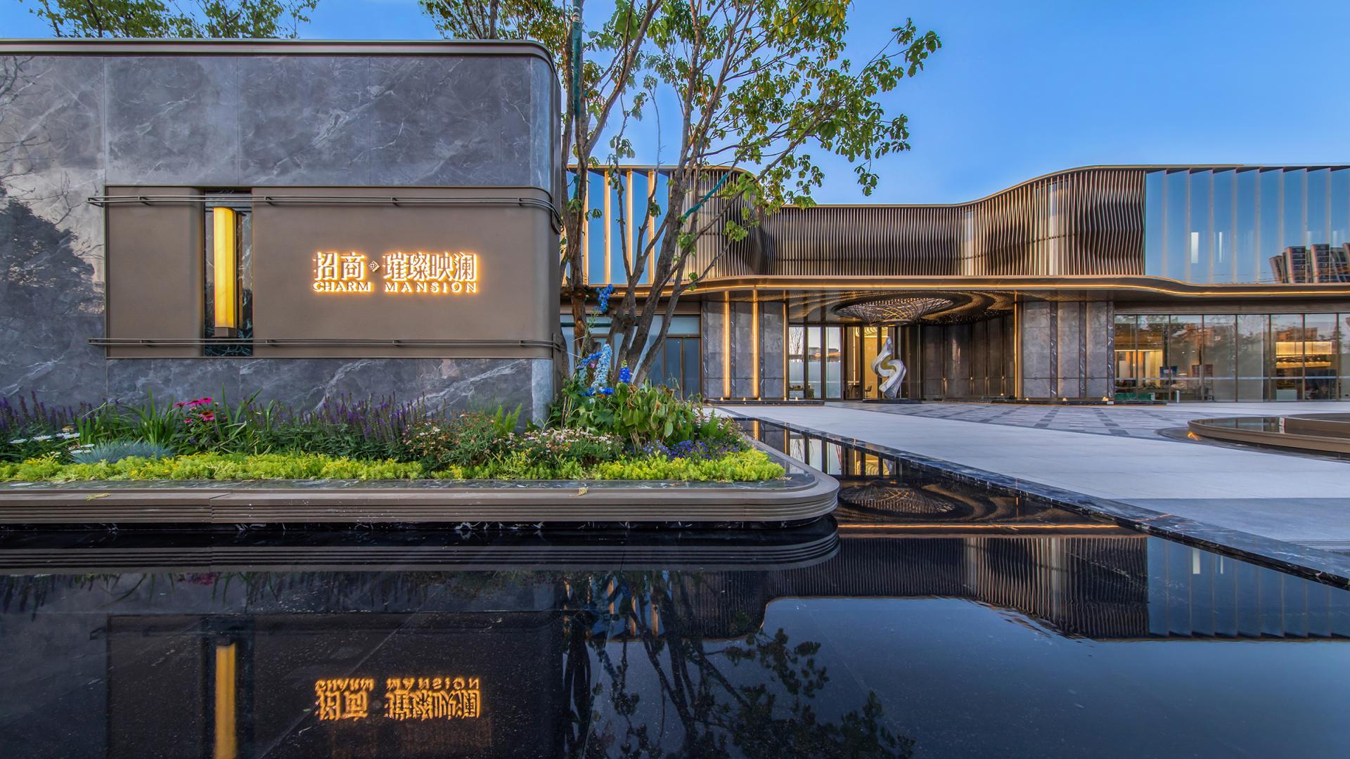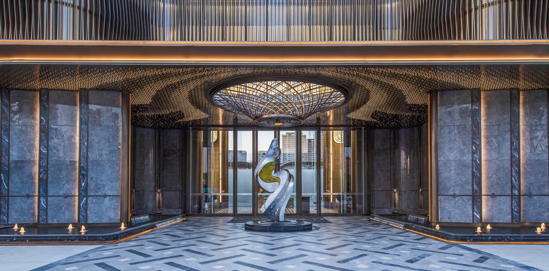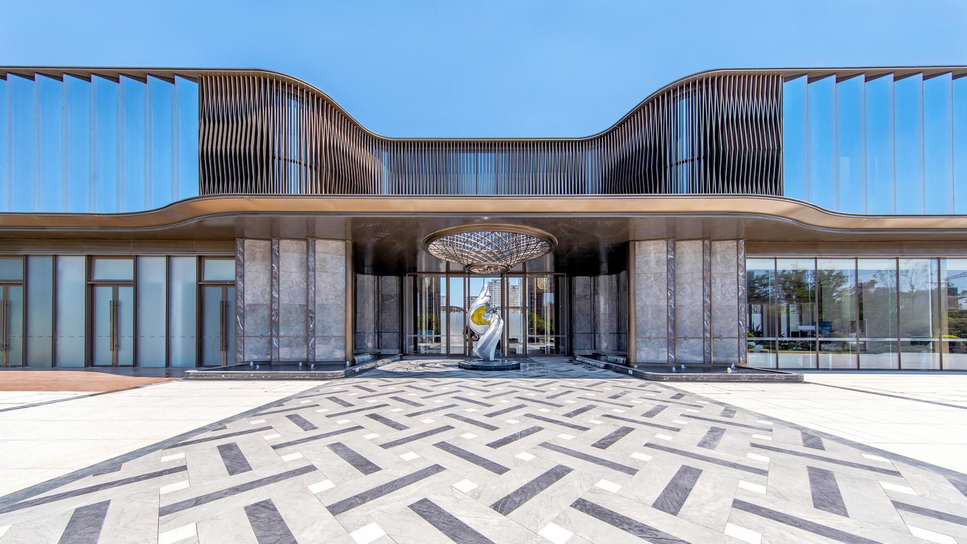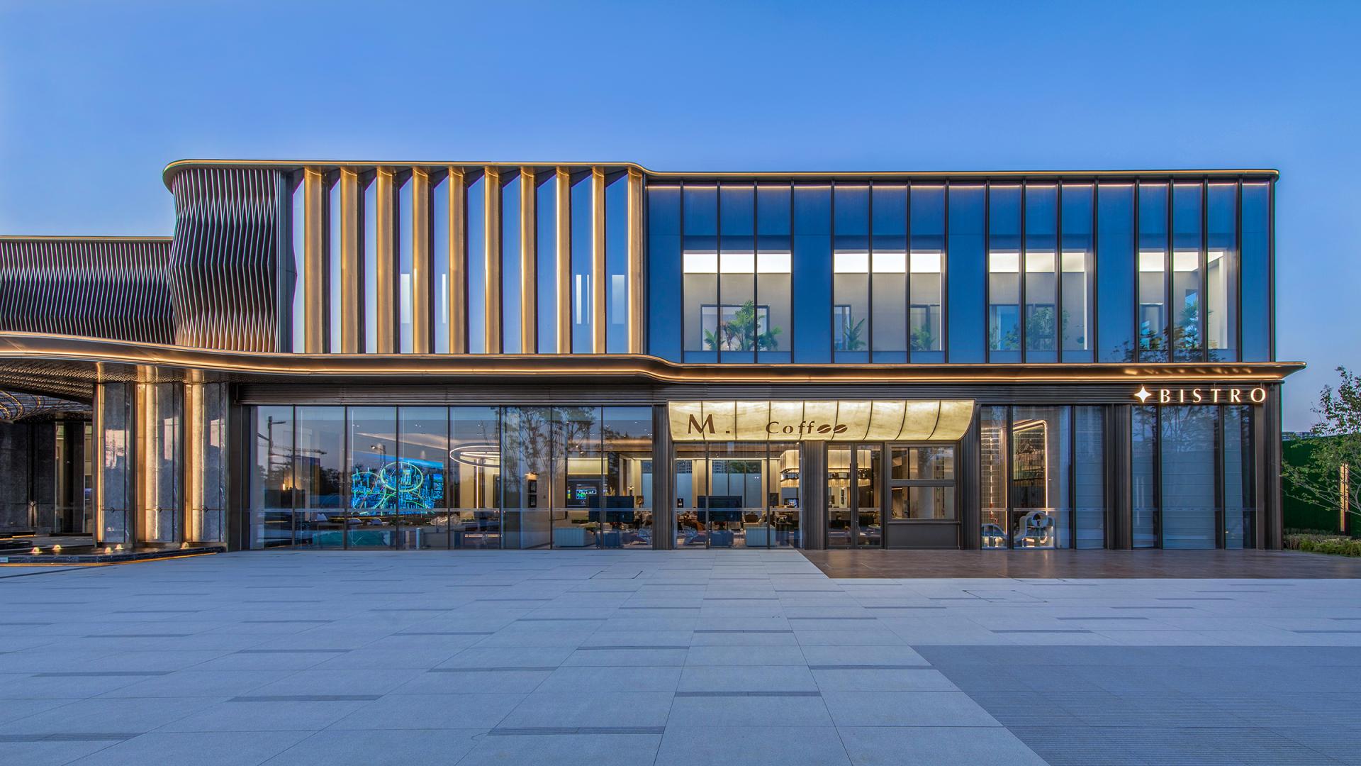 The project features an innovative curtain wall system using high-reflective glass and perforated aluminum panels, which captures natural light, shadows, and the urban skyline. At the entrance, a parametrically designed bronze petal-shaped starry ceiling is paired with a luxury stone curtain wall and a flower-shaped logo, symbolizing auspicious meanings. The secluded backyard courtyard is designed with vintage warm tones, an arbor inspired by the city flower (rose), cascading water features, dry streams, and an arch bridge, providing a multi-dimensional garden experience.