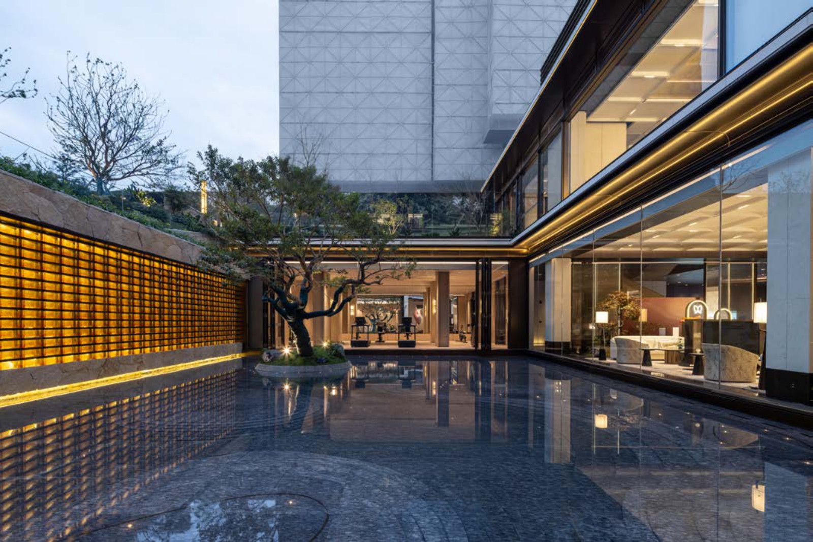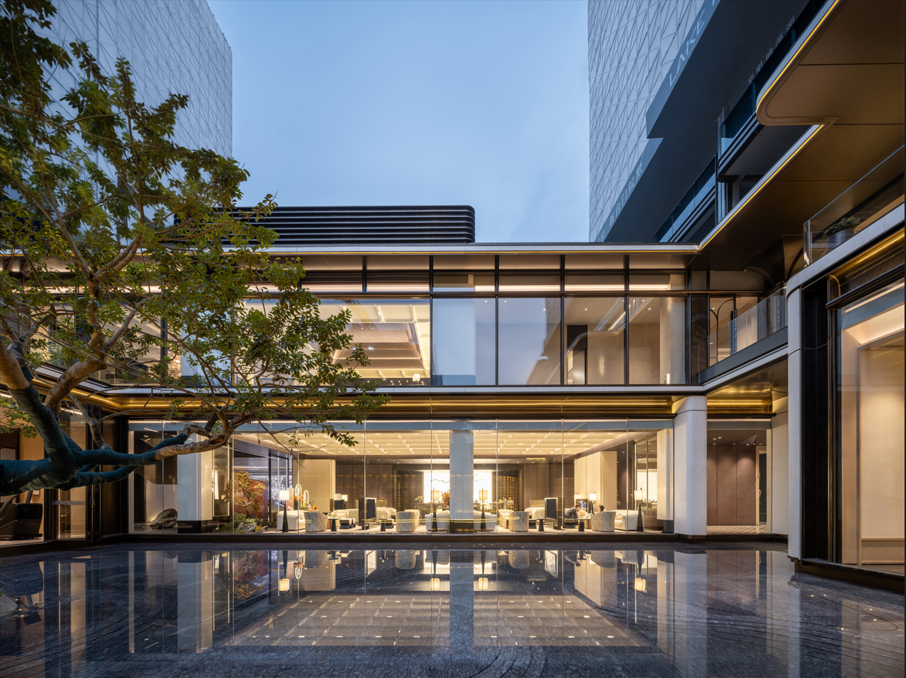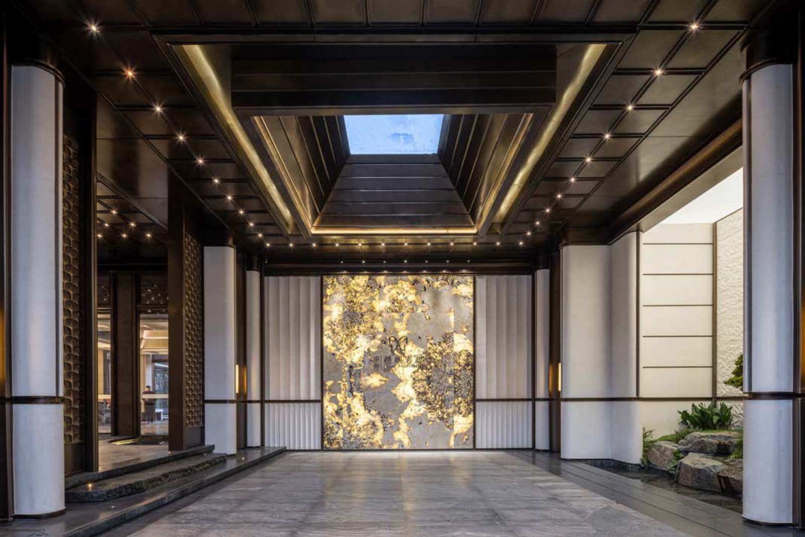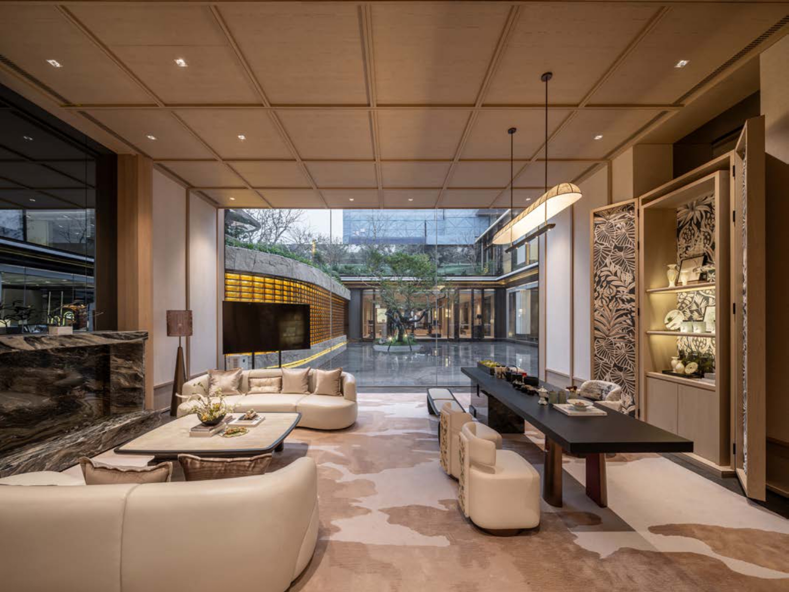 The pedestrian gateway is deliberately off-axis and approached by a turning path, evoking the experience of “winding path leads to a secluded quiet place” of Jiangnan gardens. In the reception lounge a partial raise of the mid-zone ceiling preserves sightlines from neighboring residence building while amplifying the sense of interior spaciousness. A super-scale glass curtain wall at the core dissolves the boundary between inside and outside.