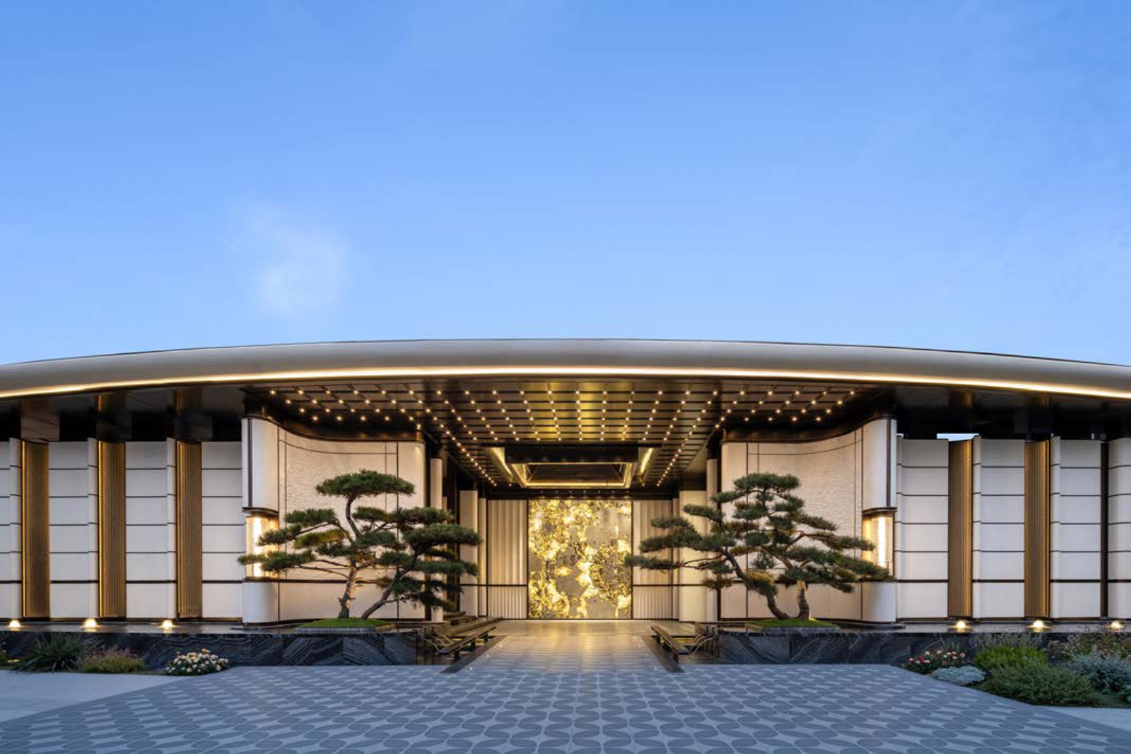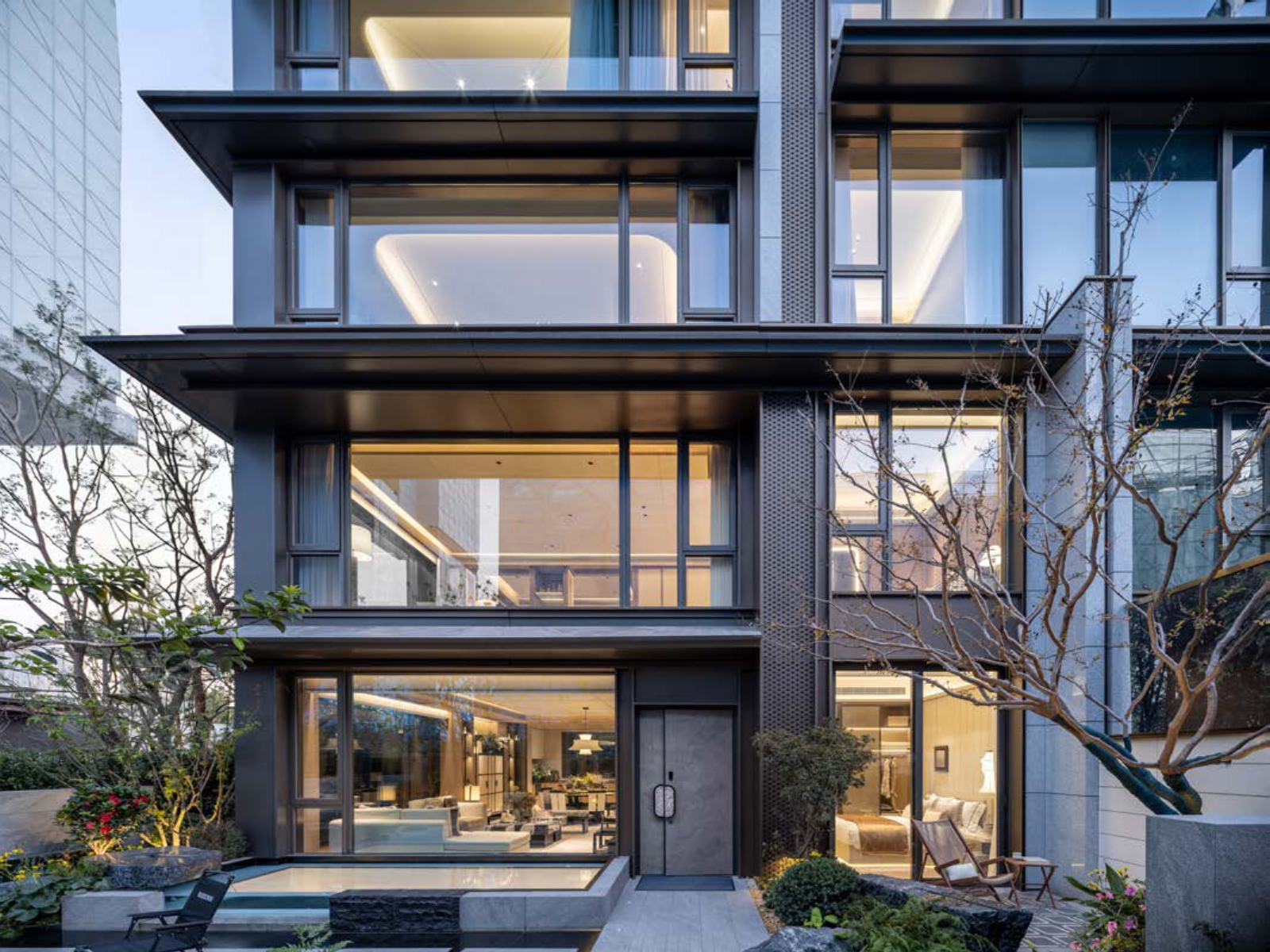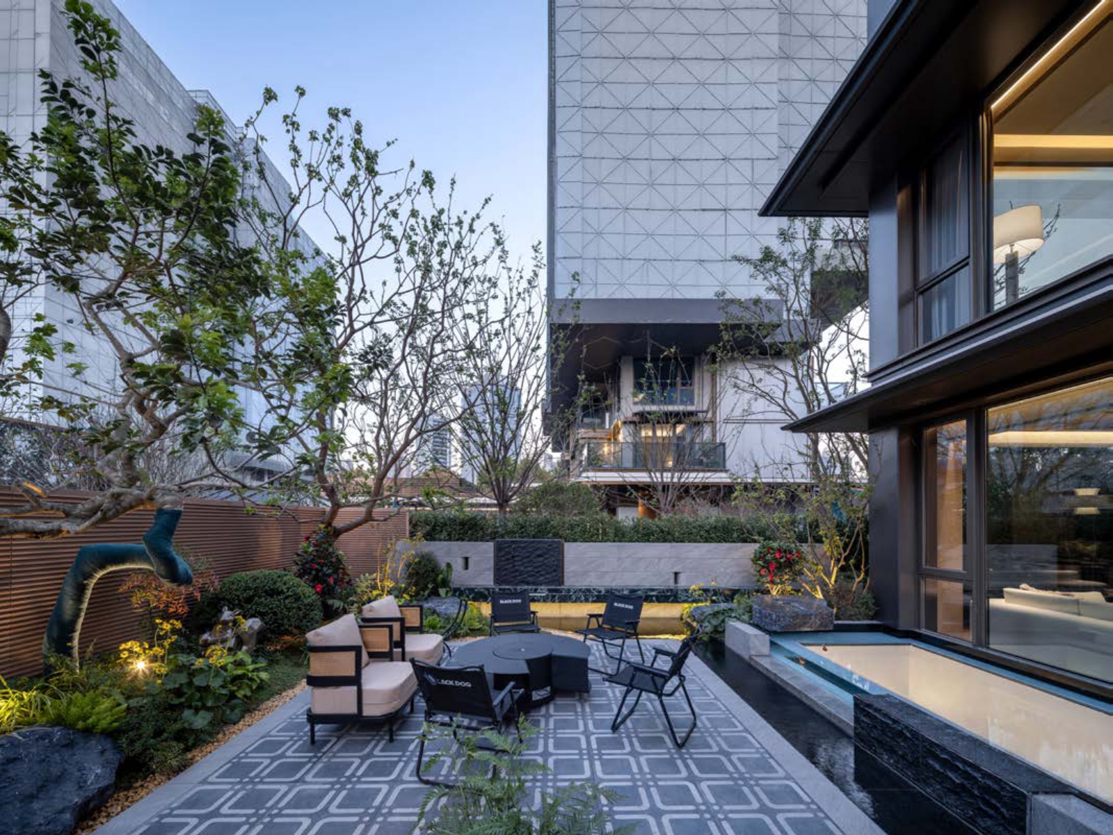 The pedestrian gateway is deliberately off-axis and approached by a turning path, evoking the experience of “winding path leads to a secluded quiet place” of Jiangnan gardens. In the reception lounge a partial raise of the mid-zone ceiling preserves sightlines from neighboring residence building while amplifying the sense of interior spaciousness. A super-scale glass curtain wall at the core dissolves the boundary between inside and outside.