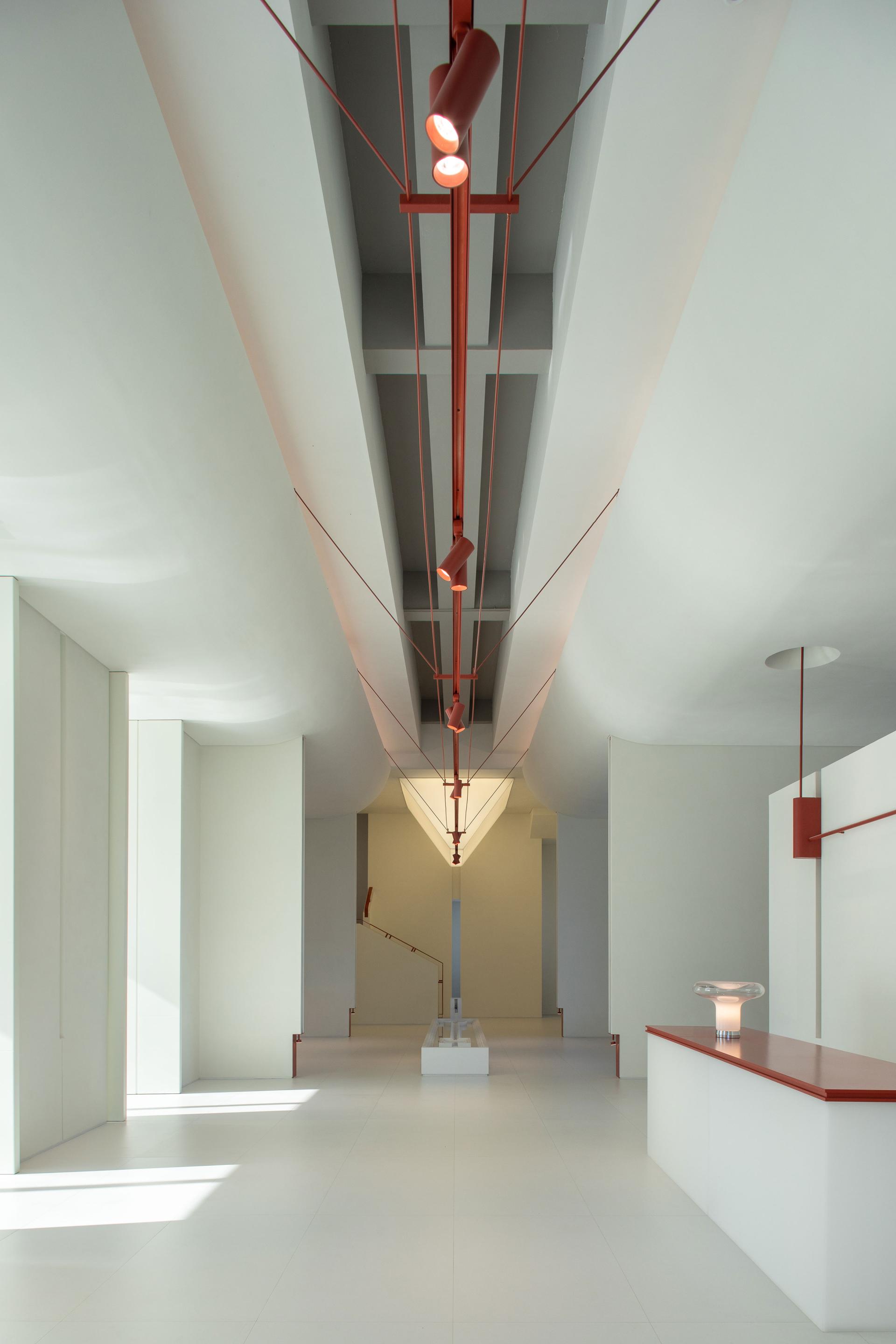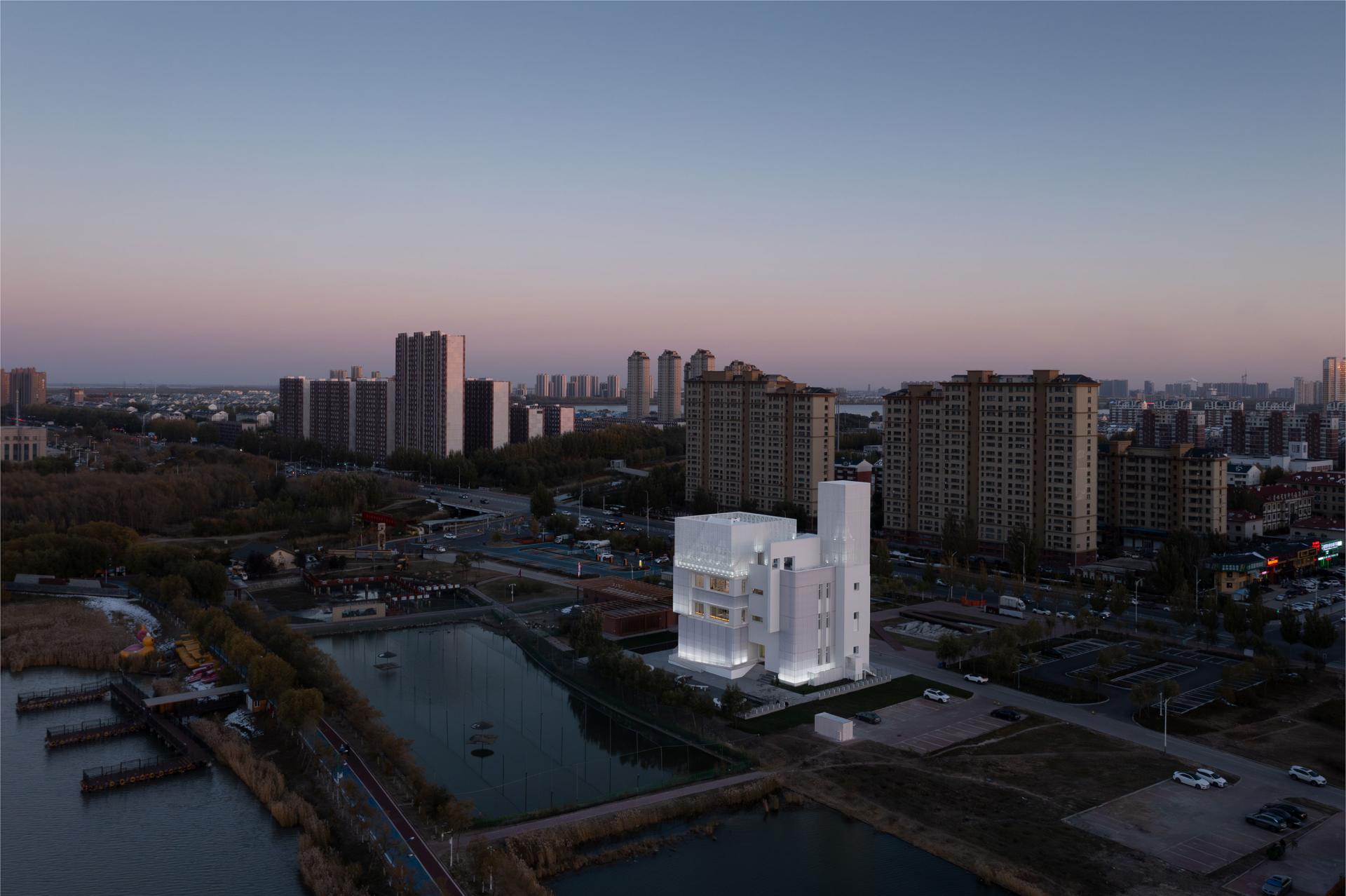 Guided by the principles of minimal intervention and structural preservation, the design fully retains the original structural system. A new envelope composed of lightweight white corrugated panels and perforated metal screens is applied to the exterior, subtly pixelating and visually dissolving the building’s mass. This restrained façade strategy not only responds, through a contemporary architectural language, to Daqing’s identity as an “Ice and Snow City,” but also creates the impression of a volume gently floating along the lakeside. Internally, the building is reprogrammed to better accommodate contemporary urban life, transforming a once vacant and single-purpose space into a hybrid “urban living room” that integrates an art exhibition hall, the local brand Meng Café, public reading areas, and spaces for cultural salons. As a unifying visual motif, red metal elements run through all levels of the interior, subtly translating and paying tribute to Daqing’s deep-rooted petroleum industrial heritage.