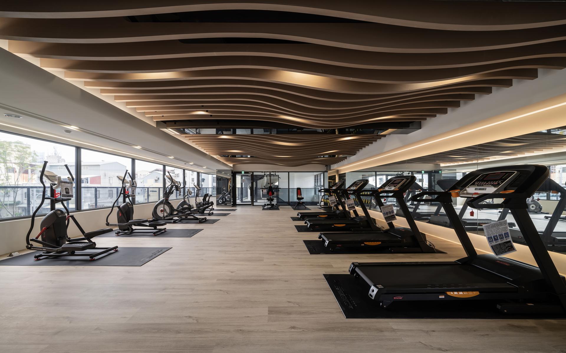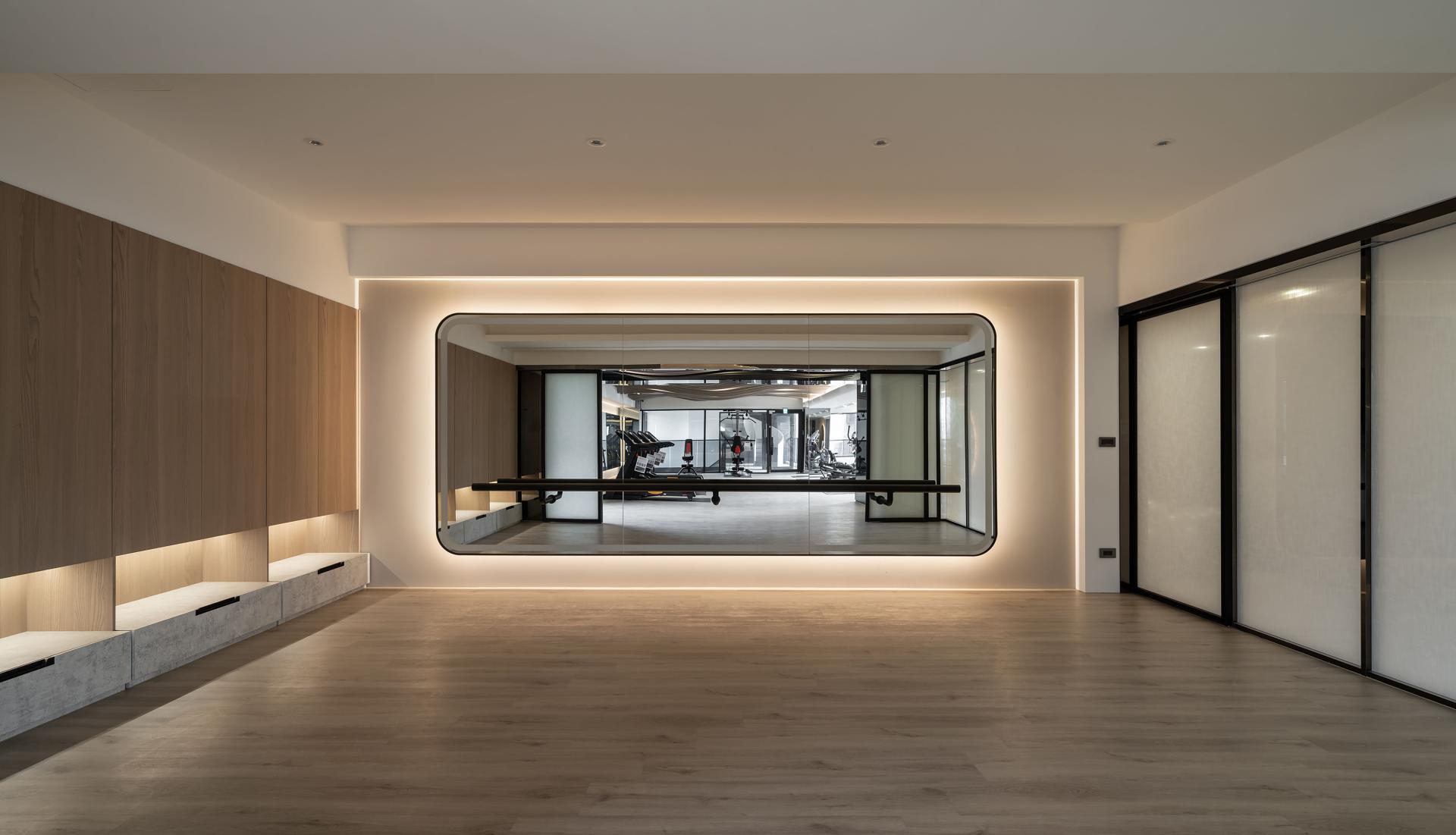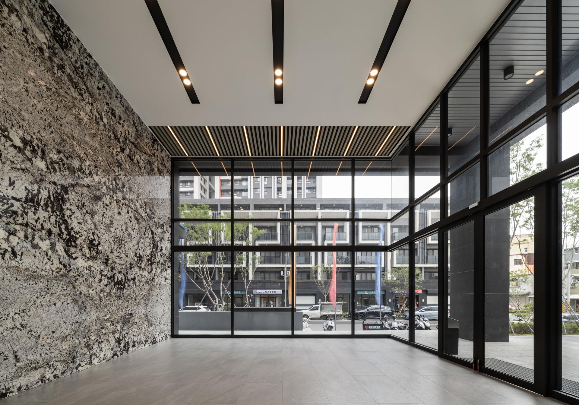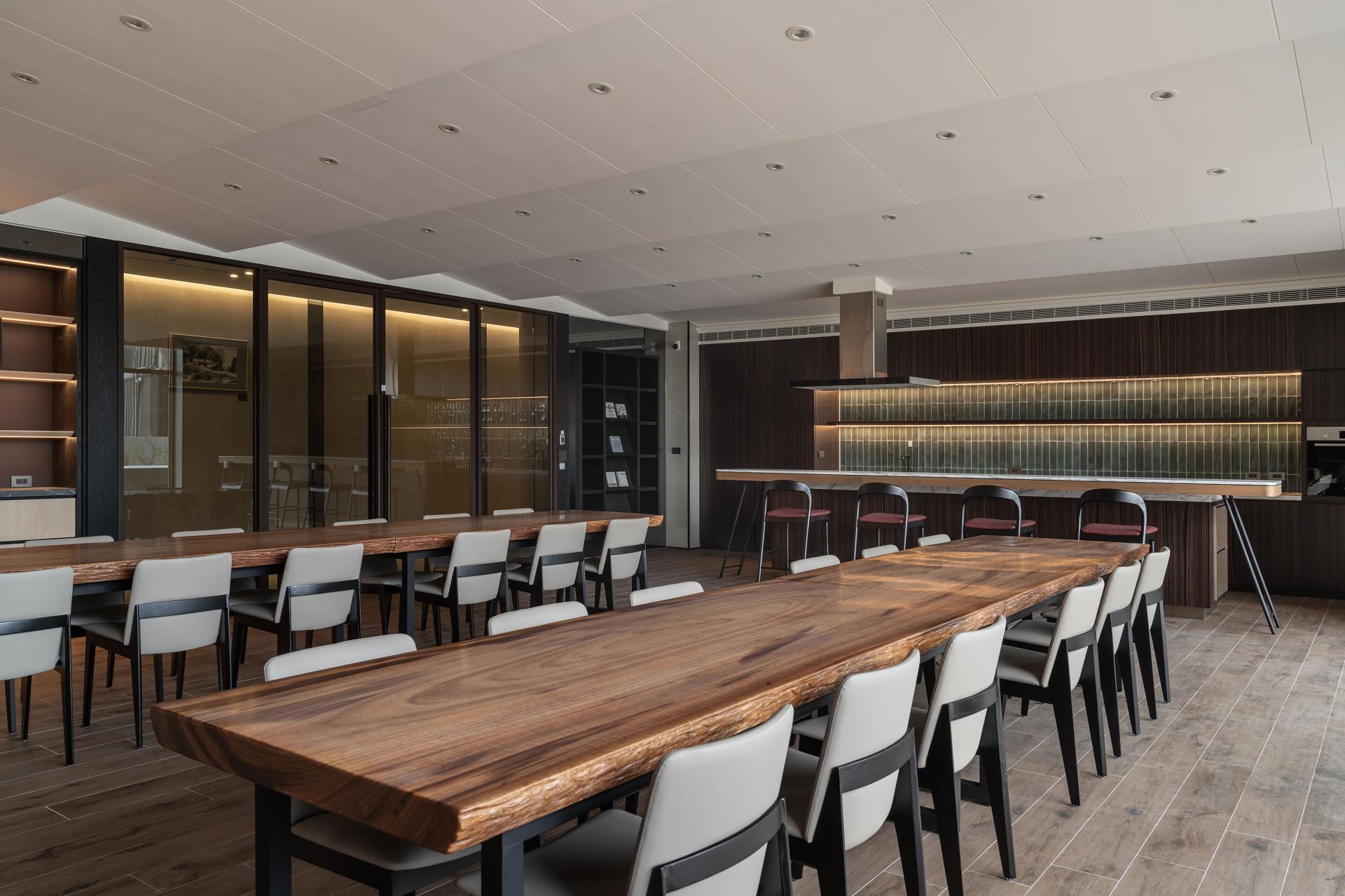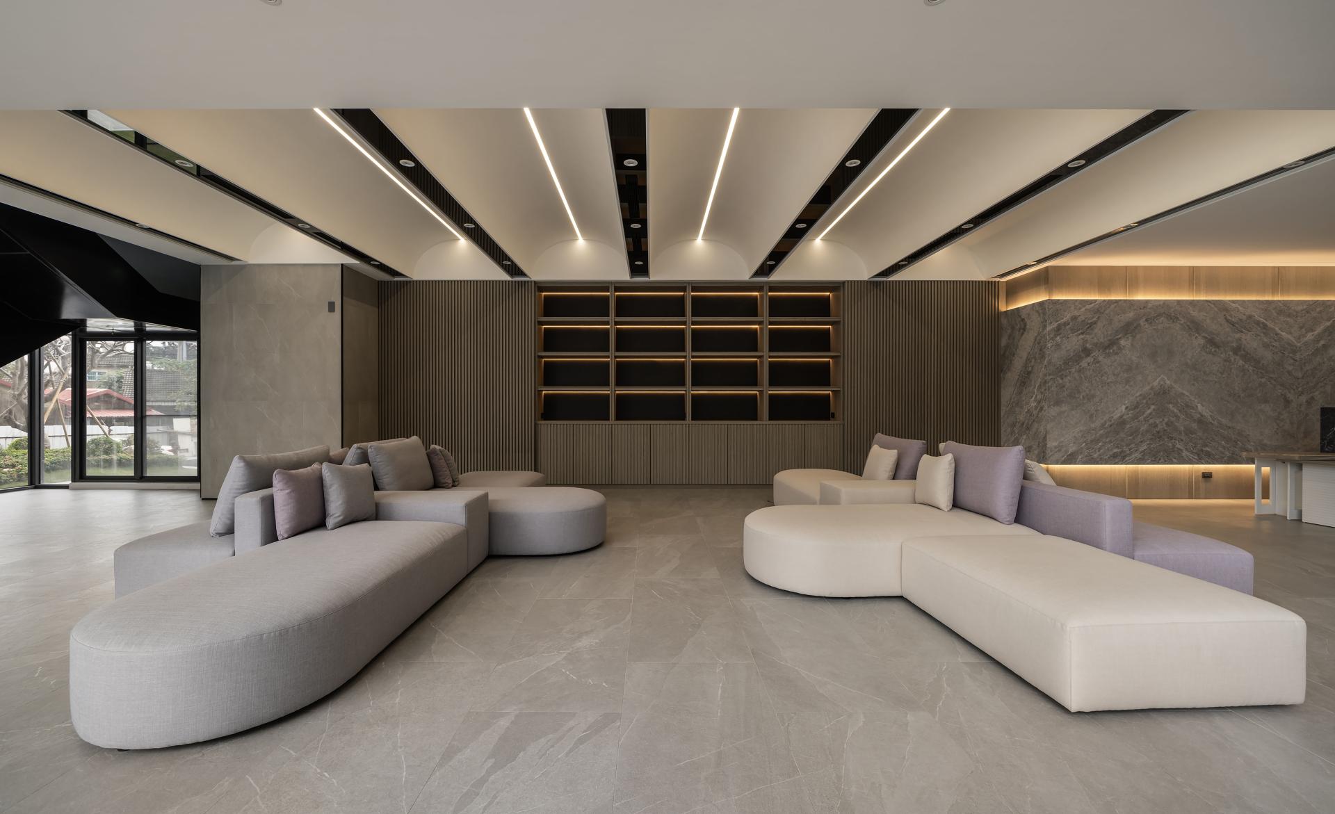 The entry feature wall showcases book-matched marble, its natural veining unfolding like ink-wash gradients. Paired with the soft translucency of laminated fabric glass, the composition balances solidity and lightness. In the corridors and lounge areas, warm timber cladding and vertical slatted screens soften the coolness of stone and add a sense of comfort. Titanium-coated stainless steel and blackened metal trims mark transitions between materials, refining edges and connecting elements with quiet minimalism. Stone is the primary language of the space. Glass, metal, and natural wood add rhythm and nuance. As residents return home, these shifts in material and light guide their minds toward calm, grounding their mood and easing them into rest. The project reimagines condominium amenities, shifting from single-purpose rooms to multifaceted lifestyle environments. The lobby adopts an open configuration. Dual-aspect sofas and swiveling lounge chairs form an island layout that encourages fluid movement and varied social interactions. This arrangement removes directional restraint and supports everything from casual family time and neighborly gatherings to solo reading and quiet relaxation. It creates an authentic living room for the community. On the first floor, the multifunctional study area centers on a flexible circulation loop and a dual-height bar counter. The counter accommodates both seated and standing options and serves as a workspace, demonstration platform, or display zone. Hidden storage, mobile seating, and stroller- and wheelchair-friendly paths let the space support cooking workshops, parenting classes, community events, and more. On the second floor, the gym and yoga room have movable partitions that shift between focused exercise zones and shared multiuse areas, significantly enhancing spatial efficiency. Material selection returns to natural foundations. Durable, low-maintenance stone, timber veneer, and metalwork combine with FSC-certified wood to create a low-carbon framework. Energy-saving strategies shape the architectural planning. Carefully placed openings and natural ventilation routes reduce dependence on artificial lighting and mechanical cooling. The lighting system uses zoned controls and occupancy sensors. Hallways and library walls activate LED fixtures according to foot traffic. The yoga room uses indirect lighting to create a serene ambiance. This adaptable lighting approach lets residents tailor the environment to their needs.