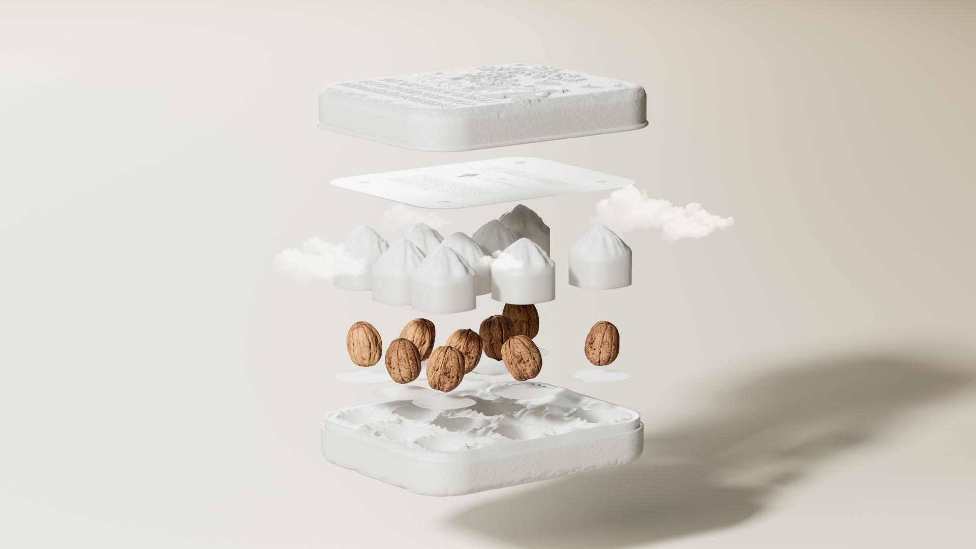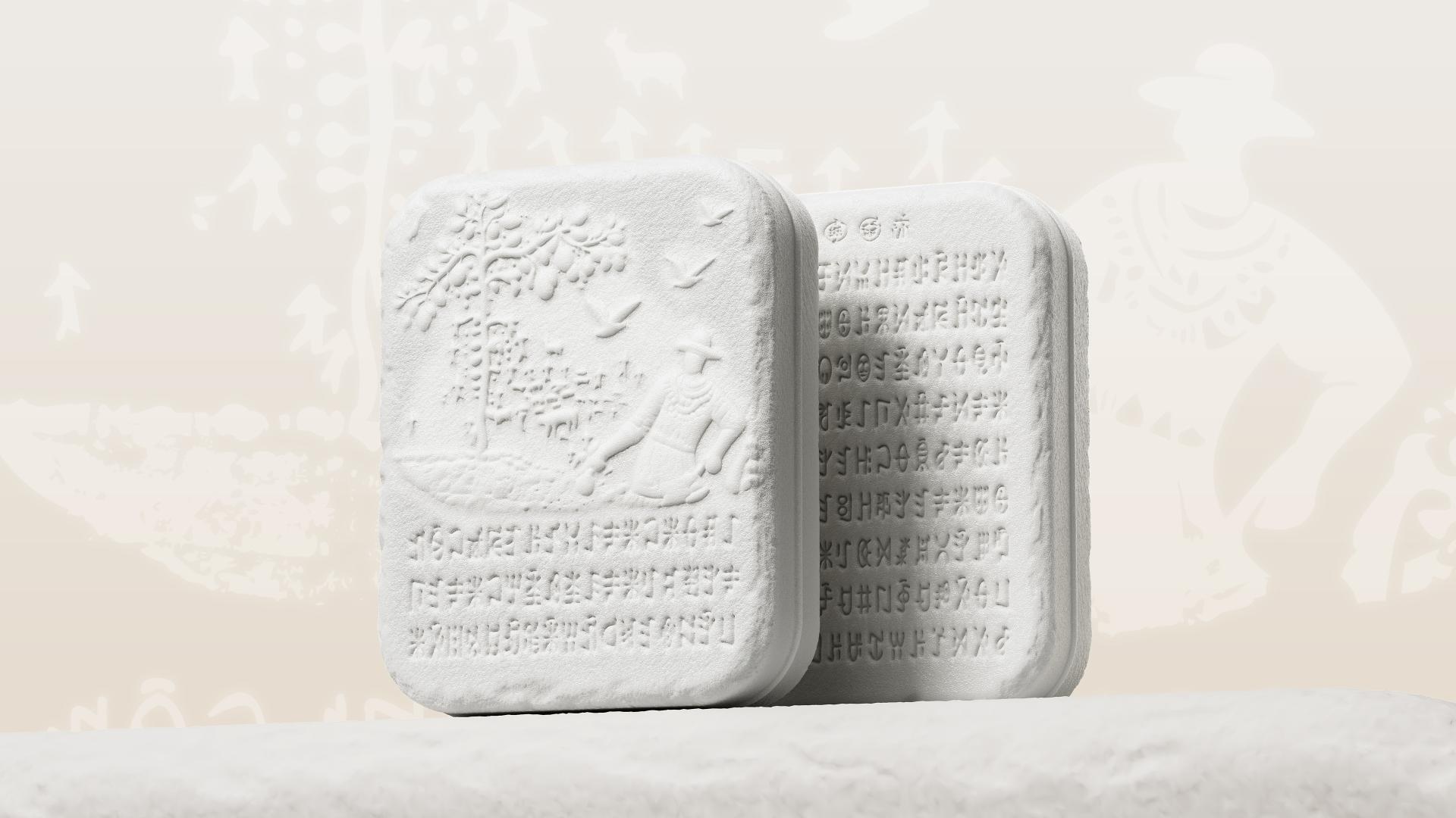 This Millennium Walnuts packaging design takes ancient civilization as its narrative point of departure. The cover draws from Neolithic cliff paintings—key archaeological remains of the Cang–Er civilization—which vividly depict Yi ancestors harvesting walnuts, climbing trees, and striking the fruit from branches. From the Western Jin dynasty’s Bowu Zhi, which records the historical spread of walnuts, to the unearthed ancient walnut wood in Yangbi verified through C14 dating, evidence from different eras converges to trace a continuous history of coexistence between Yangbi and walnuts. Here, walnuts have flourished for millennia. By systematically translating cliff art, classical texts, and archaeological proof into contemporary packaging language, the design becomes a visual medium of historical memory—imbuing Millennium Walnuts with a tangible sense of time and cultural depth. This design systematically incorporates Yi pictograph-like characters and constructs a unified visual system with ancient elements such as rock cliff paintings, graphic symbols, and woodcut forms. The design deliberately eschews commonly used text, opting instead for a language of images and symbols that is closer to prehistoric methods of communication, returning the packaging information to a primitive state of "seeing-perceiving-understanding." The profound historical flavor endows this packaging with a unique visual significance, reinforcing the design's historical depth and cultural authenticity. The packaging itself becomes a de-linguistified, non-text-dominant medium for cultural transmission. The overall design is based on a restrained white tone, abandoning complex decorations and retaining only the traces of historical cliff paintings and the undulations of mountain landscapes, allowing humanistic memory and natural texture to coexist in silence. A layer of translucent sulfuric acid paper, like a light cloud, covers the inner tray. As it is unveiled, the mountain-like inner tray is slowly revealed. The progressive structure, akin to the natural moment when the sea of clouds disperses over the Yunnan Plateau and the mountains emerge, transforms the simple act of opening into a new visual perception—creating a visual and emotional transition between clouds and mountains. The packaging structure adopts an innovative pulp molding process. The demolding marks and carved textures naturally formed during the molding process are intentionally preserved to simulate the authentic texture.