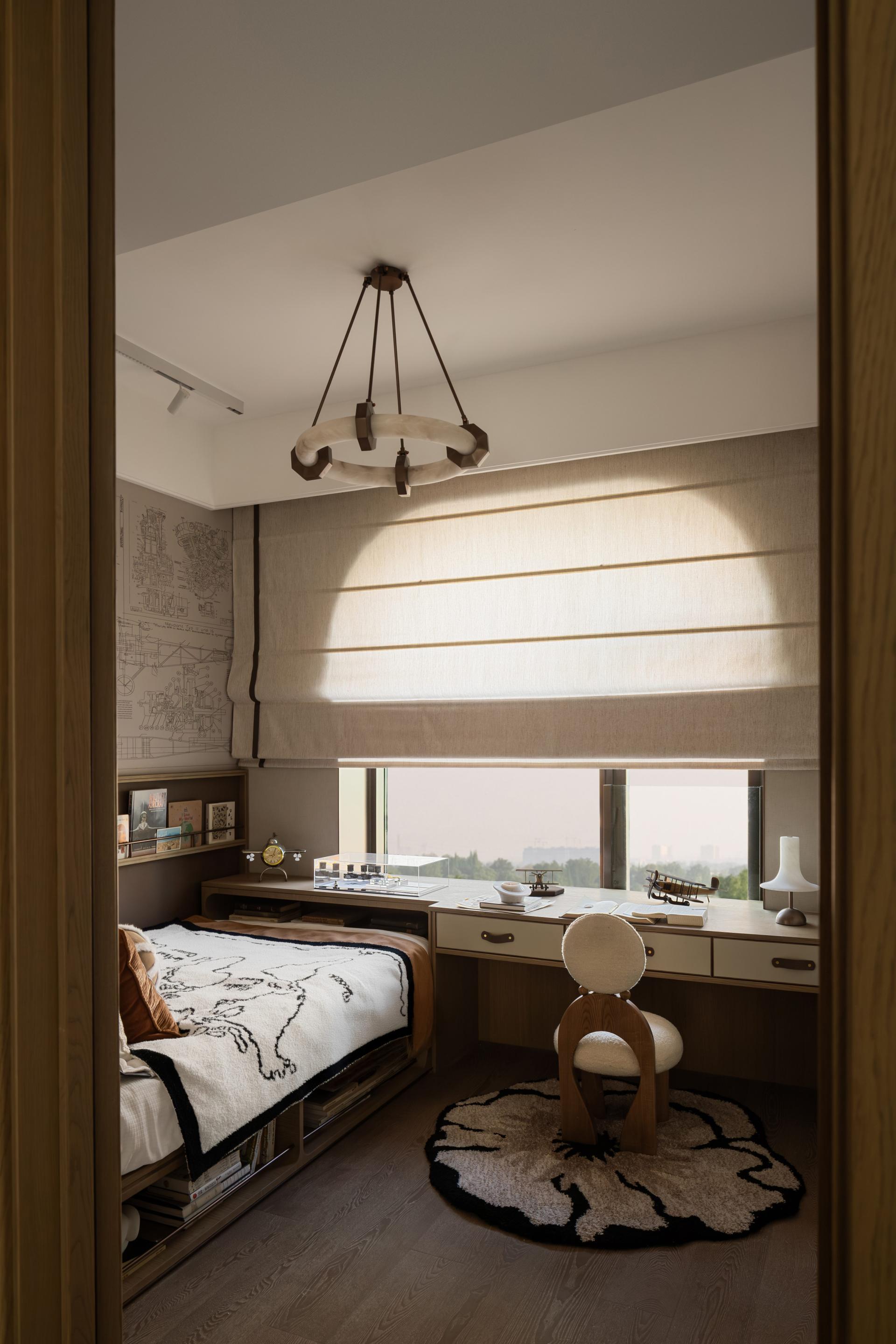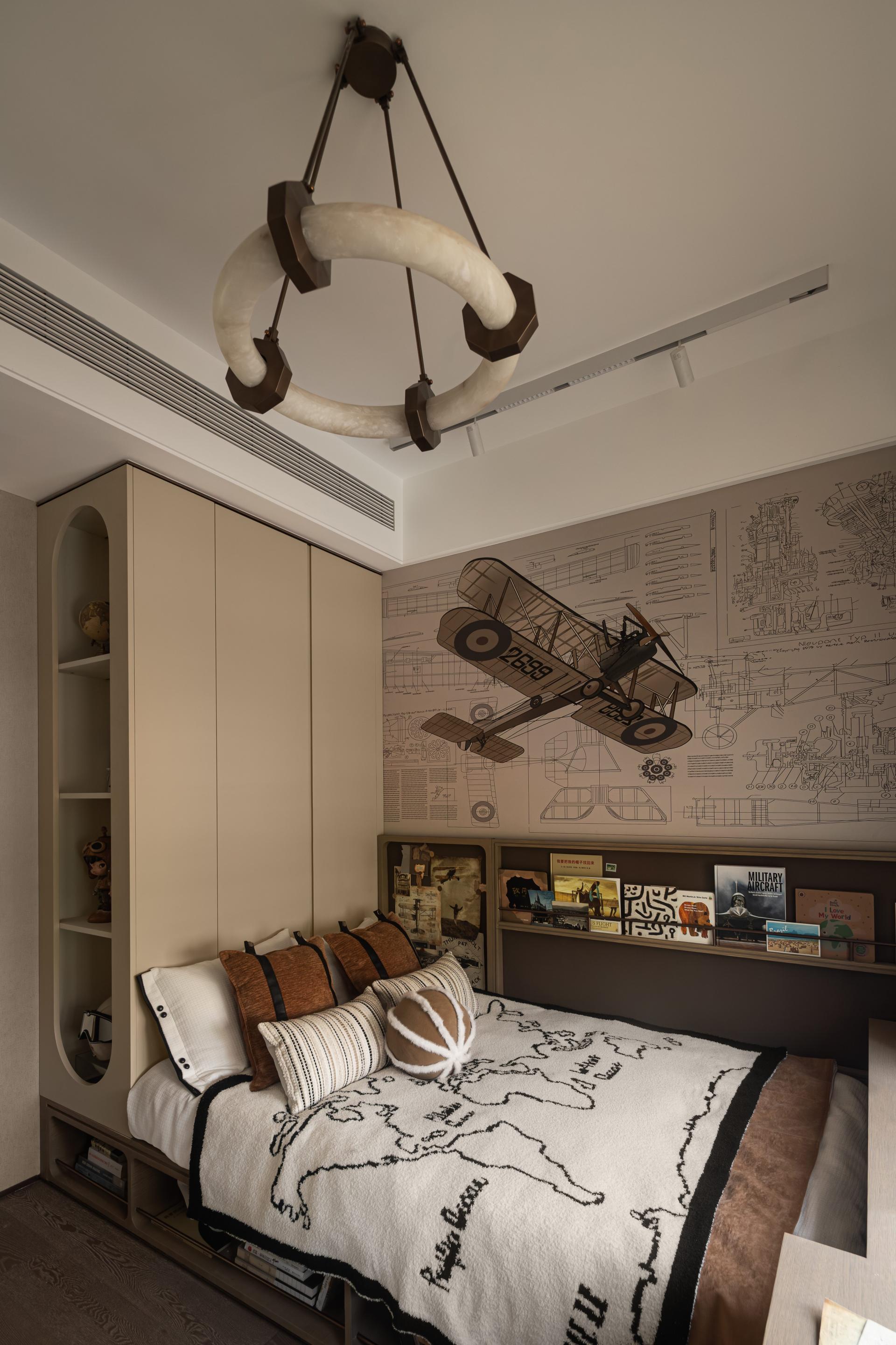 The layout follows the principle of “separation of active and quiet areas” and achieves exceptional space efficiency through an optimized plan, fully meeting the diverse living needs of multi-generational families. The communal area incorporates a flexible “X-space,” creating a multifunctional space that seamlessly integrates a study zone. The children’s room, themed on the world map and complemented by wall illustrations of aircraft blueprints, is designed to spark curiosity and ignite imagination in young minds.