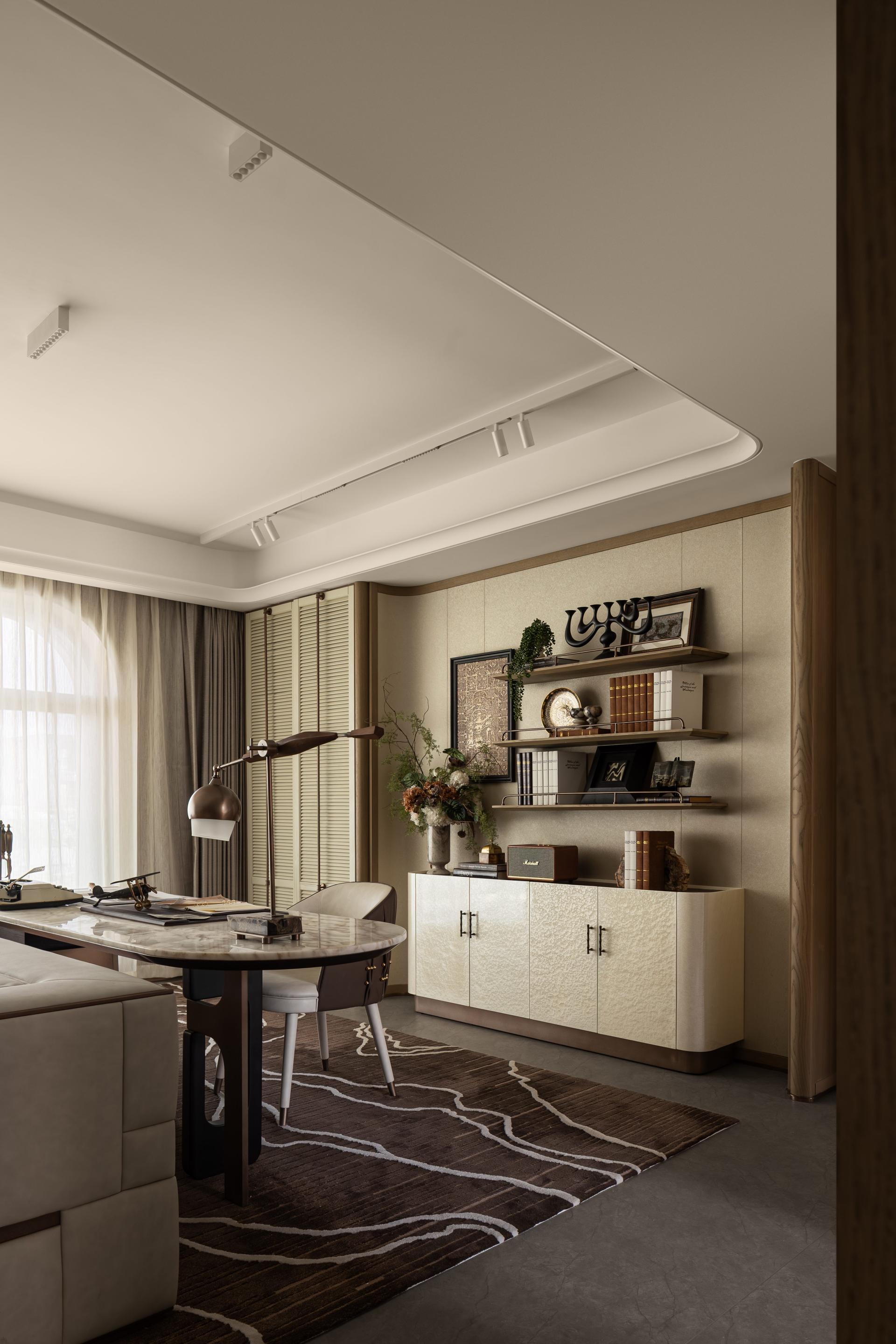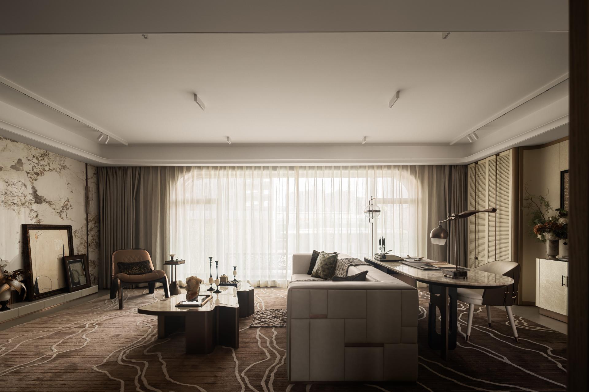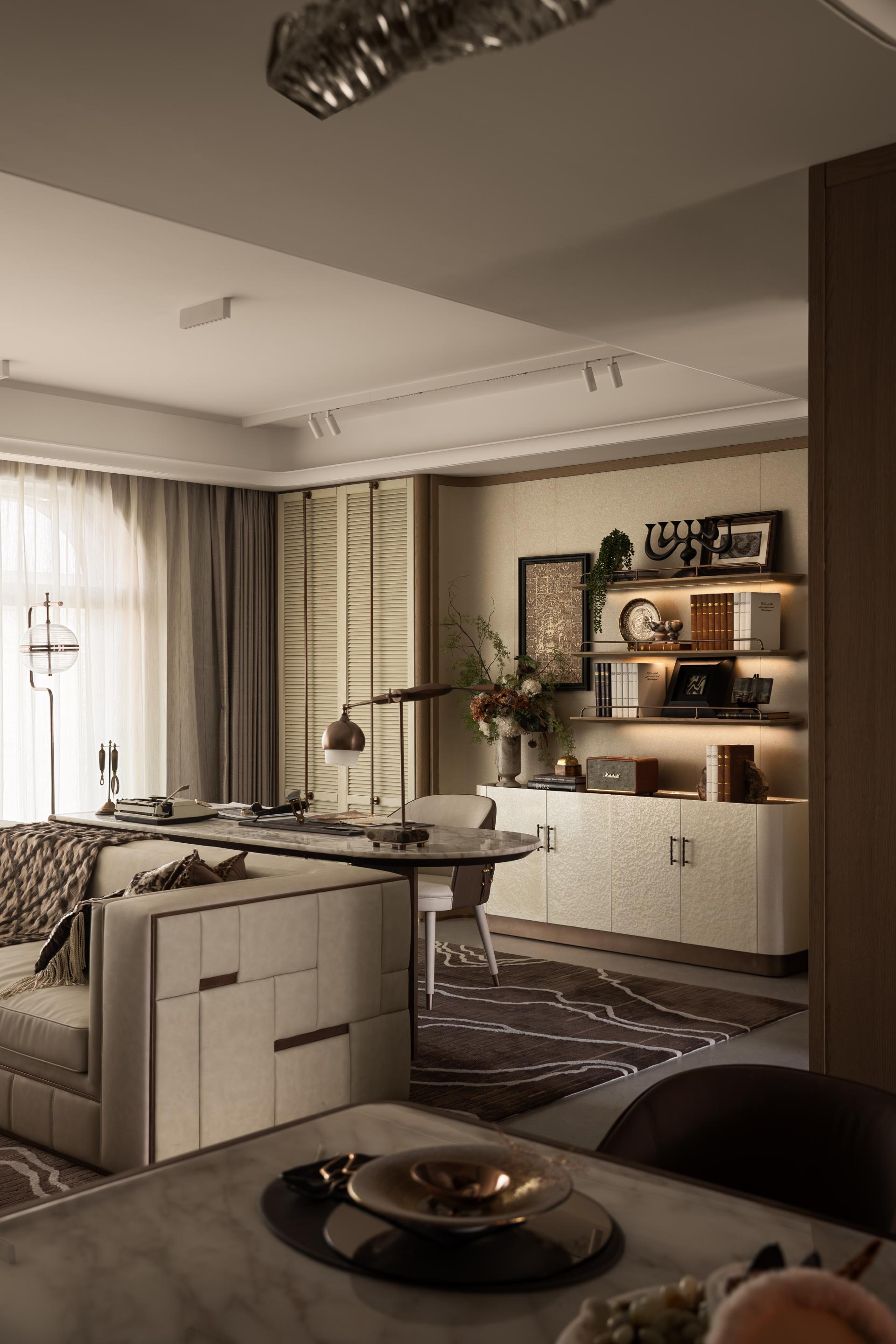 The narrative of the space begins with “a door and a ray of light,” symbolizing stepping into a tranquil and elegant river of culture. The overall palette employs low-saturation earth tones, evoking associations with profound and serene history. The spatial dimensions are thoughtfully designed to give a sense of calm and inclusiveness right from the entrance. In terms of material selection, warm wood, distressed metal, and cold marble harmonize beautifully, improving visual layering while creating a soft modern home atmosphere. At the same time, luxurious details such as customized oiled/waxed leather and textured fabrics subtly highlight exquisite craftsmanship. Additionally, the Wuhan landmark-themed wall hanging is made using intangible cultural heritage techniques like mother-of-pearl inlay, artfully integrating local cultural symbols into daily life.