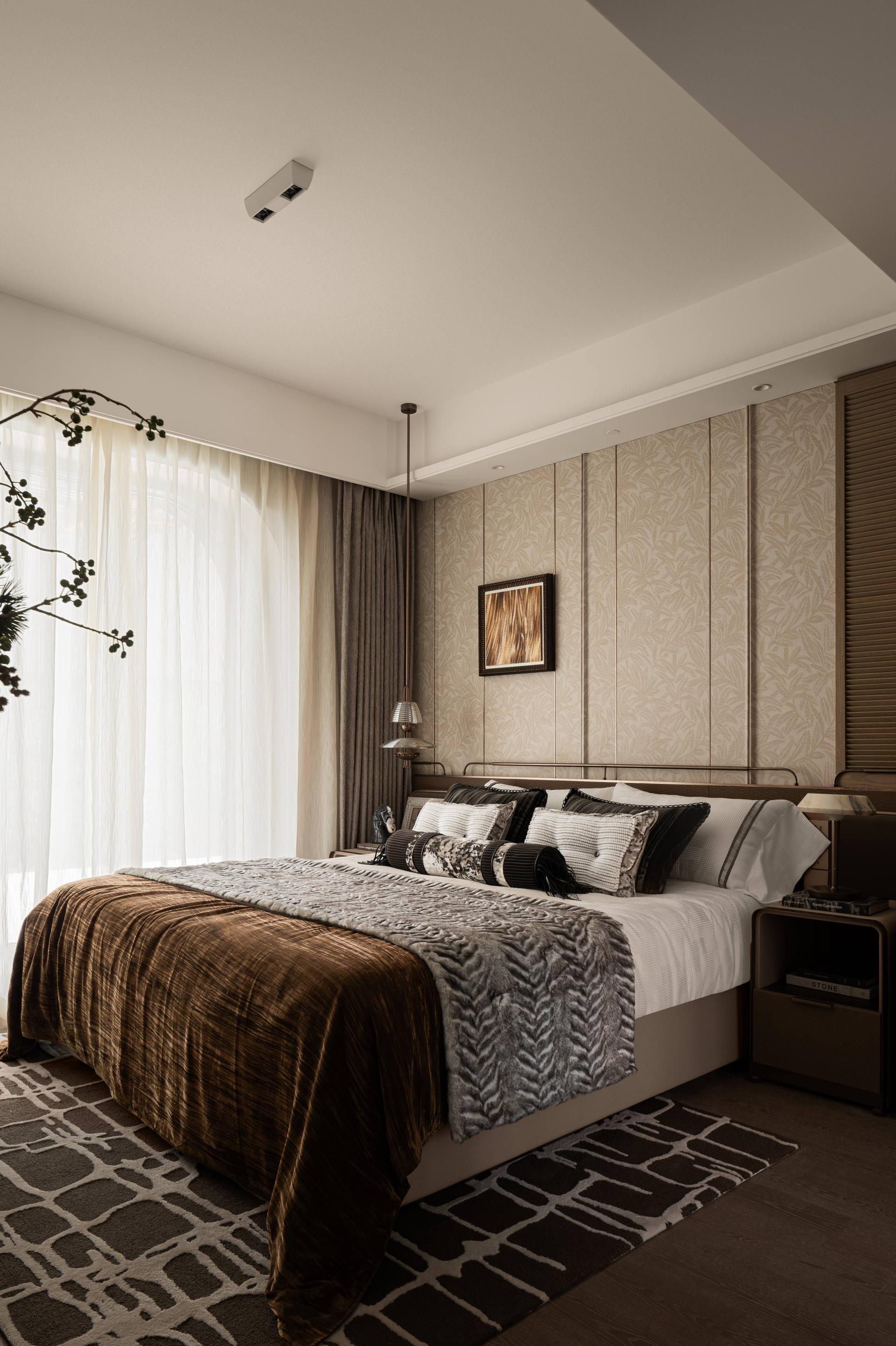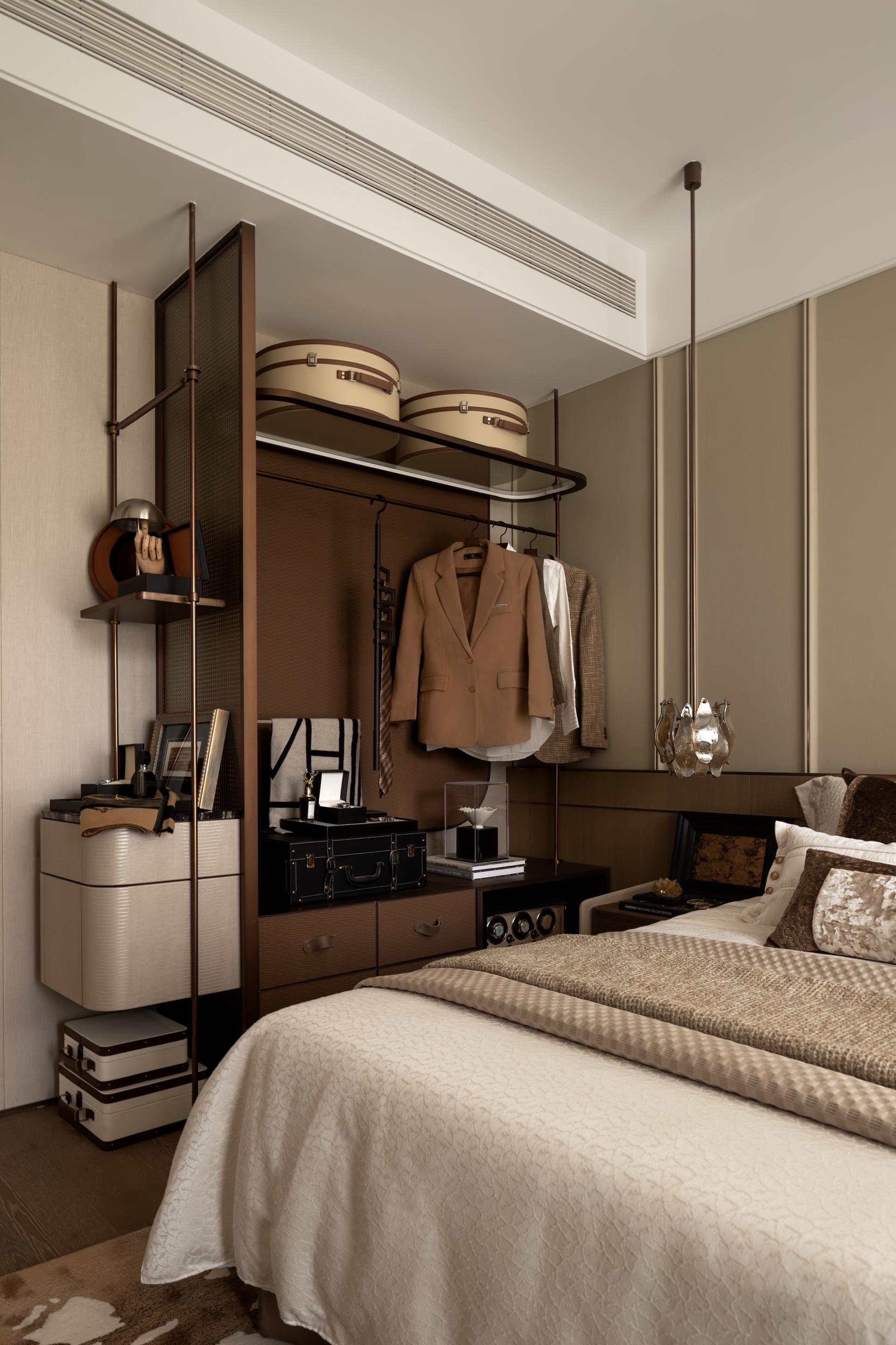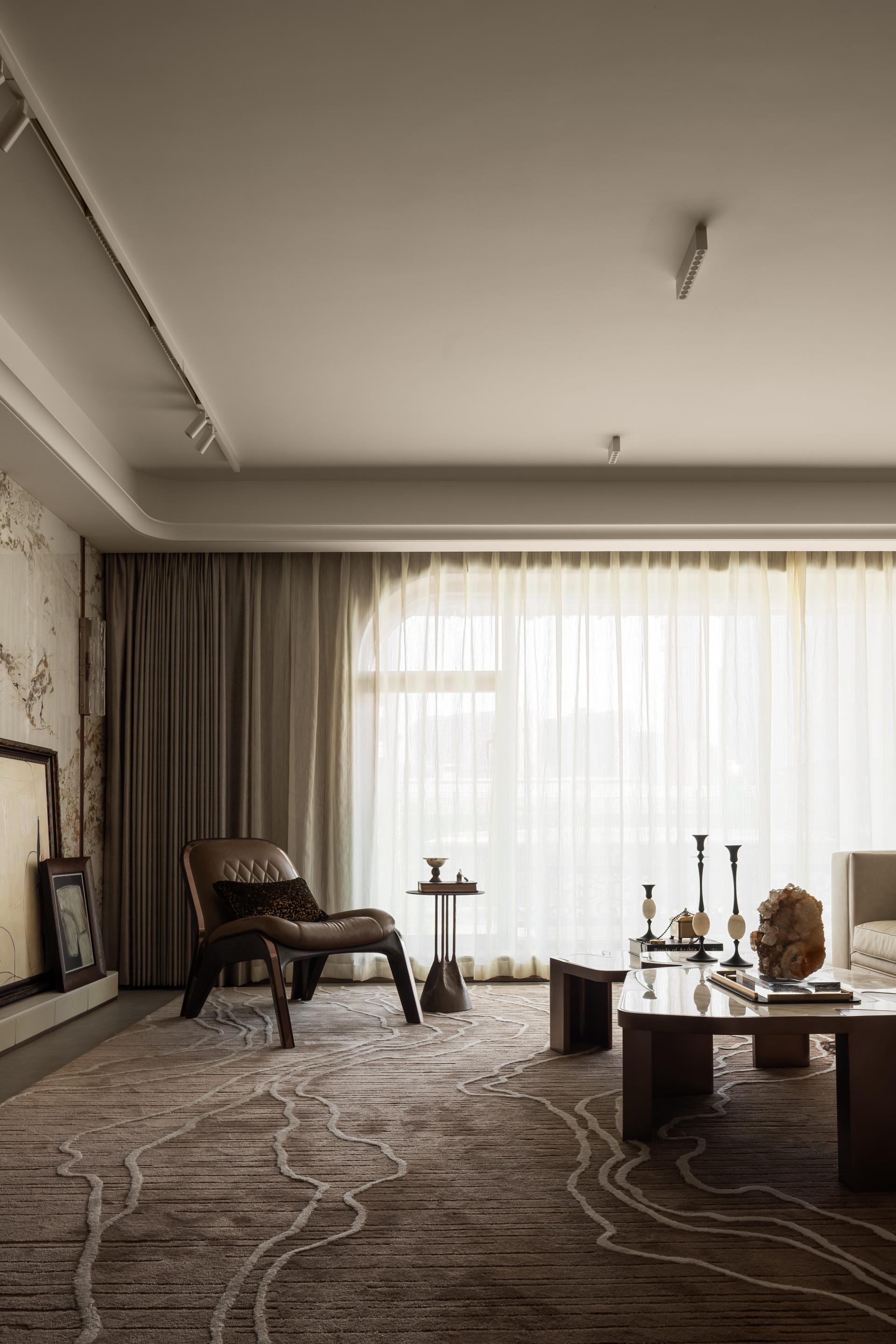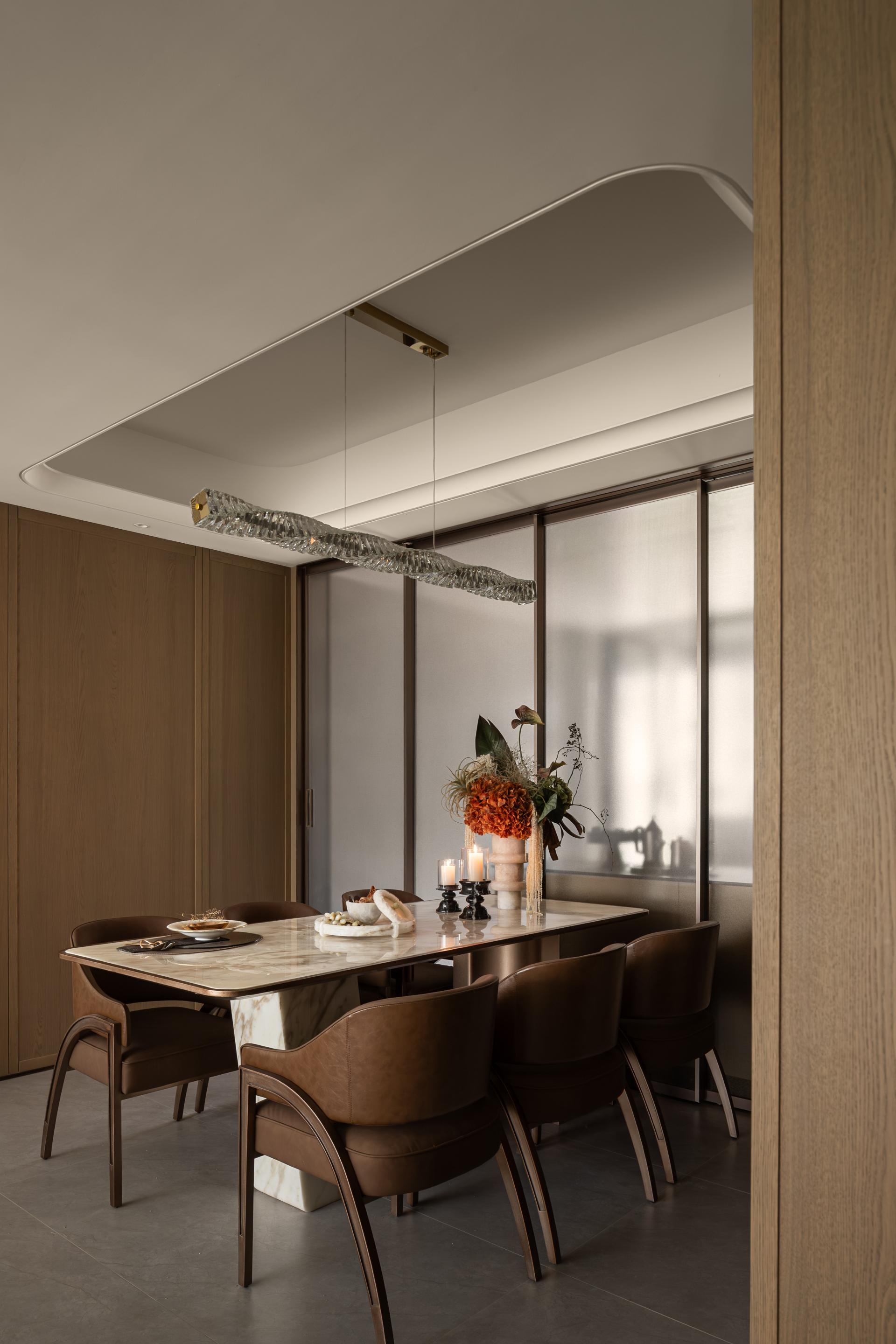 The narrative of the space begins with “a door and a ray of light,” symbolizing stepping into a tranquil and elegant river of culture. The overall palette employs low-saturation earth tones, evoking associations with profound and serene history. The spatial dimensions are thoughtfully designed to give a sense of calm and inclusiveness right from the entrance. In terms of material selection, warm wood, distressed metal, and cold marble harmonize beautifully, improving visual layering while creating a soft modern home atmosphere. At the same time, luxurious details such as customized oiled/waxed leather and textured fabrics subtly highlight exquisite craftsmanship. Additionally, the Wuhan landmark-themed wall hanging is made using intangible cultural heritage techniques like mother-of-pearl inlay, artfully integrating local cultural symbols into daily life.