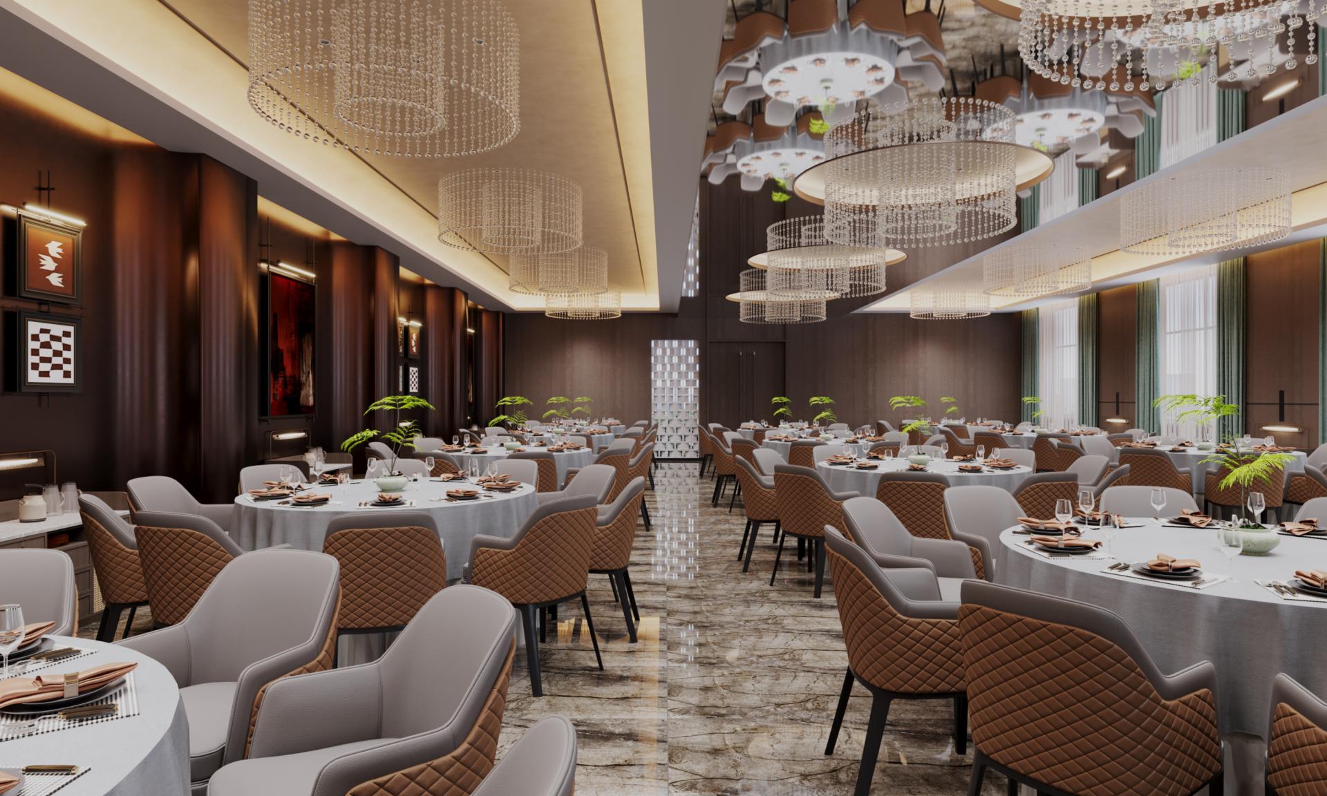 The restaurant's interior design is centered on a light luxury, business-oriented New Chinese style, aiming to create a dining space that combines Oriental charm with modern business sophistication, suitable for business receptions and high-end gatherings. The spatial layout adopts a symmetrical design to outline a sense of order, using semi-transparent art screens and ripple-effect glass partitions to divide functional areas, balancing privacy and openness, and cultivating a calm and elegant business atmosphere.