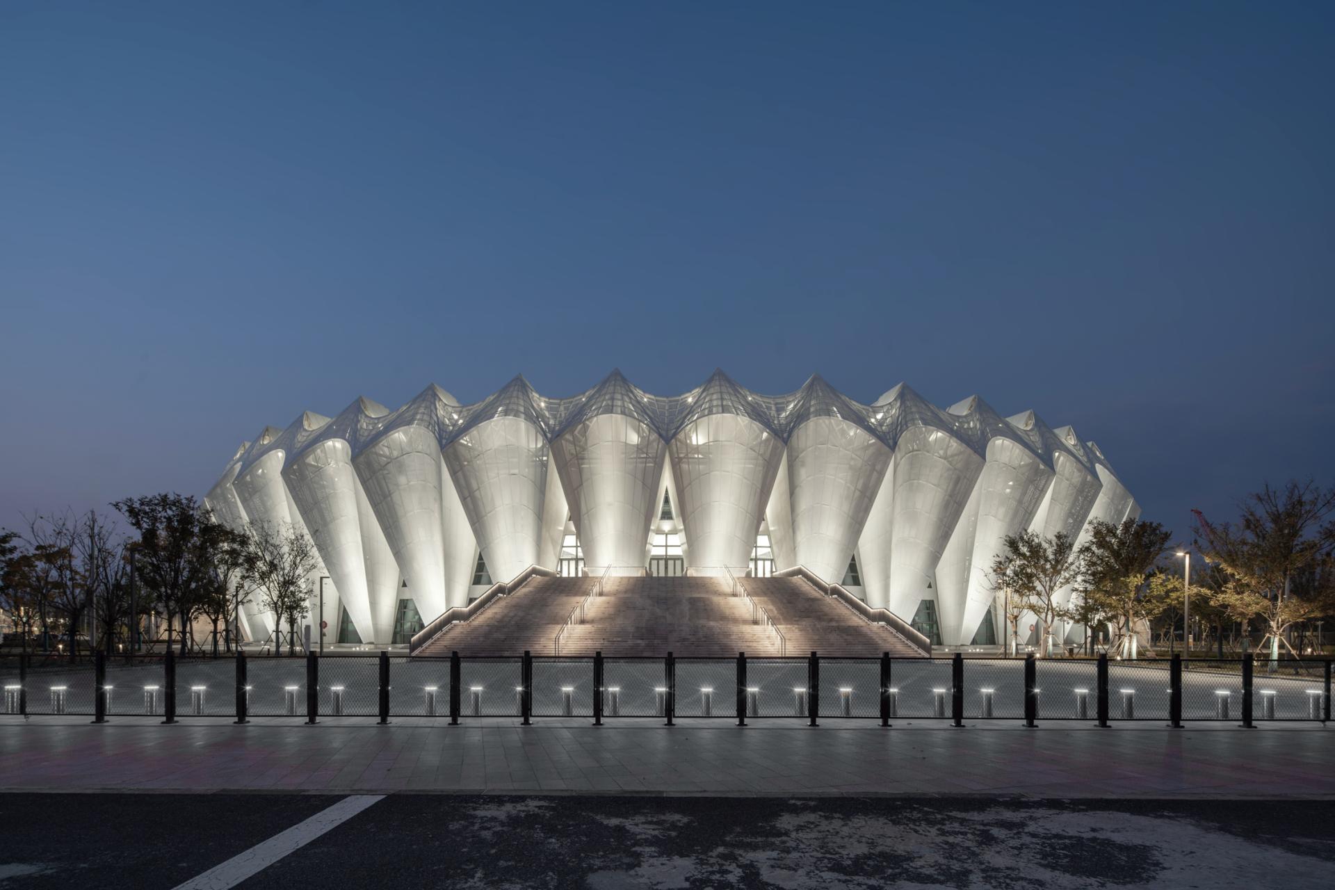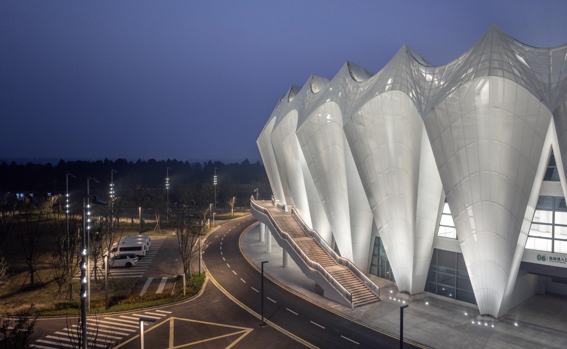 Lighting design closely follows the architectural concept, using light as a sculptural tool to reinforce form and express the spirit of sport. In-ground uplighting enhances the petal-like surfaces, making the image of a blooming flower more vivid at night, while pole-mounted floodlighting softly washes the reed-inspired concave façades, evoking a moonlit landscape. Together, these layers of light transform the building into a luminous crown with a refined artistic quality. Roof lighting interacts with the spoke structure to suggest wheel rotation, strengthening the building’s cycling identity. A flexible multi-scene lighting control system, with interfaces reserved for event lighting, enables the venue to adapt to competitions and special occasions, establishing the Shanghai Velodrome as a distinctive night-time landmark and a symbolic gateway for cycling culture.