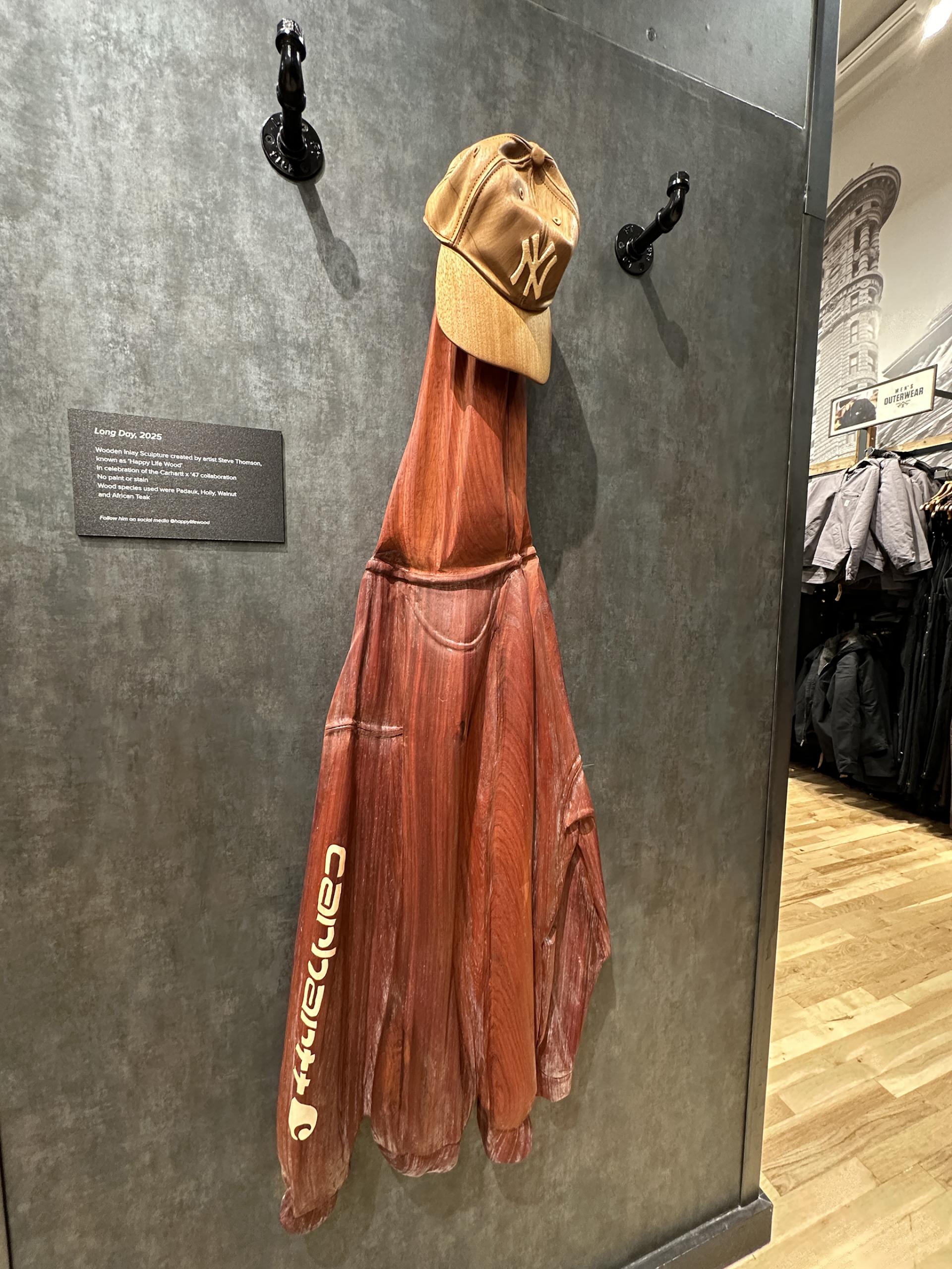 A handcrafted wooden inlay sculpture (“Long Day, 2025”) was commissioned for this store to celebrate Carhartt x ’47 collaboration. Designed to hang on a column as if it was a real life-size hoodie/cap hung after a long day at work, it connects deeply with customers as a visual element while reflecting a nostalgic moment in time.