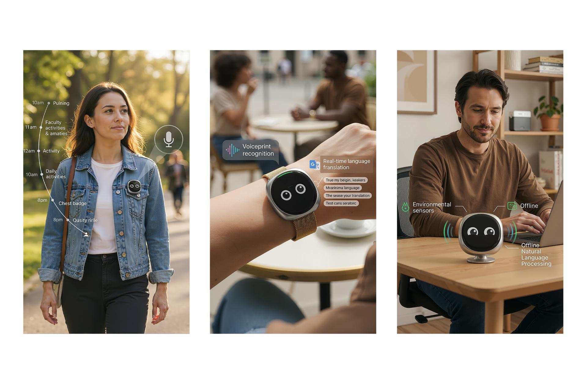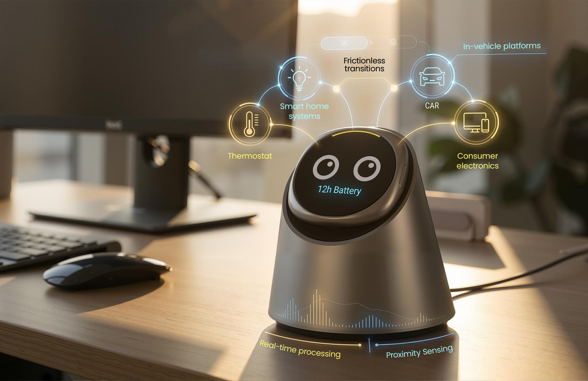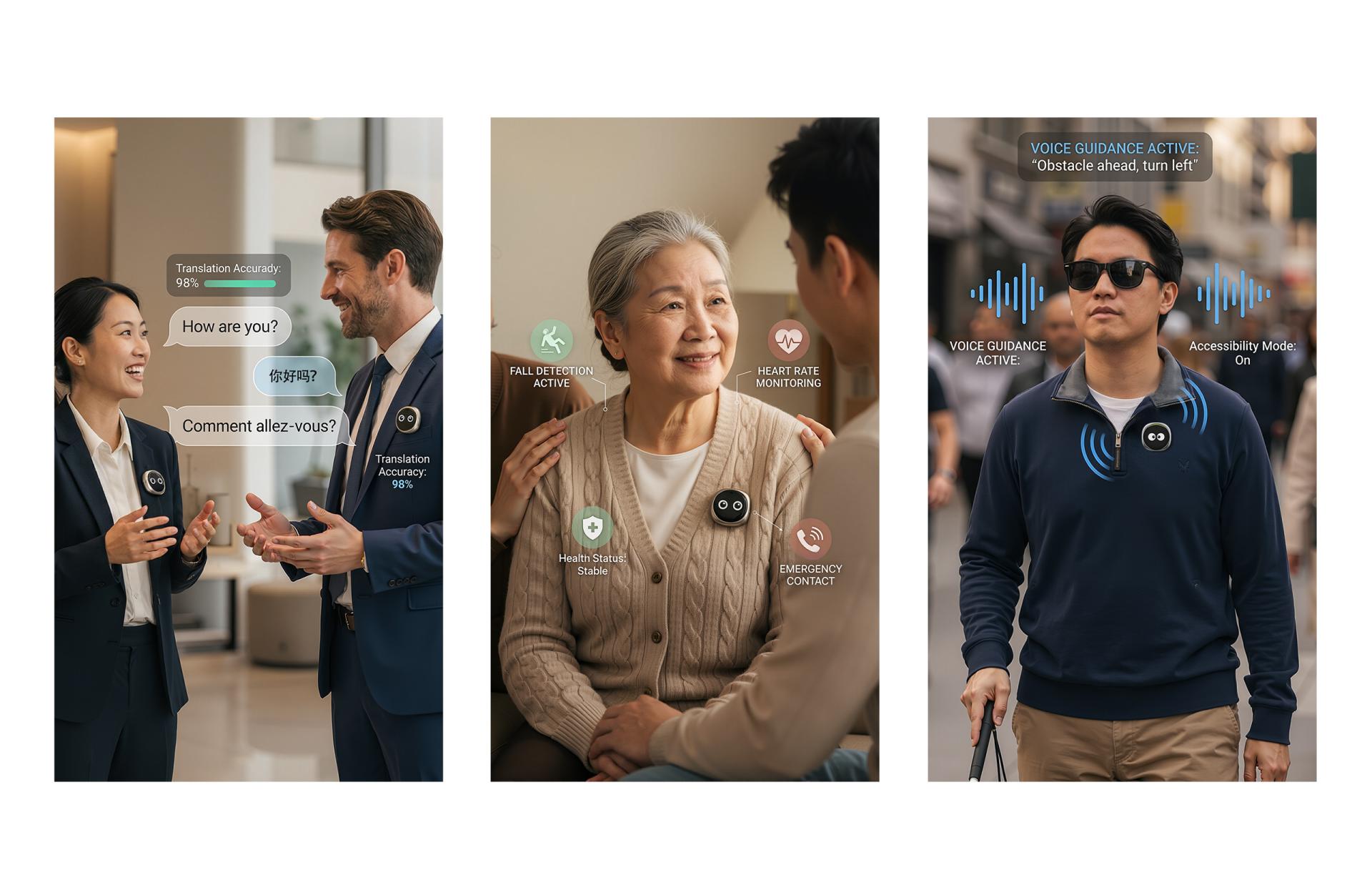 Aura is a physical AI companion that combines wearable and modular design, integrating perception, interaction, and contextual understanding. It employs a directional microphone array with adaptive beamforming, together with voiceprint recognition and offline natural language processing, to deliver high-accuracy voice interaction, strong privacy protection, and reliable operation without network connectivity. Low-latency simultaneous translation enables real-time cross-language communication. Through the coordinated fusion of environmental and biometric sensors, Aura evolves from passive command response to active intent understanding. By lowering the barrier to technology use and reducing reliance on screens and complex interfaces, Aura integrates into everyday life in a non-intrusive and sustainable manner, enhancing communication efficiency, user safety, and social inclusivity while fostering a more natural and healthy form of human–AI coexistence. Aura incorporates a directional microphone array combined with adaptive beamforming technology, effectively achieving rigorous background noise suppression and target vocal enhancement. An embedded voiceprint recognition engine paired with an offline Natural Language Processing (NLP) module guarantees high availability and data privacy, even in network-deprived environments. Addressing the complexities of cross-language interaction, the device features low-latency simultaneous interpretation algorithms, enabling millisecond-level language identification and bi-directional translation. Furthermore, the fusion of multi-modal environmental sensors (ambient light, proximity, temperature) endows the device with physical context awareness, facilitating an evolutionary leap from simple "command execution" to sophisticated "intent understanding." Through a distributed computing protocol, Aura seamlessly orchestrates smart home systems, in-vehicle platforms, and other consumer electronics, enabling cross-device task continuity and frictionless transitions. An optimized energy management architecture, combined with low-power sensors and high-density battery technology, delivers extended standby performance. Its environmental adaptability extends beyond physical durability to real-time processing of ambient data—such as light conditions and proximity—allowing the interface to automatically adjust interaction modes to suit different usage contexts. The industrial design follows a minimalist aesthetic, emphasizing the unity of geometric purity and material expression. The body is constructed from high-strength, lightweight, and environmentally responsible composite materials, balancing durability with a refined, warm tactile quality.