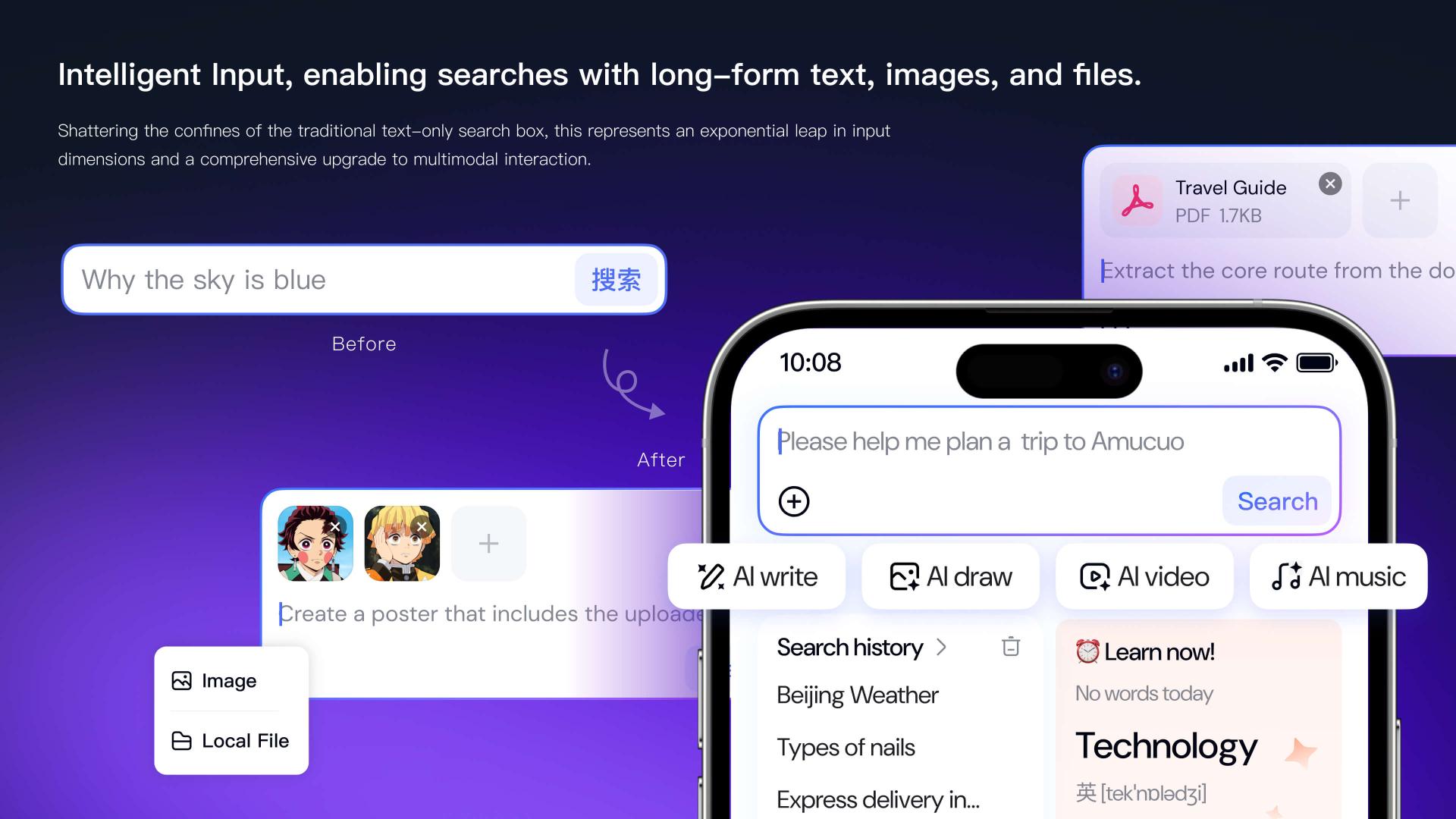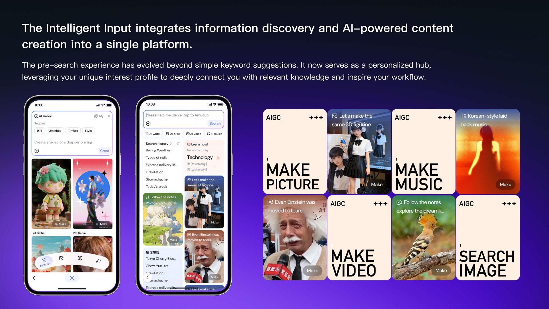 The integration of AI into search has dramatically enhanced retrieval efficiency and sparked user creativity. Concurrently, multimodal search is emerging as a new paradigm for user interaction. Baidu Search is actively embracing this AI-driven transformation, with the vision to evolve from a simple search tool into an intuitive life companion. Our goal is to ensure that everyone has equitable, seamless, and efficient access to information. The traditional search box has been upgraded to an “Intelligent Input,” enabling searches with long-form text, images, and files. Shattering the confines of the traditional text-only search box, this represents an exponential leap in input dimensions and a comprehensive upgrade to multimodal interaction. The pre-search experience has evolved beyond simple keyword suggestions. It now serves as a personalized hub, leveraging your unique interest profile to deeply connect you with relevant knowledge and inspire your creative workflow. Creative results are presented instantly and linked directly to services, completing a seamless, end-to-end consumer journey. Continuously expanding the frontiers of search, evolving from a tool for information retrieval to a platform for task completion. Search results are now intelligently organized into clear answers, enriched with both text and visuals to deliver an exponential boost in efficiency. The AI achieves this by intelligently organizing content through a three-step process: it first synthesizes vast information, then restructures it logically, and finally presents it in diverse, structured formats directly to the user. A real-time, interactive framework redefines the search experience, leveraging search's inherent advantage in verifiable source retrieval. This system intelligently orchestrates content from across the web—including videos and articles—semantically organizing and structuring the information for immediate, coherent presentation. By harnessing the power of AIGC, it delivers on-demand, creative content that is deeply relevant to the user's real-world context. This transforms search into more than just an answer engine; it becomes a space for discovery where inspiration can flourish organically. MR experiences introduce a new paradigm of intelligent interaction by seamlessly blending the physical and digital worlds. By breaking down the barriers between online and offline, this real-time engagement creates a more emotionally resonant and novel experience for the user.