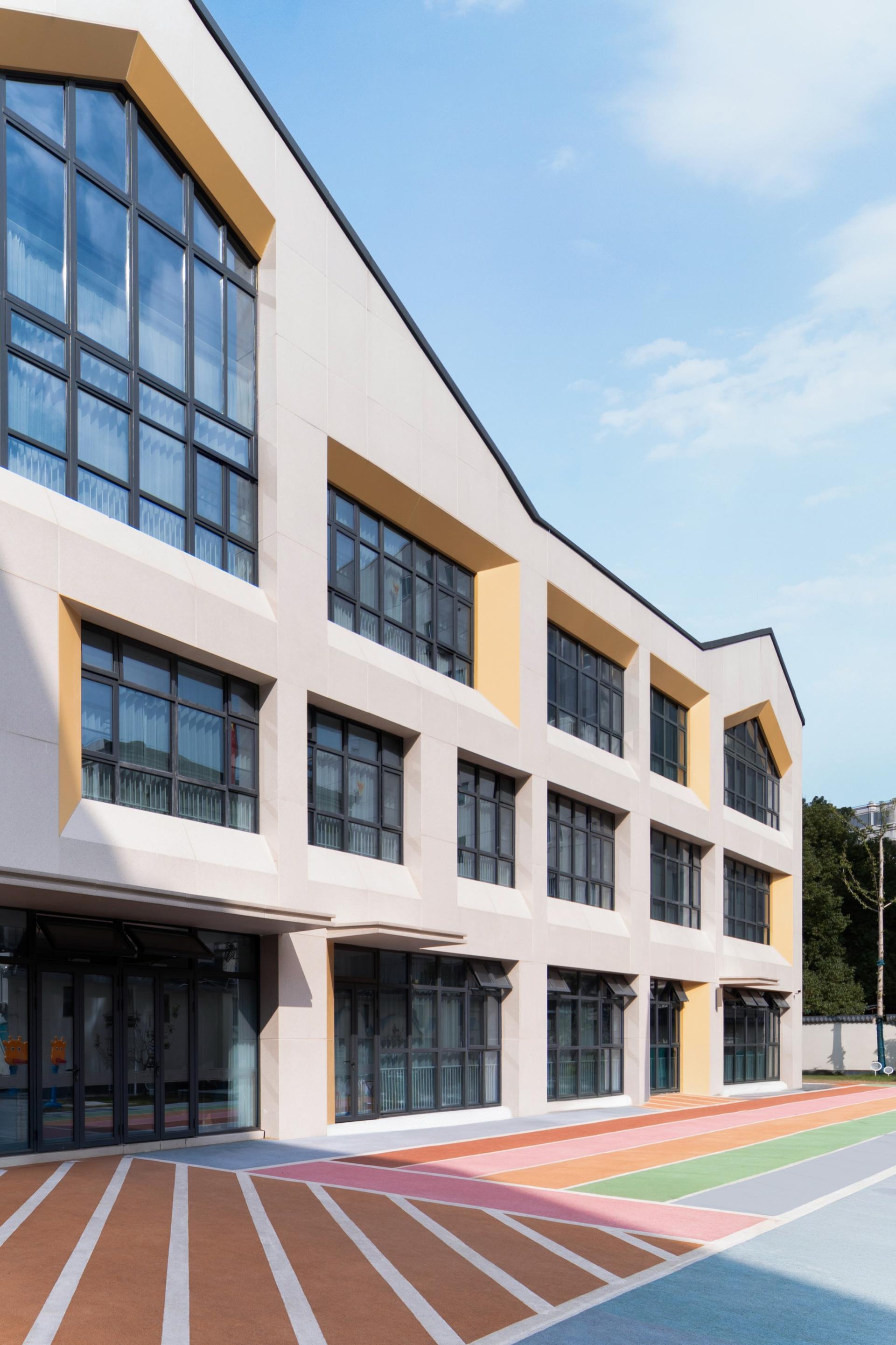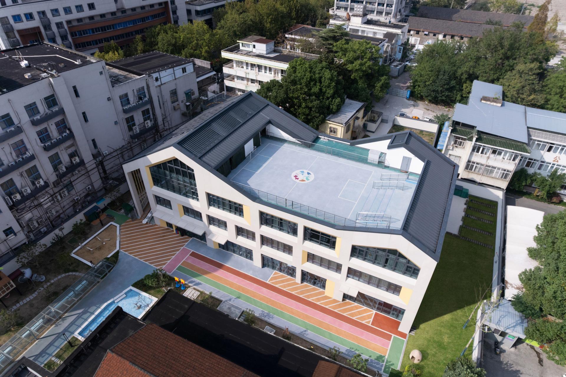 The updated building features a light-toned base combined with slanted window forms, through which the sloping roof imagery of traditional Jiangnan architecture is subtly echoed. A three-dimensional spatial system comprising a rooftop activity field, ground-level colored zones, and grand staircases and corridors tackles the site limitations. This affords children the opportunity to traverse the roof, maneuver the staircases, and navigate the corridors, thereby satiating their inquisitive nature. The softly designed building interface also blends in with the surrounding old residential neighborhoods, creating a link between the old and new urban environments.