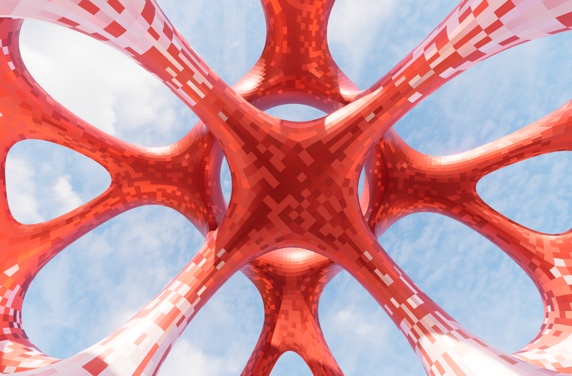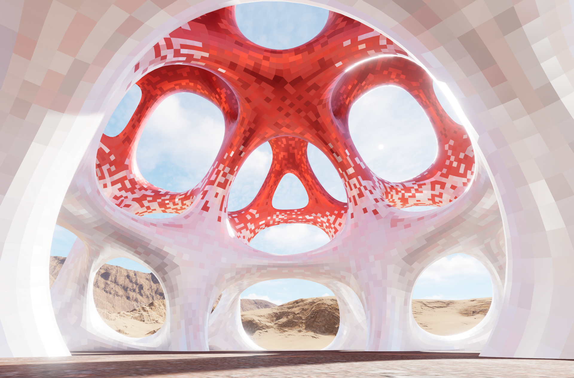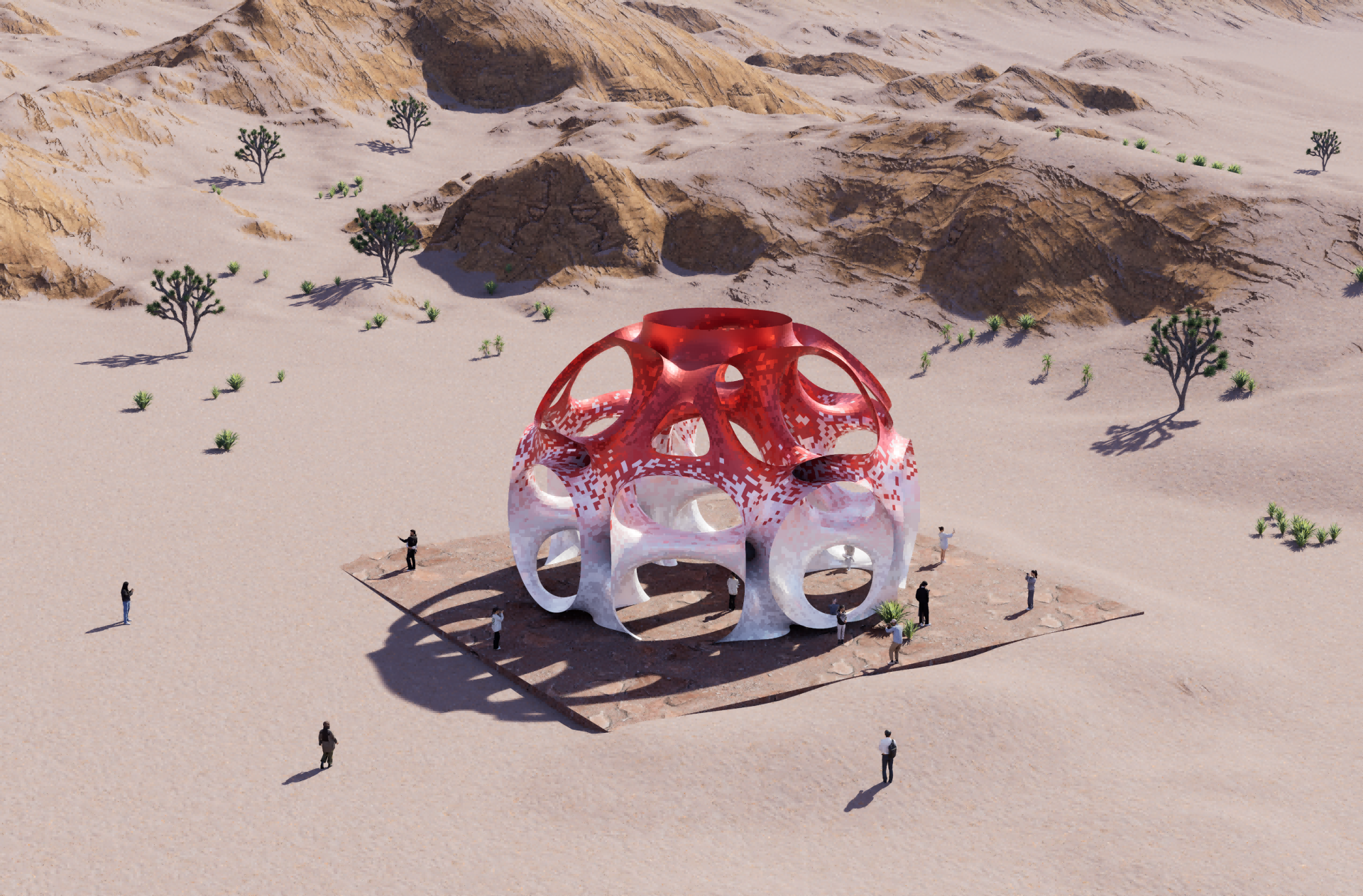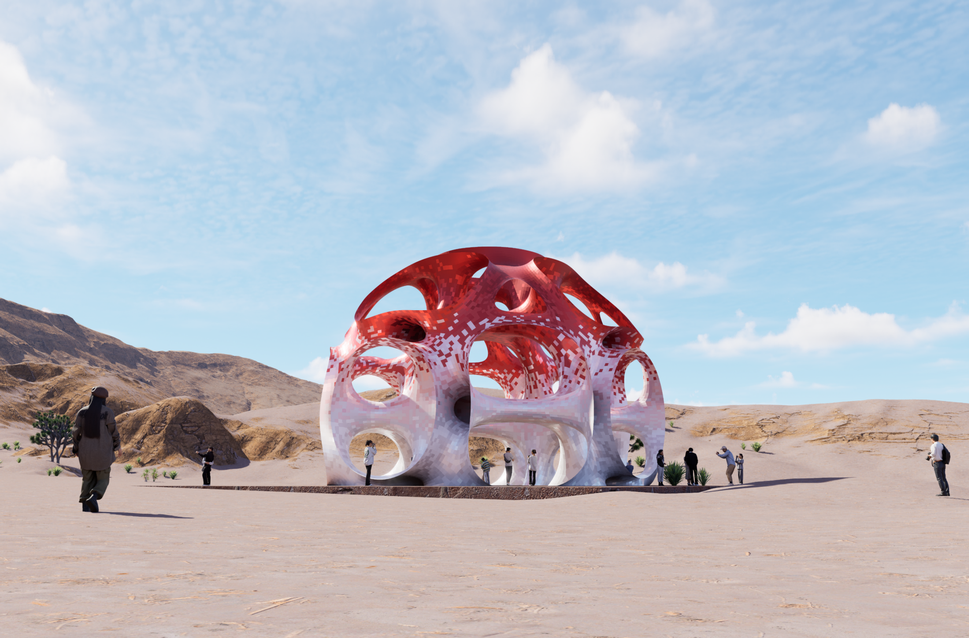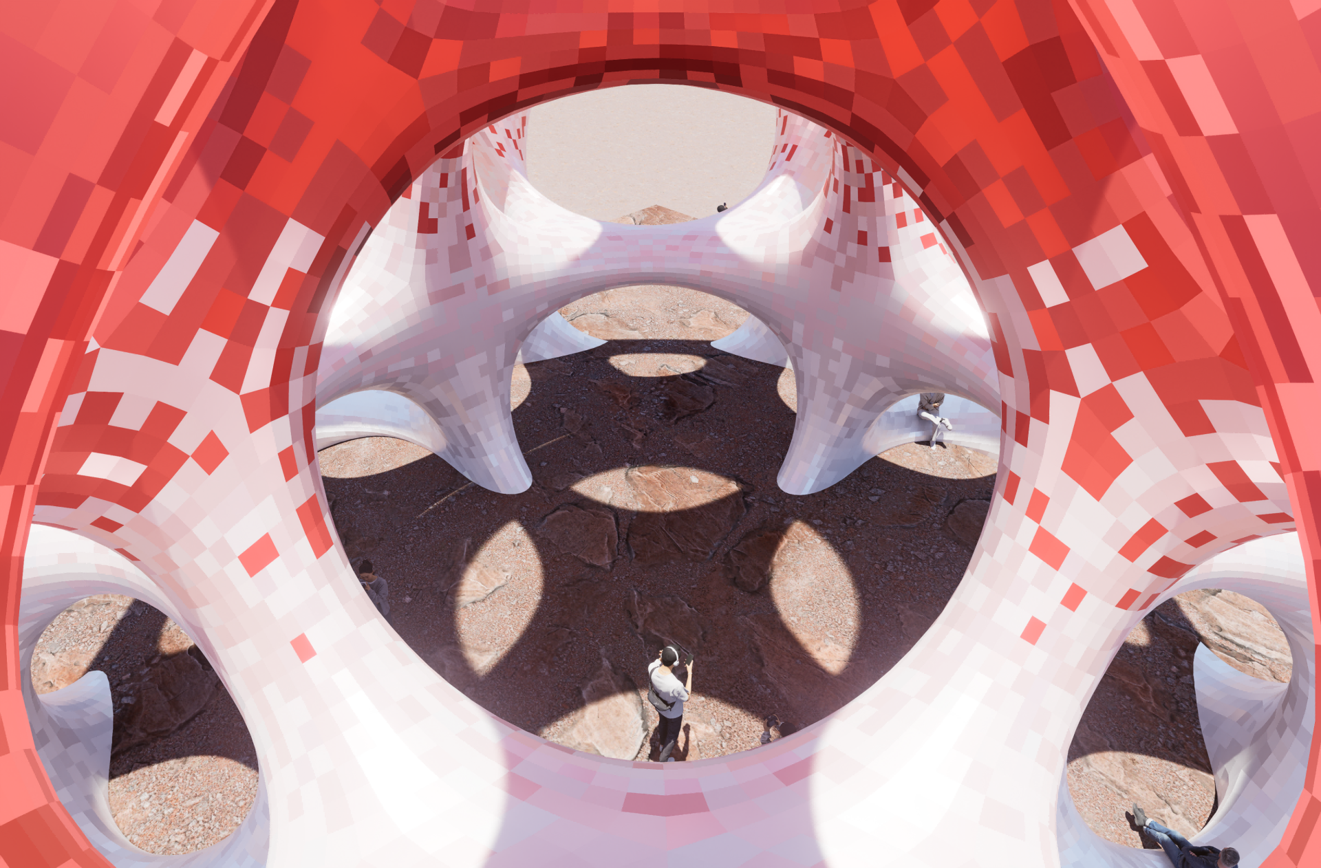 The project is located in the Ghost City scenic area of Karamay, Xinjiang, China. The core concept of this installation is "Gobi Symbiosis", anchoring on the site's genetic elements of "Yadan landform + wilderness atmosphere" to create a public landmark that combines artistic tension and local characteristics. The design adopts a parametric dome structure, with a red-and-white gradient skin that integrates the reddish-brown texture of the Yadan rock hills and the futuristic feel of digital aesthetics. The top part is red, echoing the geological background of the Gobi Danxia, gradually transitioning downwards to the lighter white of the Yadan rock mass. The pixelated texture completes the transition between natural texture and artificial form. The transparent hollowed-out shape not only eliminates the heaviness of the large volume but also simulates the characteristic "wind-eroded perforations" of the Yadan landform. Natural light penetrates through the holes, creating flowing shadows inside, echoing the natural narrative of the Ghost City's "wind-eroded sculpting".