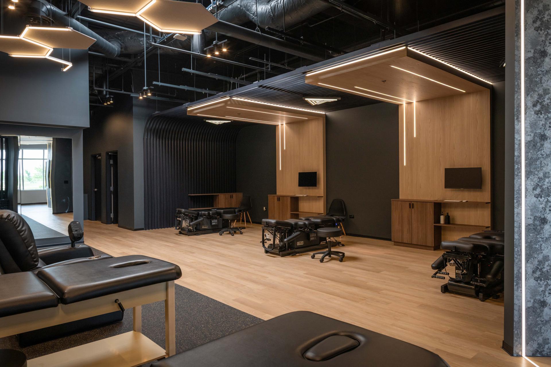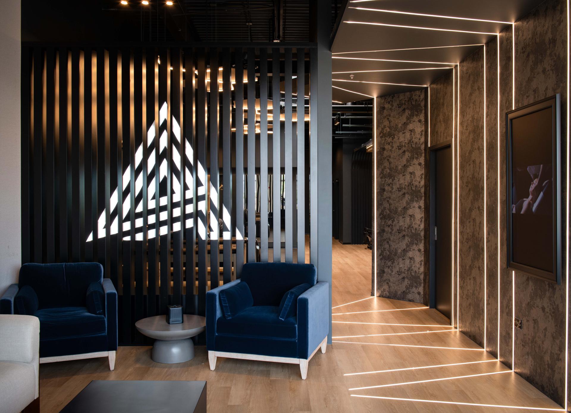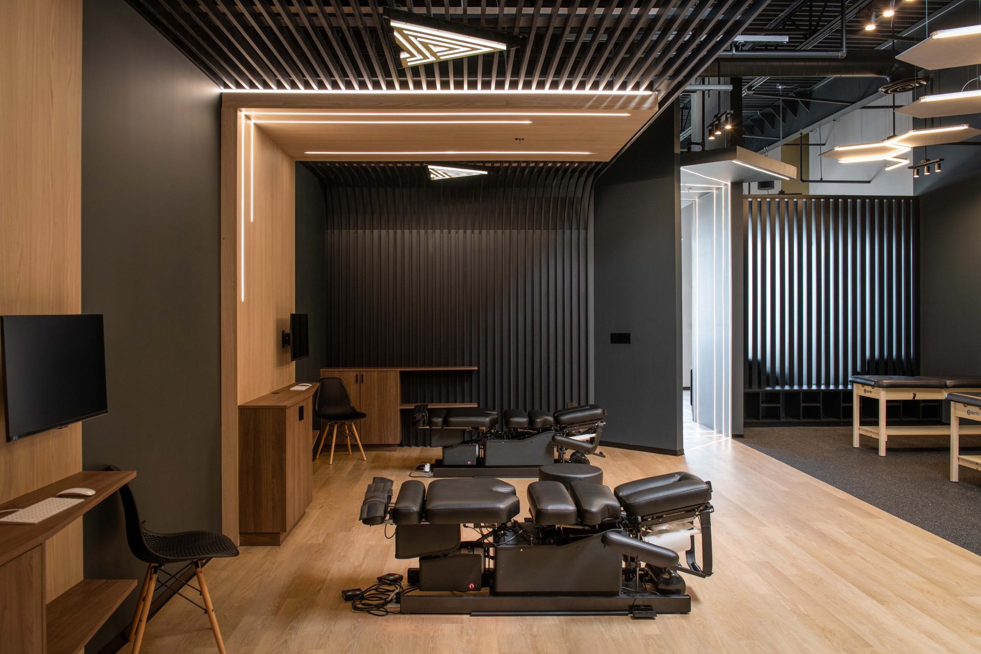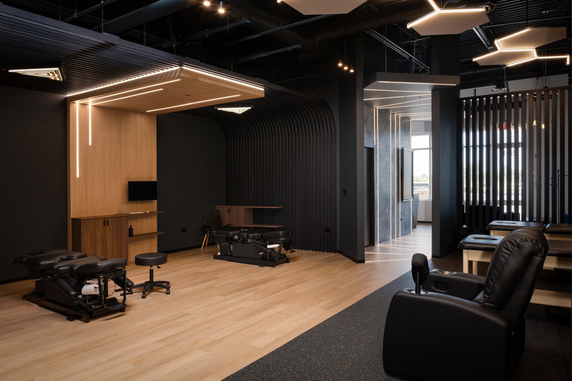 The design is structured around a sequence of transitions. Upon entry, the reception zone establishes a strong identity through custom millwork, sculptural geometries, and controlled contrasts between dark surfaces and warm wood tones. This space is not merely functional; it acts as a threshold between the external world and an interior environment dedicated to focus, recovery, and performance.