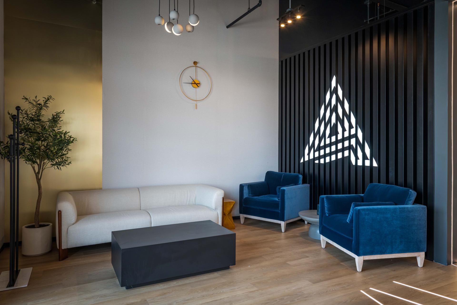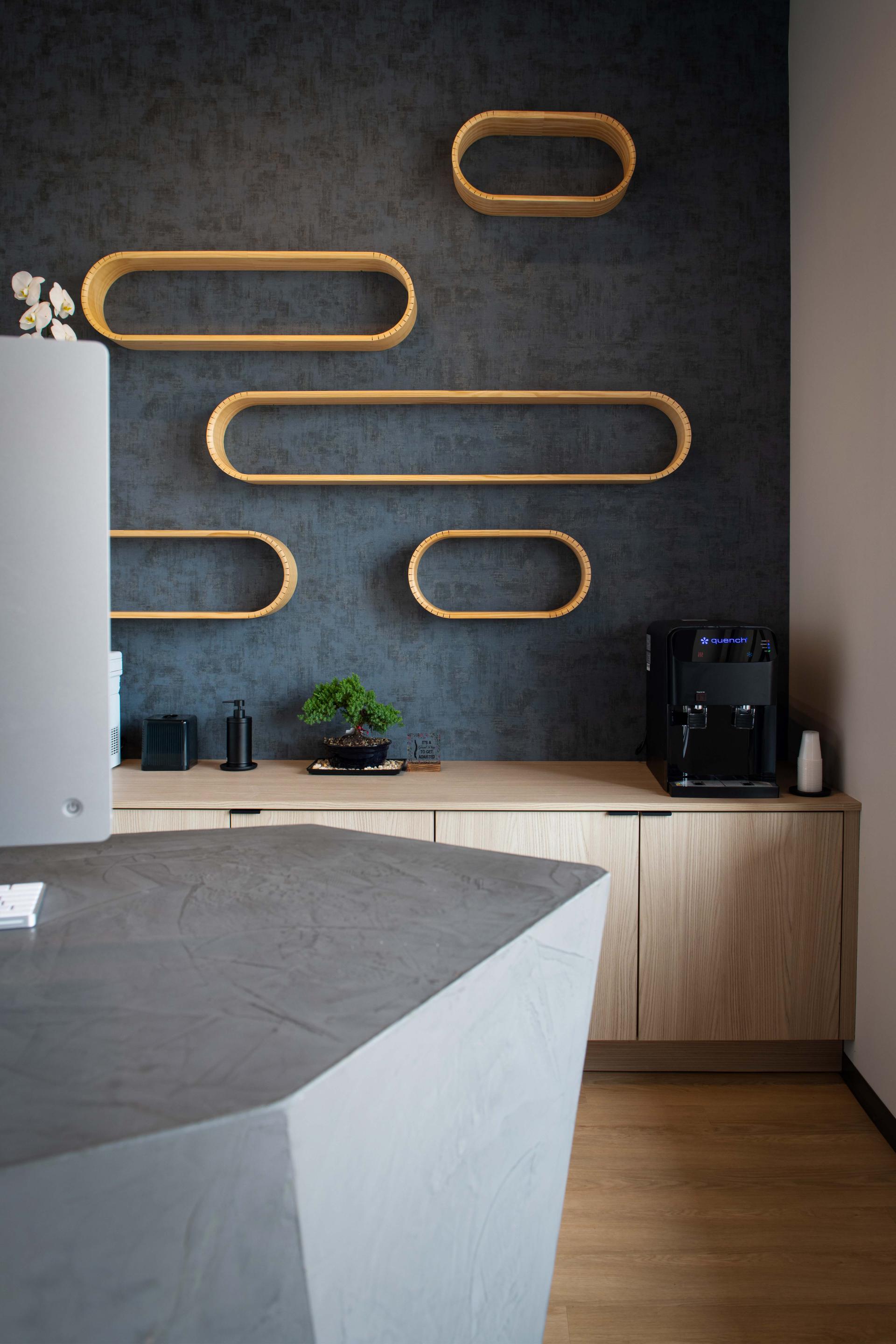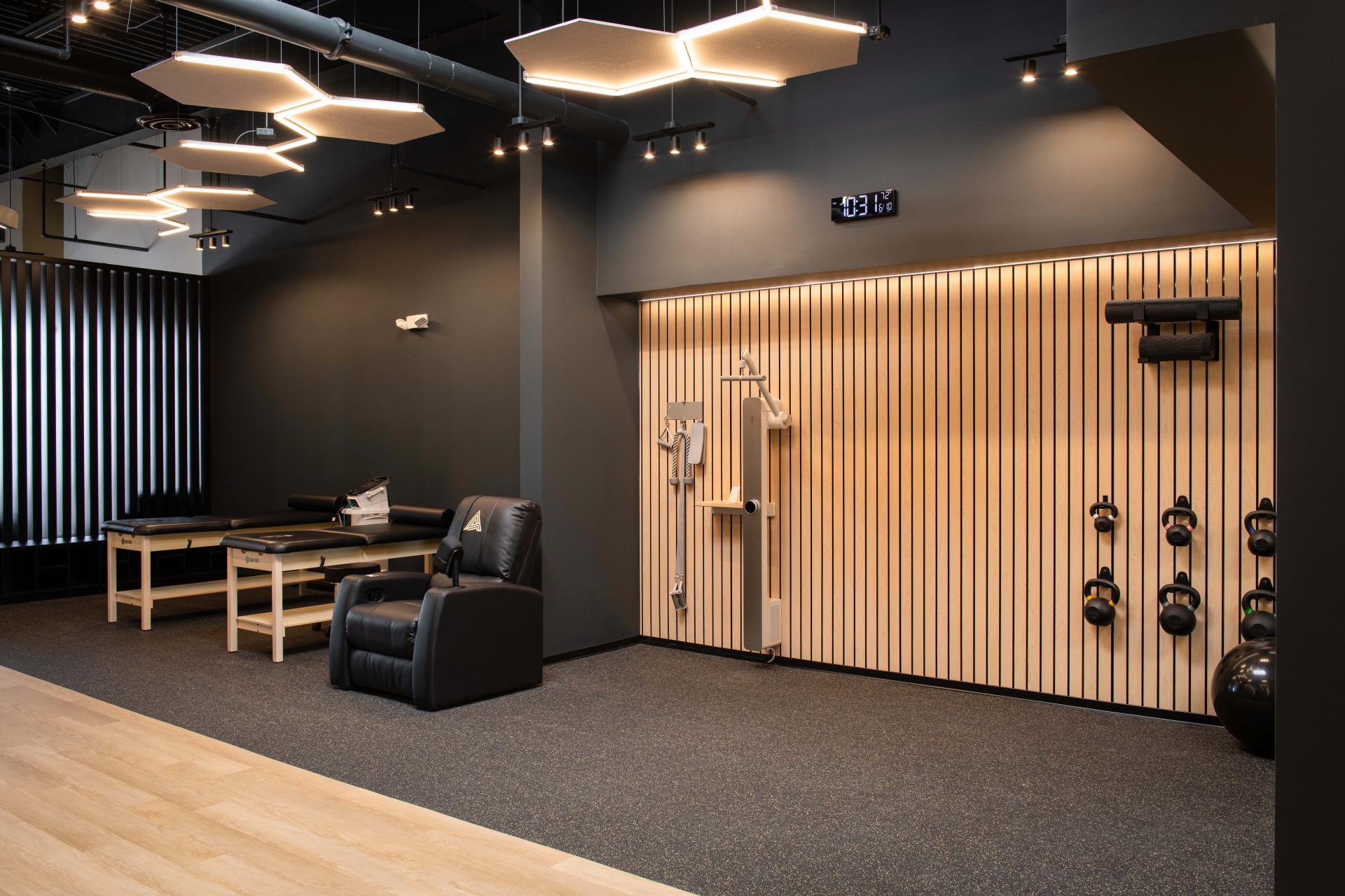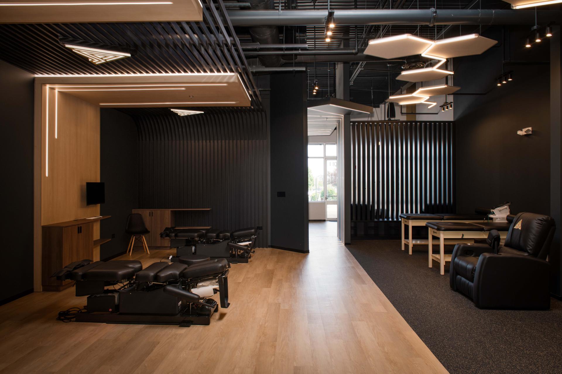 The design is structured around a sequence of transitions. Upon entry, the reception zone establishes a strong identity through custom millwork, sculptural geometries, and controlled contrasts between dark surfaces and warm wood tones. This space is not merely functional; it acts as a threshold between the external world and an interior environment dedicated to focus, recovery, and performance.