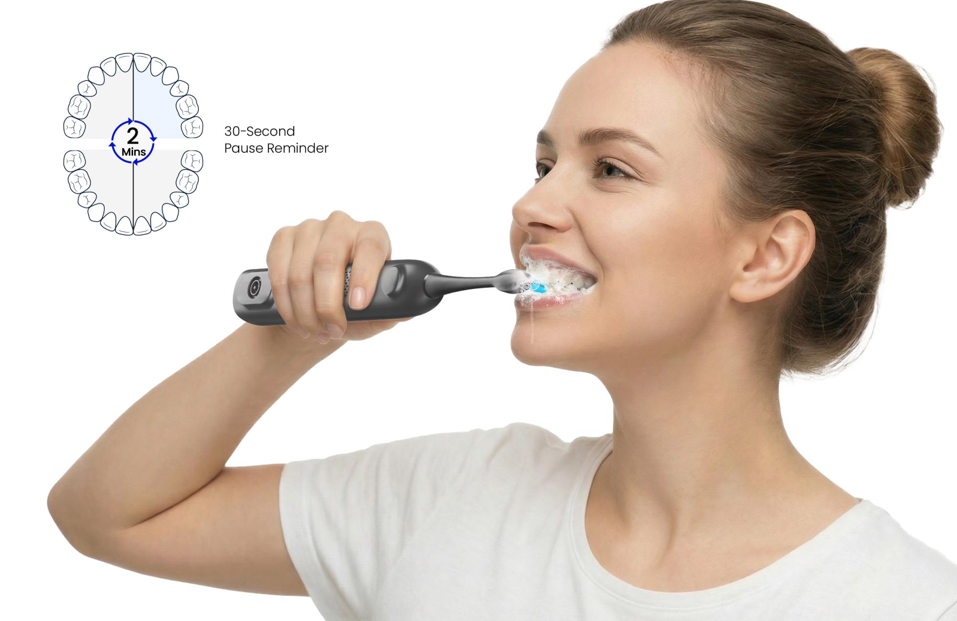 This product represents a deep fusion of an electric toothbrush and a water flosser, designed to address the core frustrations of modern users: incomplete cleaning, cumbersome routines, and cluttered countertops. Driven by a philosophy of efficient integration and professional care, it redefines the oral cleaning experience. By combining brushing and flossing capabilities, the device simultaneously cleans tooth surfaces and flushes interdental gaps in a single step. This transforms a fragmented routine into an efficient, scientific daily habit, providing an all-in-one oral care solution perfect for both home use and travel. The product features a sleek, minimalist unibody silhouette with clean, fluid lines. The primary dark grey finish, accented with technological blue details, conveys a sense of professionalism and innovation while blending naturally into diverse bathroom interiors. The modular magnetic water tank integrates seamlessly with the main body, ensuring the device remains compact and proportionally balanced even when the tank is detached. The ergonomic, ring-shaped handle contours perfectly to the hand, offering a secure grip and a visual lightness that reflects the refined aesthetic of a premium lifestyle product. Powered by a proprietary oscillating-sweeping system synchronized with a water jet, the device utilizes a 46° precision sweep combined with high-frequency vibrations. This effectively contours to tooth surfaces, approximating the professional efficacy of the Bass method. The wide-range adjustable water pressure penetrates deep between teeth and into gingival sulci, making it particularly friendly for users with braces, implants, or sensitive teeth. A smart 30-second zone timer synchronizes the brushing and flossing rhythm to help foster scientific care habits. The large-capacity water tank allows for a complete cleaning cycle without refilling. Remarkably, even with dual functions running simultaneously, noise is kept below 68dB. Complete with an IPX7 waterproof rating and long battery life, it achieves a perfect balance of efficiency, safety, and comfort.