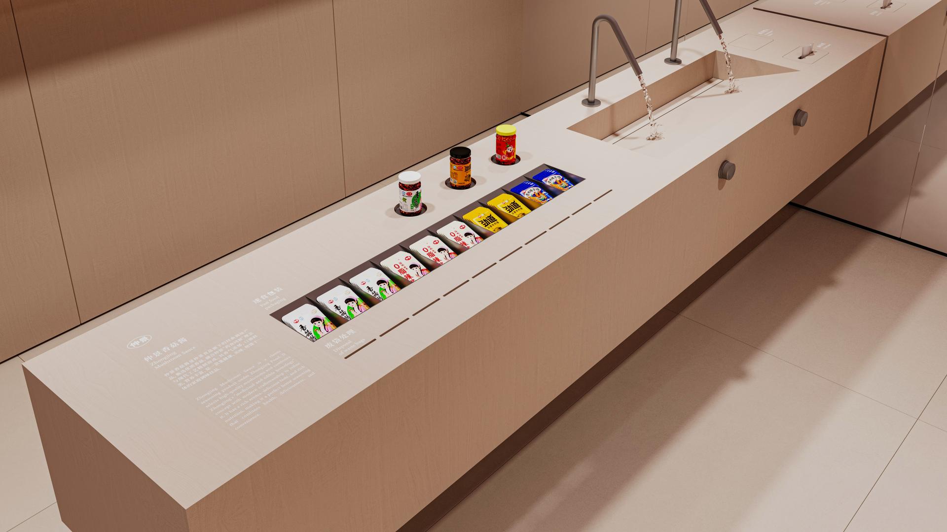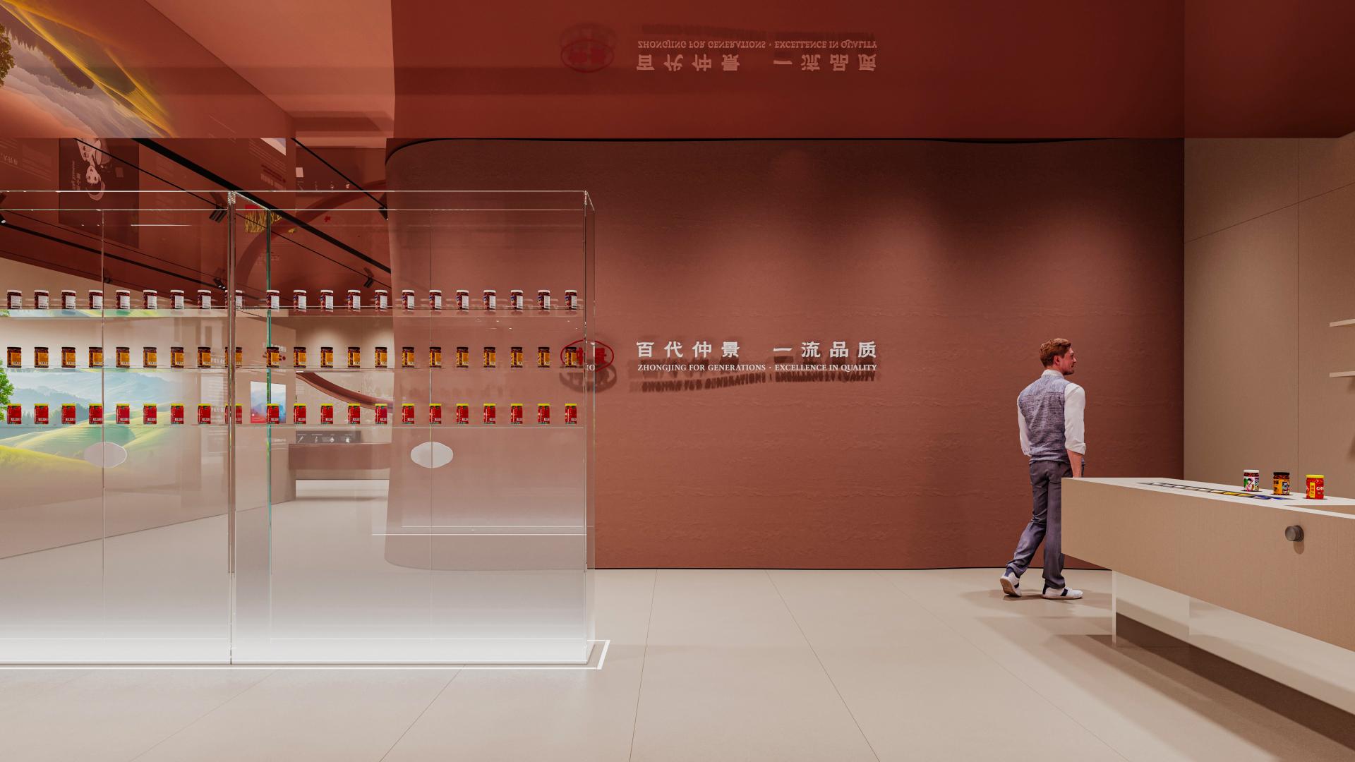 A one-way circulation route connects the Entrance Hall—History—Product Development—Quality Inspection—Corporate Honors—R&D Innovation—Corporate Culture—Social Responsibility—Product Display—and Finale, forming a progressive experience that moves from “ingredient origins” to “science-enabled production,” and from “quality control” to “brand value.” Visually and materially, the space is organized into two layers: below the horizon, tactile surfaces and textures emphasize authentic ingredients and the grounding of their origins; above the horizon, clean finishes and precise lighting present standardized systems and R&D capability.