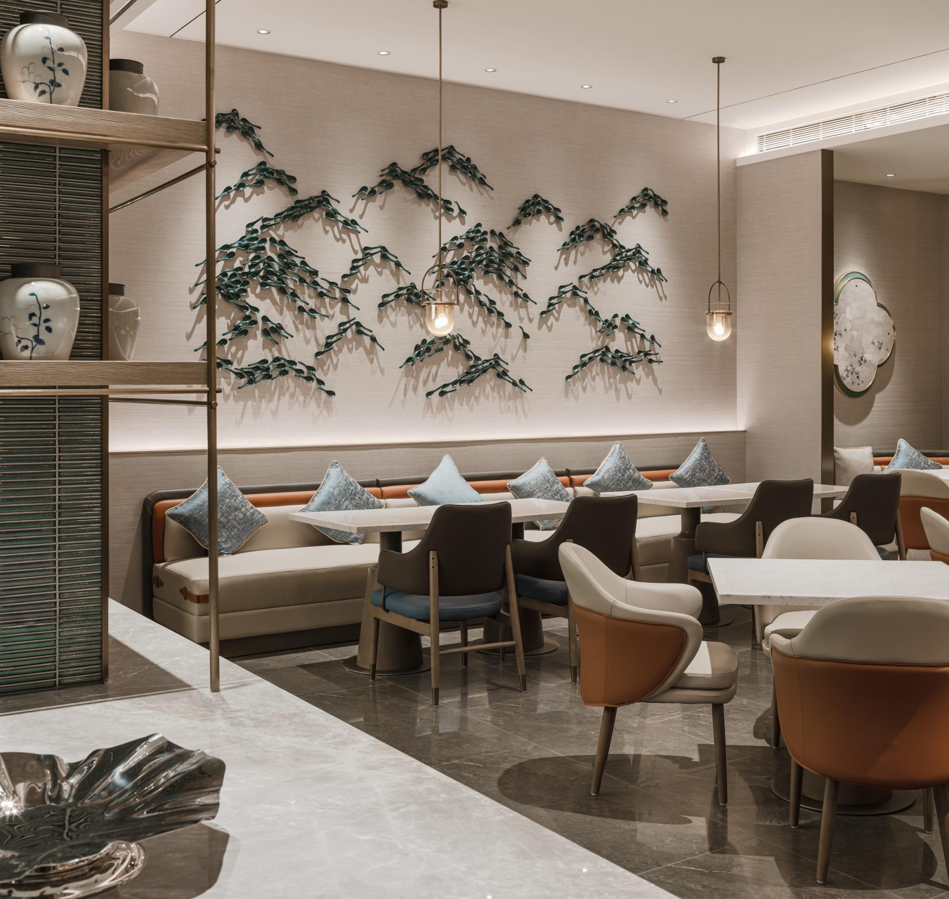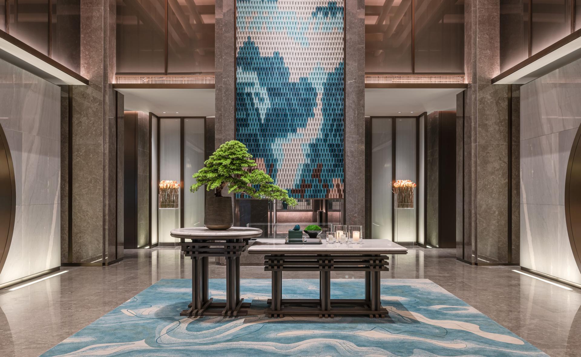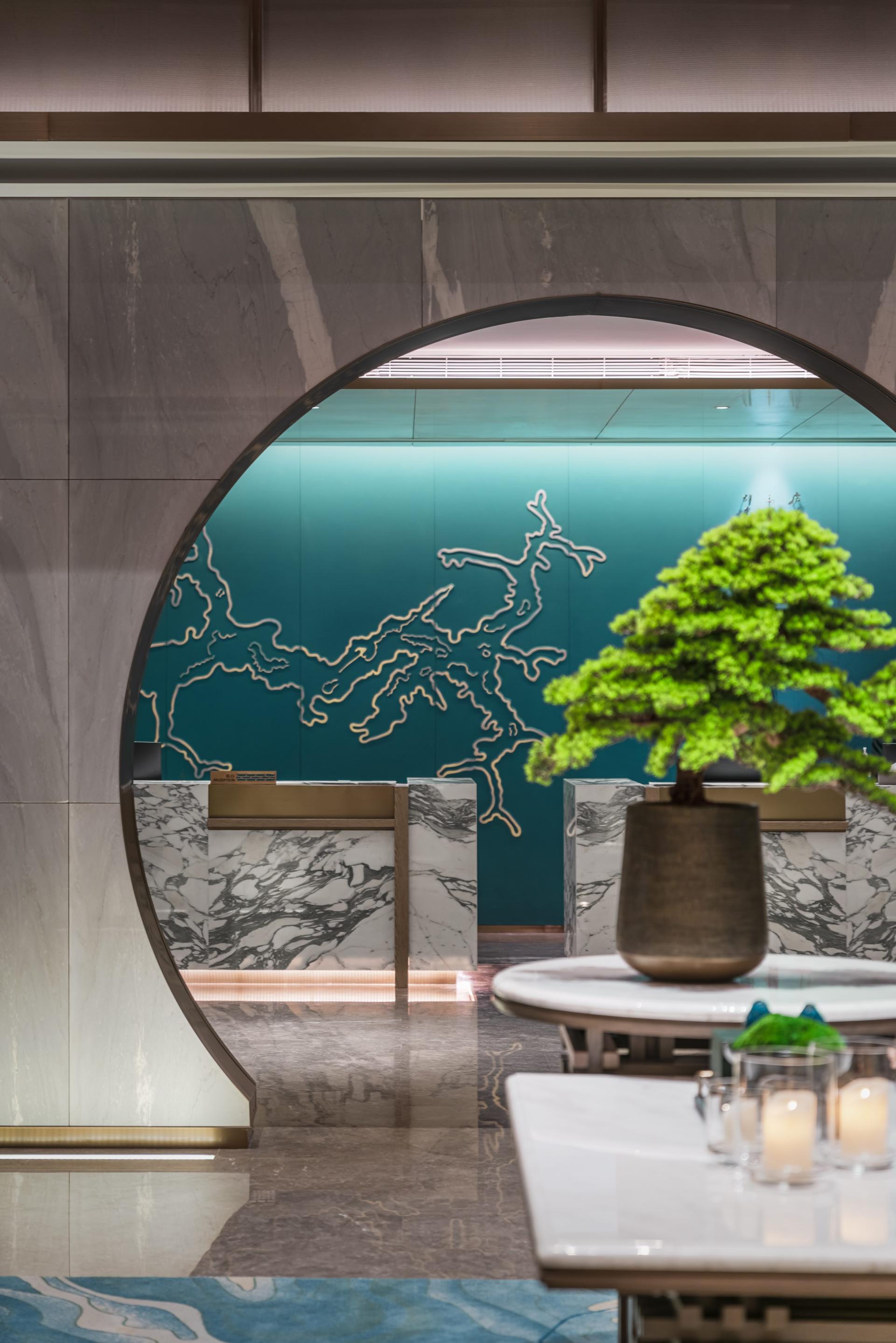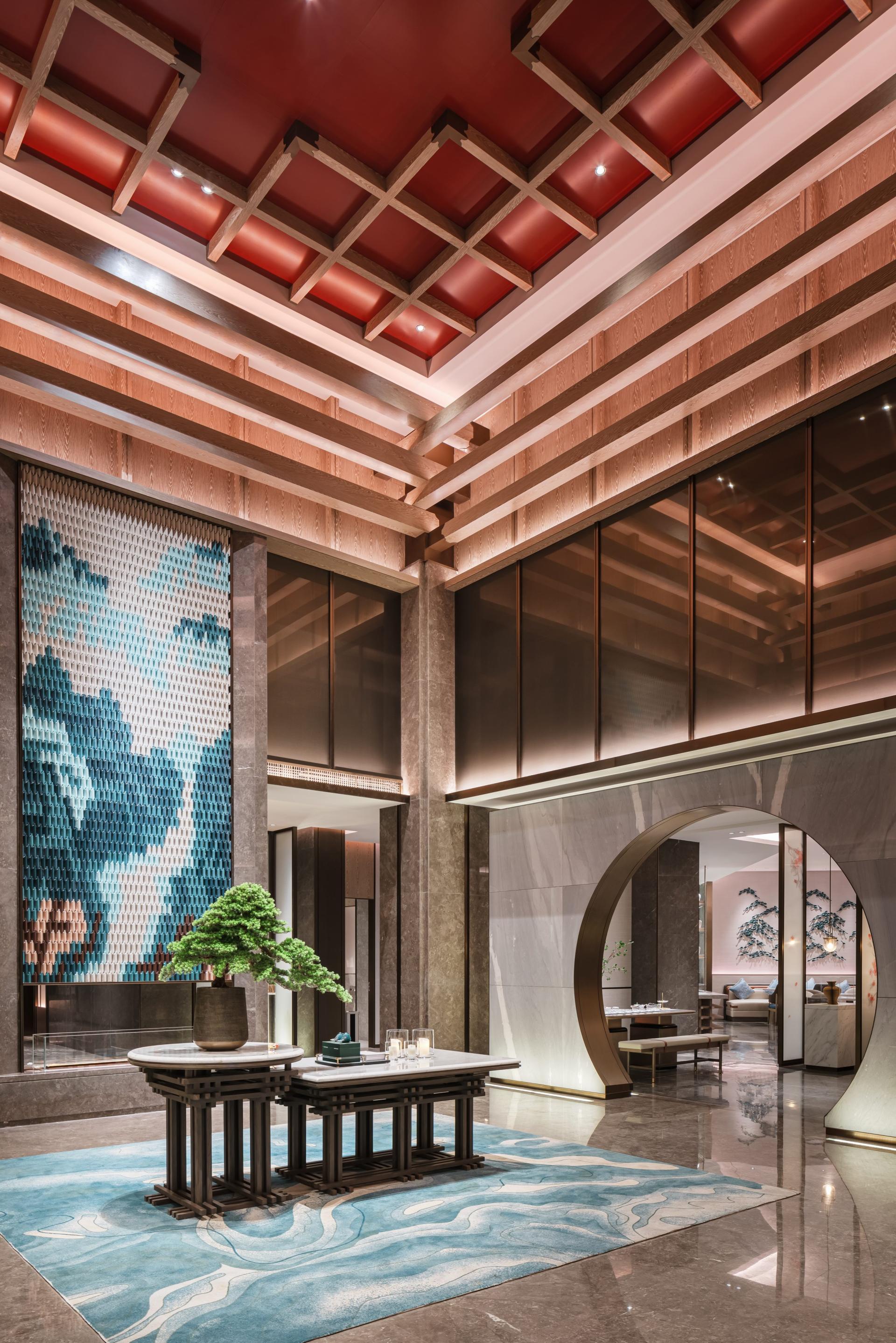 Ascending the steps from the entrance and passing through the bronze-colored metal-glass revolving door, the lobby space opens up dramatically. Looking back, the transparent glass curtain wall naturally frames the lake view, blurring the lines between city life and vacation time. The inclusion of elements like mountain waterfalls, garden views, and the replication of traditional residential aesthetics such as dougong brackets and moon gates in a blend of Eastern and Western styles represents a symbiosis between humanity and nature—a consistent design philosophy throughout the project.