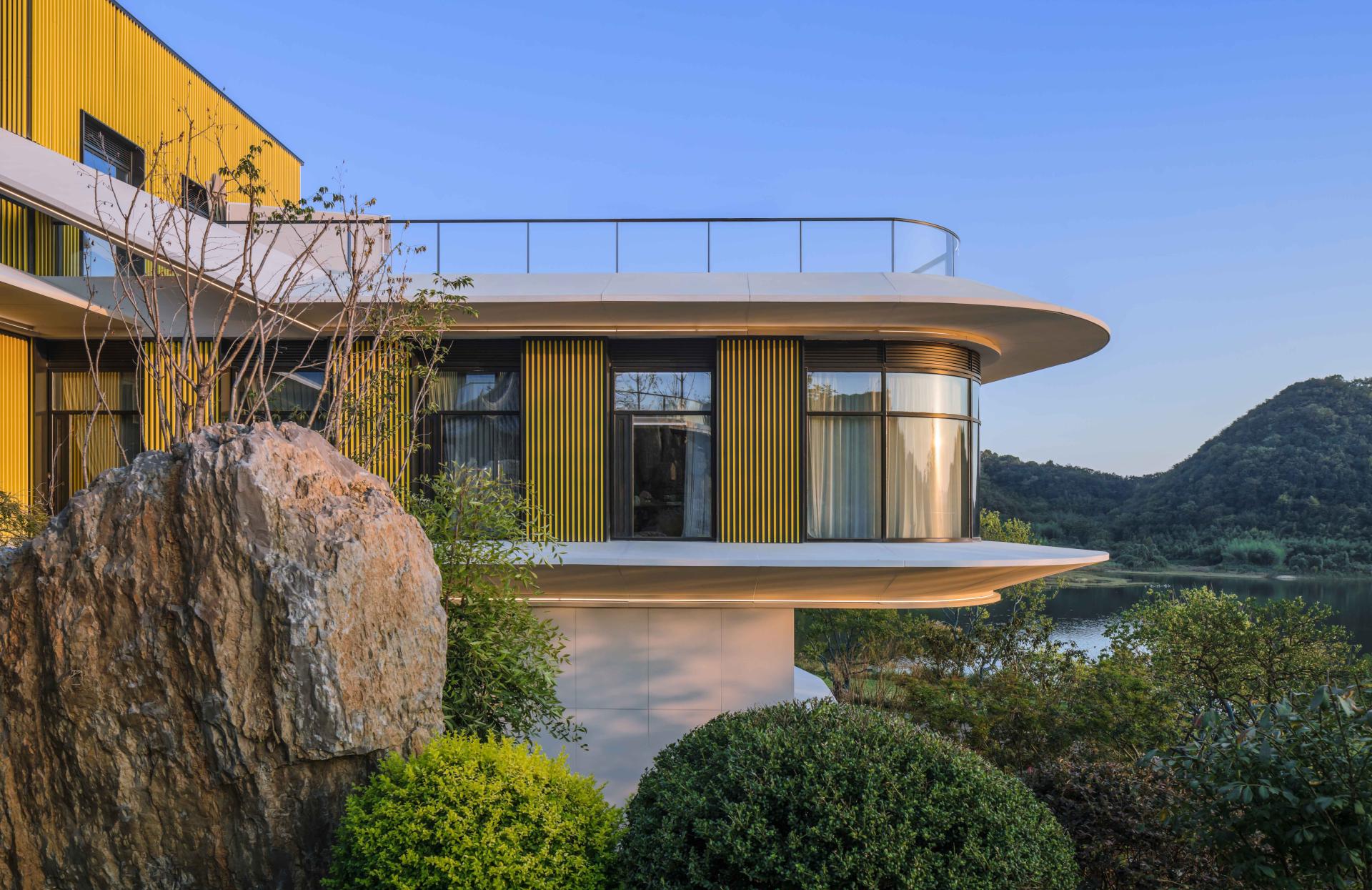 Horizontal linear elements dominate the facade, creating a dynamic, spiraling ascent. Functioning as sun-shading systems, these lines also metaphorically represent the company’s annual growth and ascending trajectory. The central core, wrapped in the brand’s signature bright yellow, serves as a visual focal point that reinforces corporate identity.