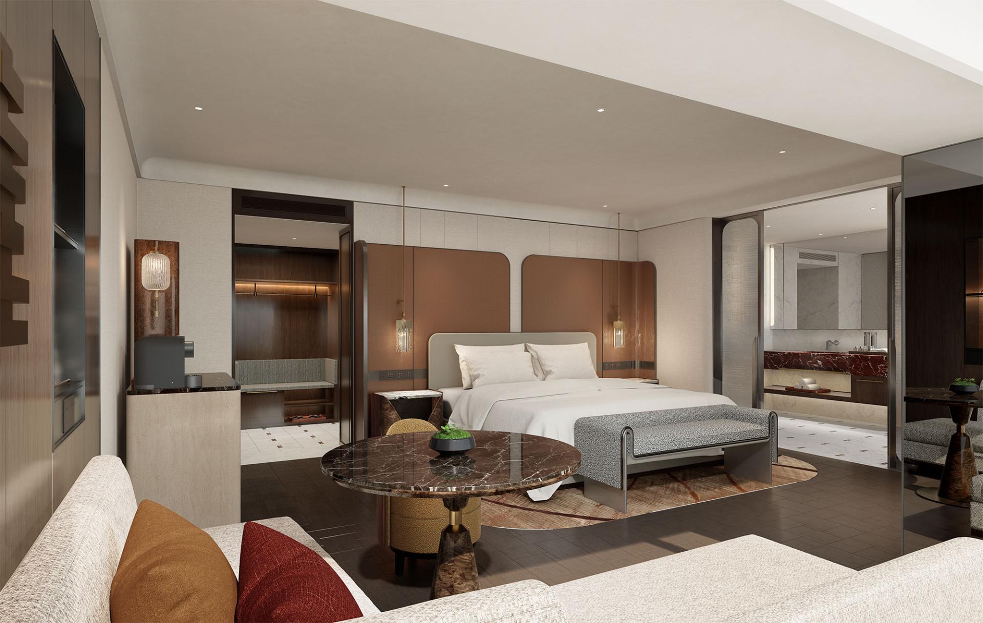 The original 800 compact rooms have been reconfigured into a diverse range of layouts—Fanghua, Shaoguang, Zanxing, Liujin, and Jinxiu—from cozy single rooms to multifunctional suites designed for both business and leisure. Circulation and spatial flow were restructured to align with the operational logic of contemporary hospitality.