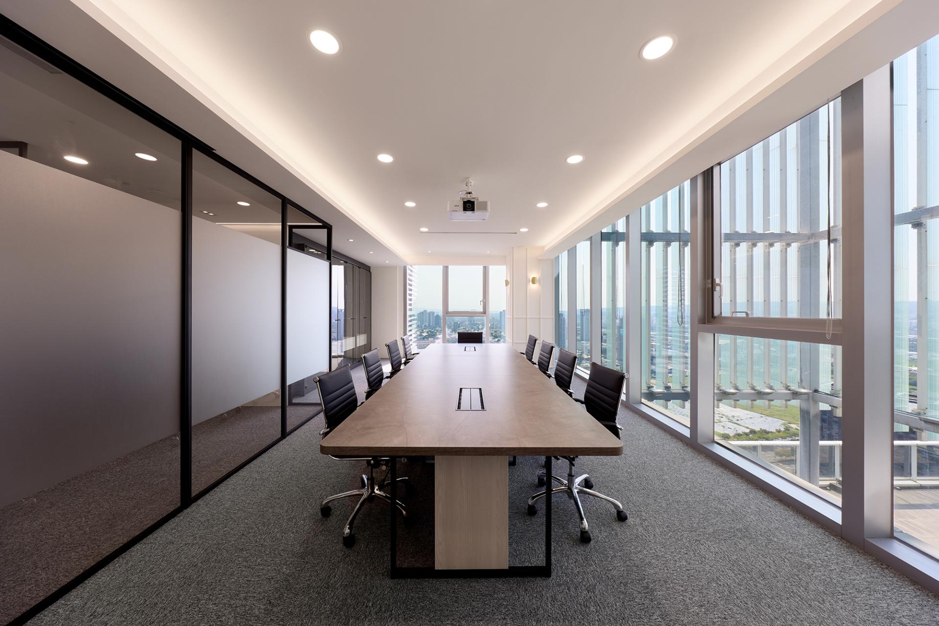 Transitioning into the open office space, one will encounter a sophisticated black, white, and gray color palette that instills a sense of professionalism. Here, black-framed glass and frosted glass partitions elegantly define various work zones while ensuring visual permeability, allowing natural light to flow freely throughout. Furthermore, linear pendant lights illuminate the space uniformly, enhancing operational efficiency and creating an inviting atmosphere for productivity.In stark contrast, the break room embraces a more subdued color palette, creating a cozy and inviting environment.