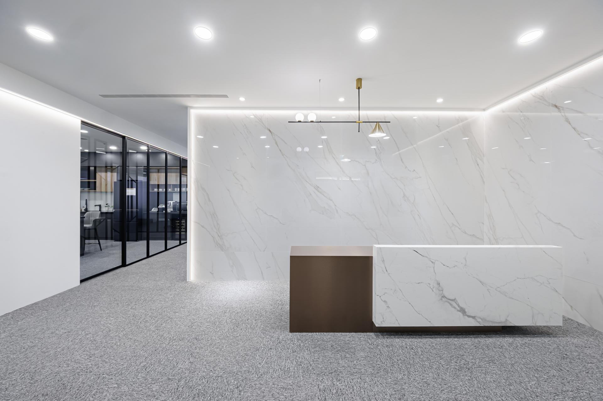 This project centers on the meticulous planning and design of an office space, strategically emphasizing both operational efficiency and long-term functionality. To achieve this, we establish a clear and coherent spatial order through deliberate configuration and precise proportion control. Embracing a modern minimalist aesthetic, the design features a pristine white base that is thoughtfully accented by striking black elements. Furthermore, high-gloss stone-effect panels and layered lighting are seamlessly integrated into the space, enhancing its sophistication while avoiding excessive ornamentation. By utilizing readily available building materials, this project not only fulfills practical needs but also creates a refined and understated workplace environment. In conclusion, the result is an office space that is both functional and visually appealing, designed to foster productivity and inspire creativity.
