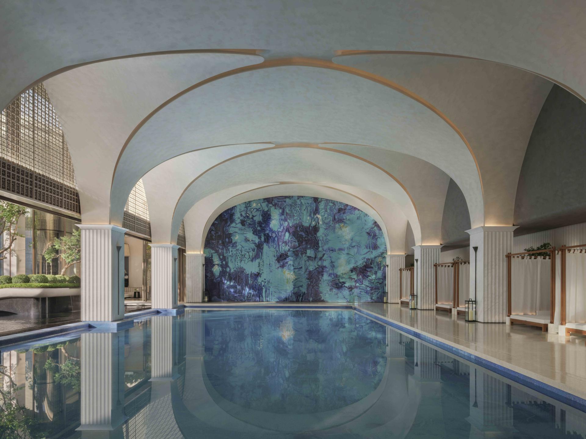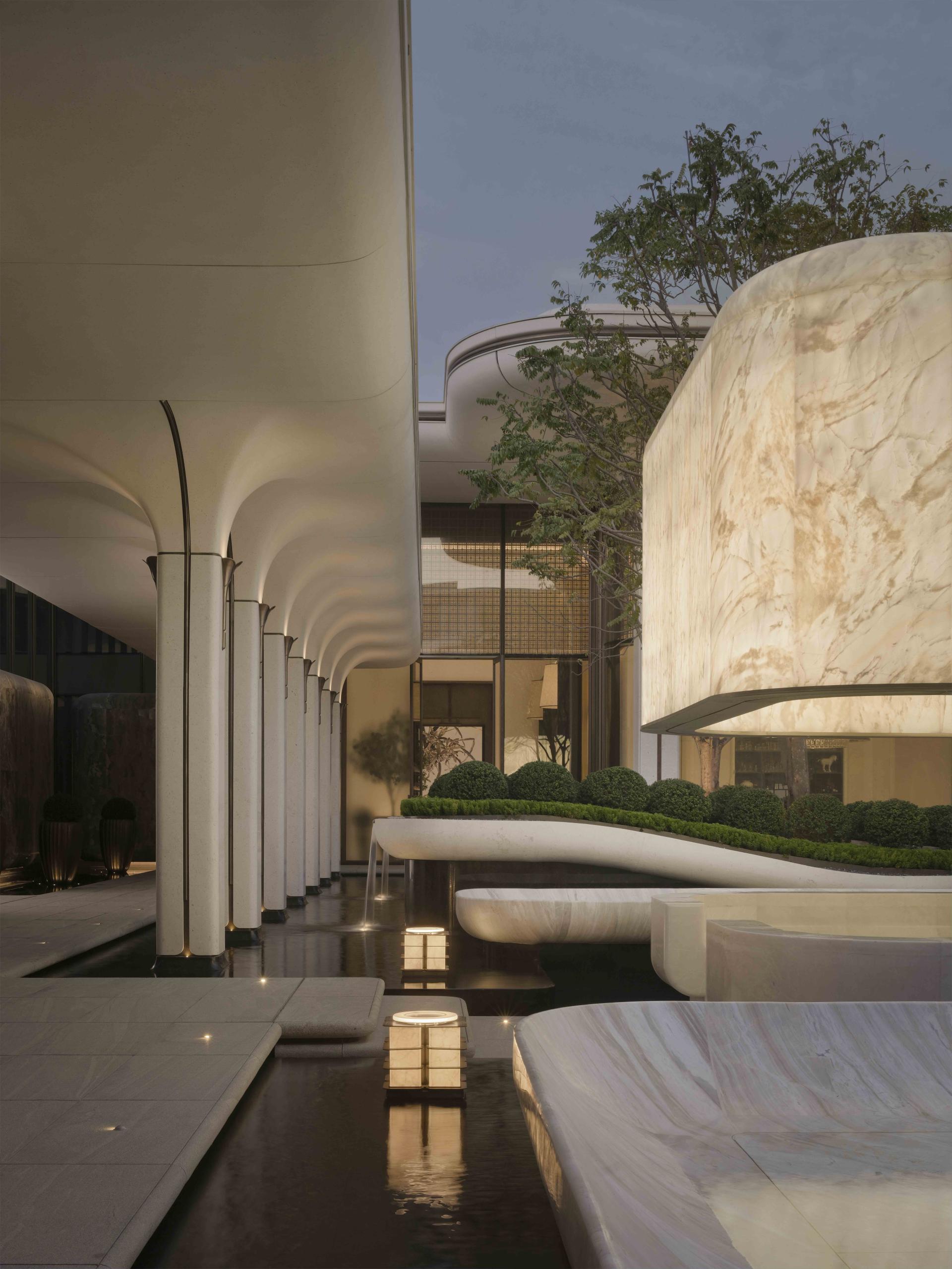 The central atrium, framed by daylight and water reflections, draws from the concept of “four waters returning to the hall,” symbolizing harmony and abundance. Abstracted fish-scale patterns, structural references to historic Xiguan residences, and a palette of warm neutrals collectively create a calm yet resonant atmosphere rooted in regional identity.
