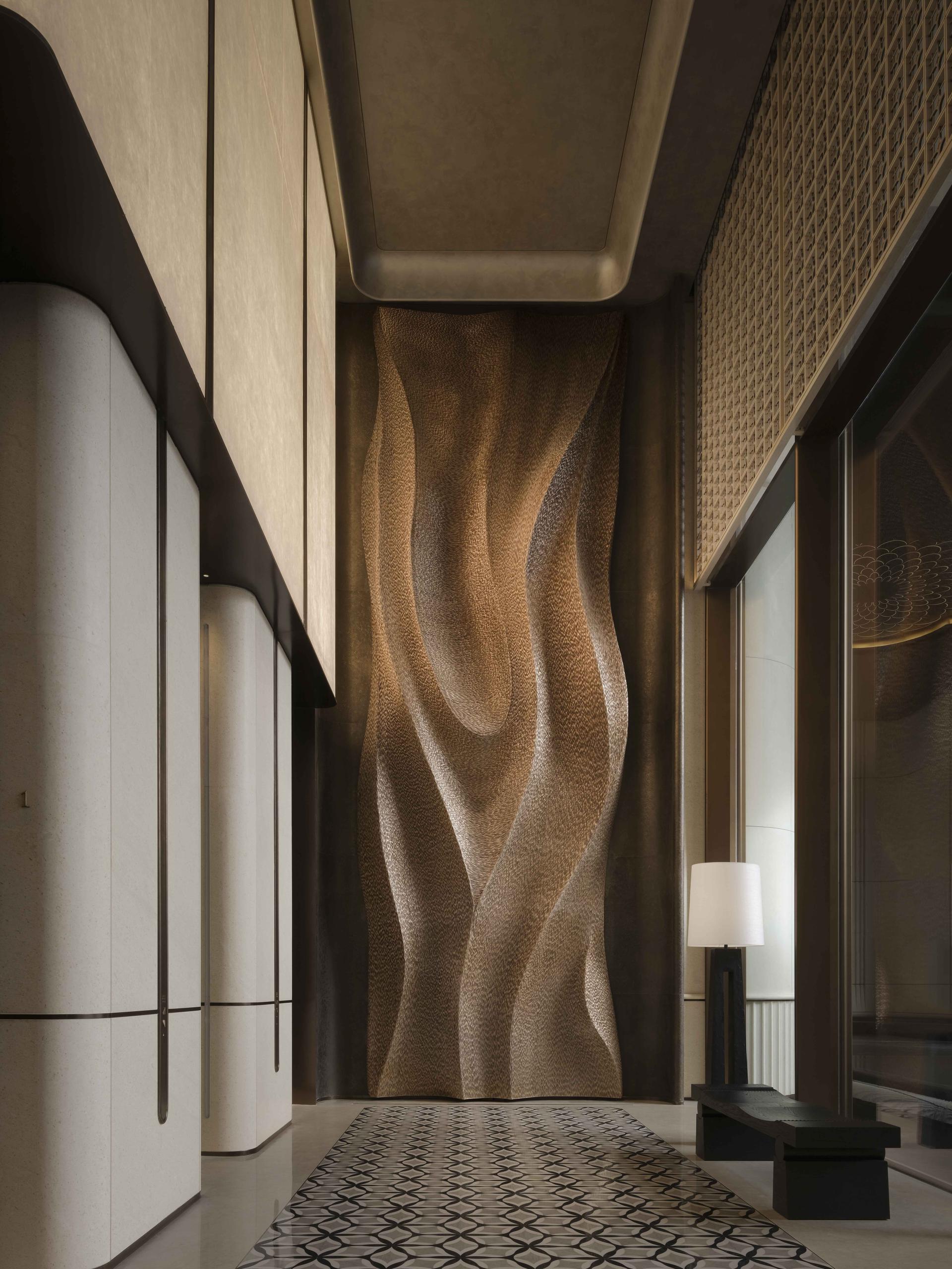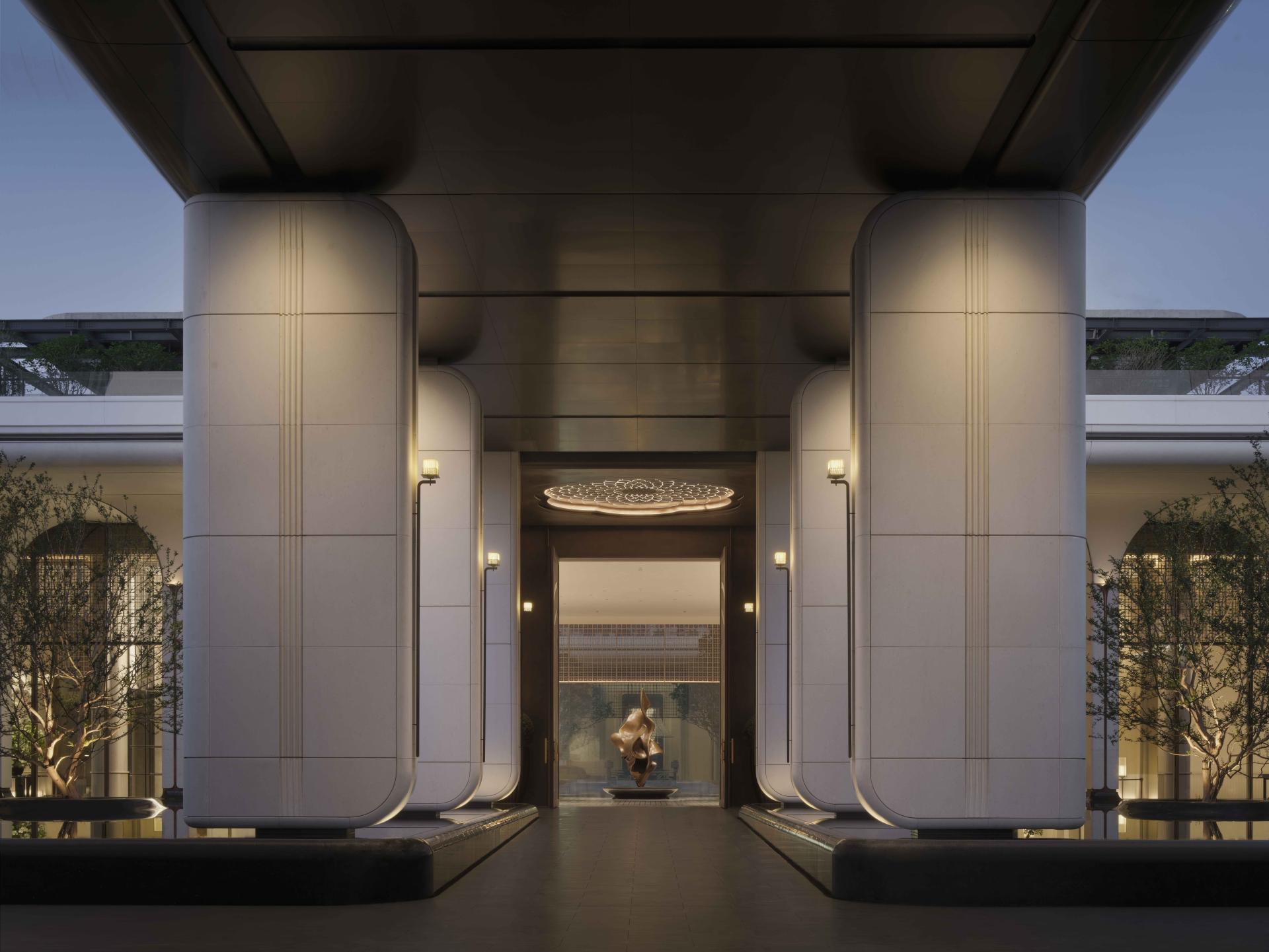 The spatial journey unfolds through a ceremonial sequence of three arrivals, each revealing a distinct realm. From sculpted stone screens inspired by river currents, to corridors adorned with auspicious motifs, and finally to monumental gilded bronze doors crafted by a national heritage master, the entrance establishes a dignified rhythm of progression and discovery.