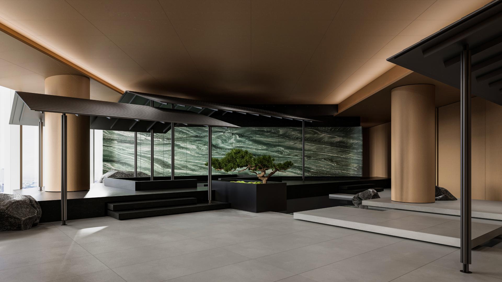 The spatial narrative originates from the Chairman’s childhood memories of his hometown, Ankang in Shaanxi Province, and is further informed by the compositional logic and color philosophy of the classical Chinese painting A Thousand Li of Rivers and Mountains.